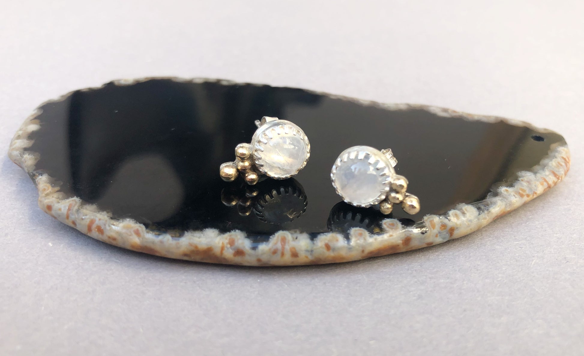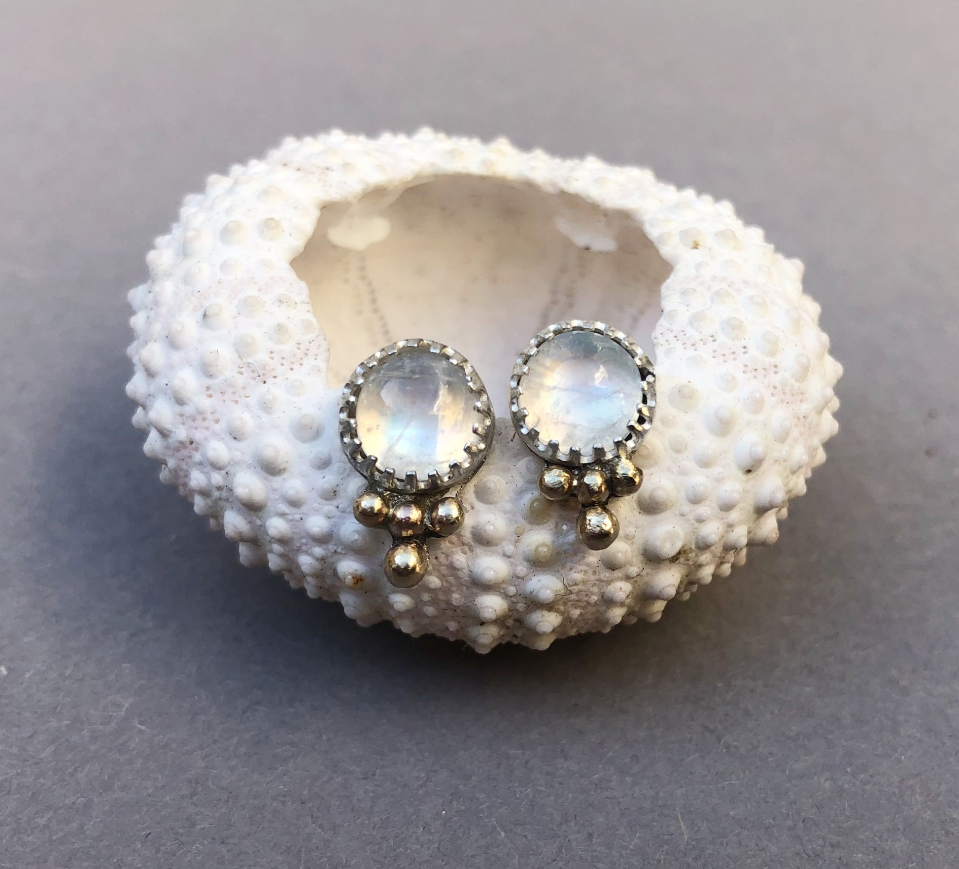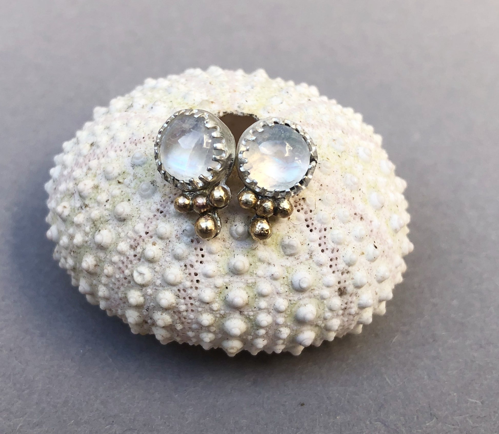 Dieses Paar zarter Brautohrringe kombiniert den sanften Glanz eines 8 mm großen Mondsteins mit dem Luxus von 14-karätigen Goldgrenailles. Der Stein ist in ein gezacktes Fassungsband aus Sterlingsilber eingefasst, das die natürliche Brillanz des Mondsteins noch weiter betont. Die dezenten Goldakzente sorgen für einen warmen, romantischen Look – perfekt für eine Braut, die einzigartigen Brautschmuck mit zeitlosem Charme sucht.