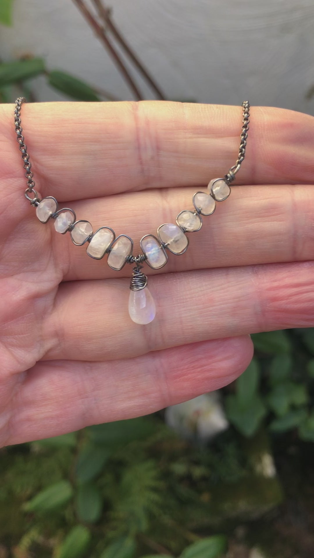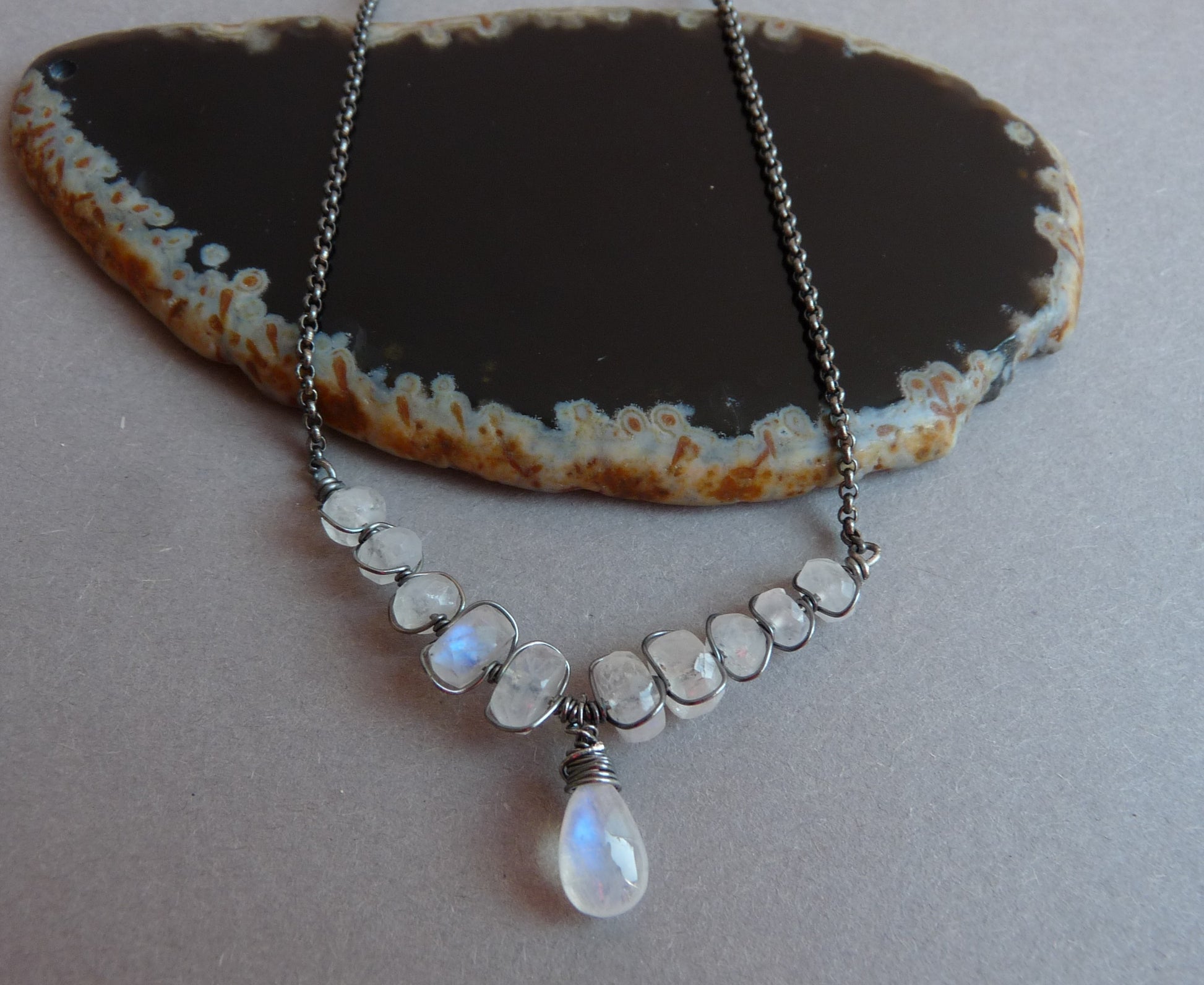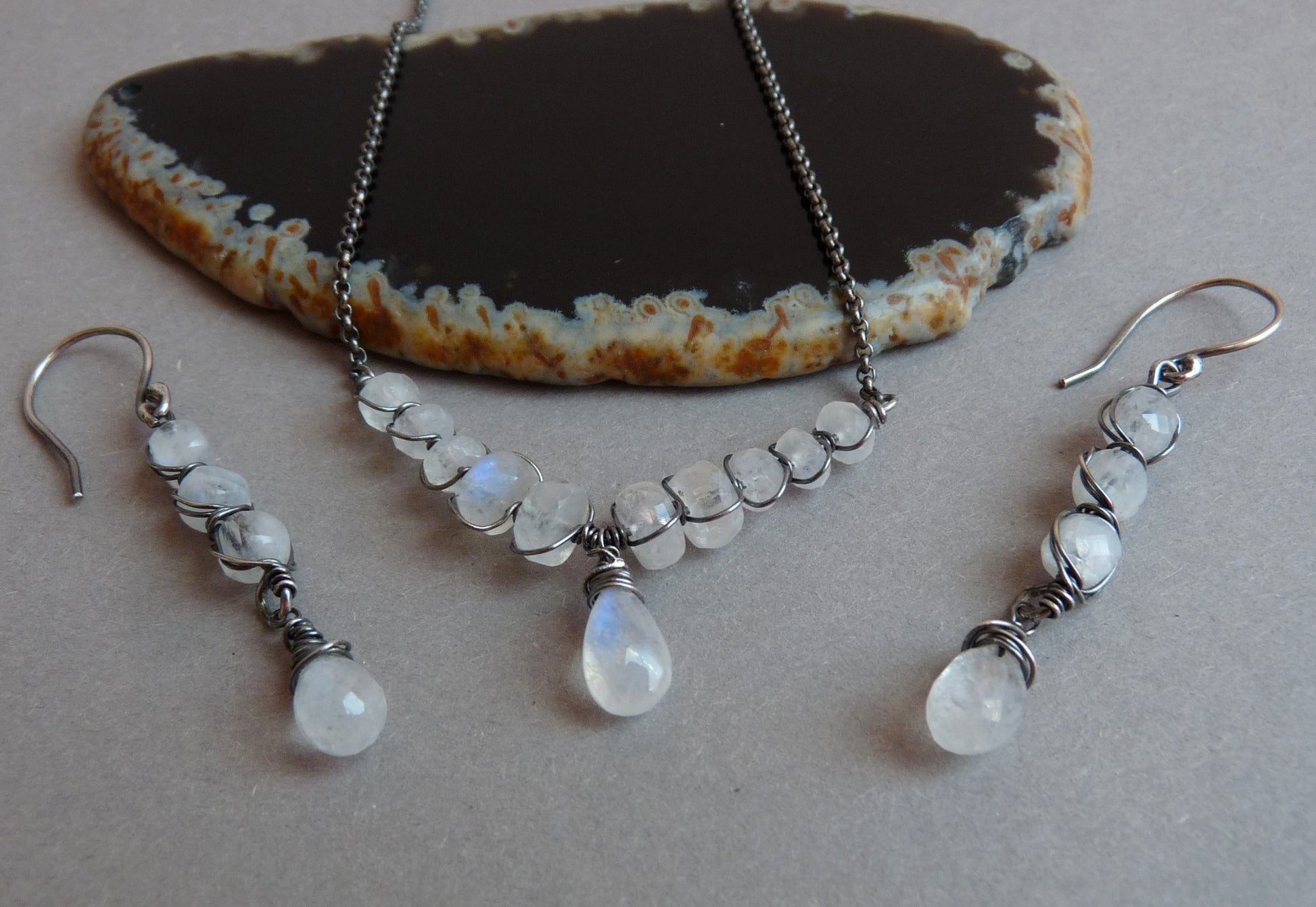 Dieses exklusive Brautschmuckset ist für Bräute gedacht, die einen subtilen, ätherischen Look mit einem Hauch Mystik lieben. Die handgefertigte Silberkette ist zart mit wunderschönen Mondsteinrondellen im Facettenschliff und einem wunderschönen Mondsteintropfen verziert. Die Edelsteine sind sorgfältig mit oxidiertem Silberdraht umwickelt, wodurch ihr natürlicher Glanz und ihr geheimnisvolles blaues Leuchten wunderbar zur Geltung kommen. Die Kette hat eine Länge von 45 cm und kann auf Wunsch in der Größe angepasst werden.