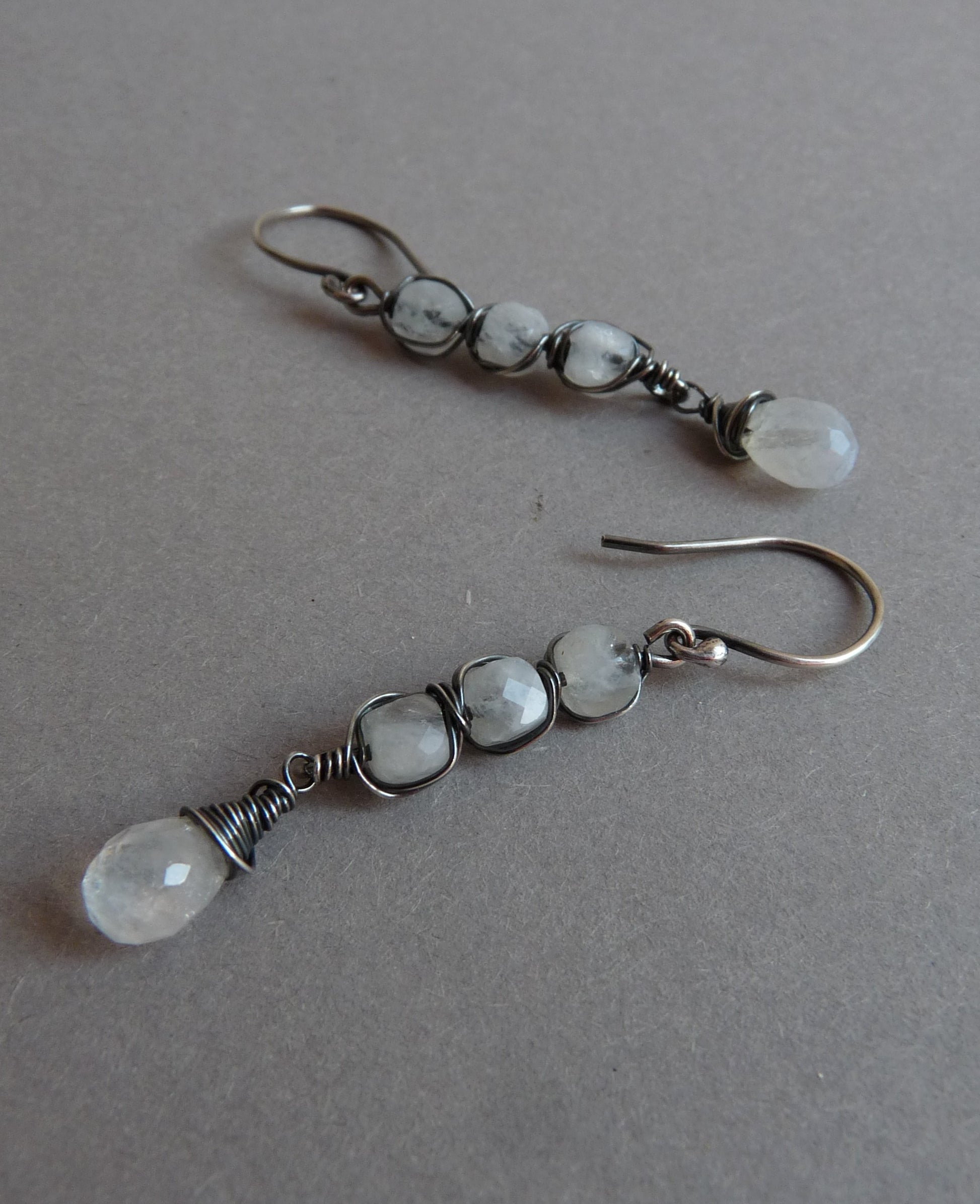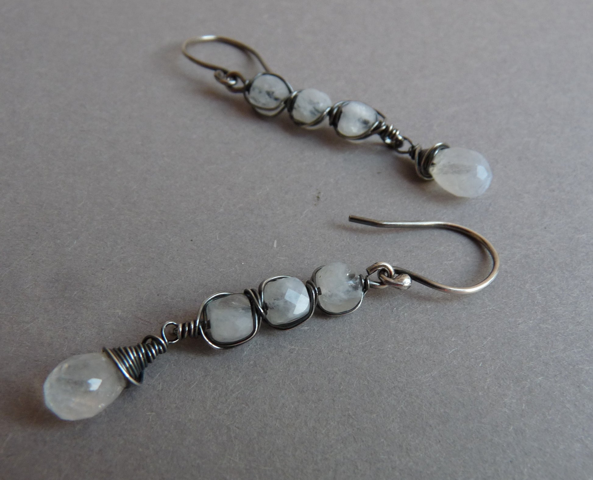 Die passenden silbernen Mondstein-Ohrringe haben eine elegante Länge von 5 cm ab Haken. Auch hier werden facettierte Mondsteinwürfel von Hand mit Silberdraht umwickelt, was einen verspielten und raffinierten Effekt ergibt.