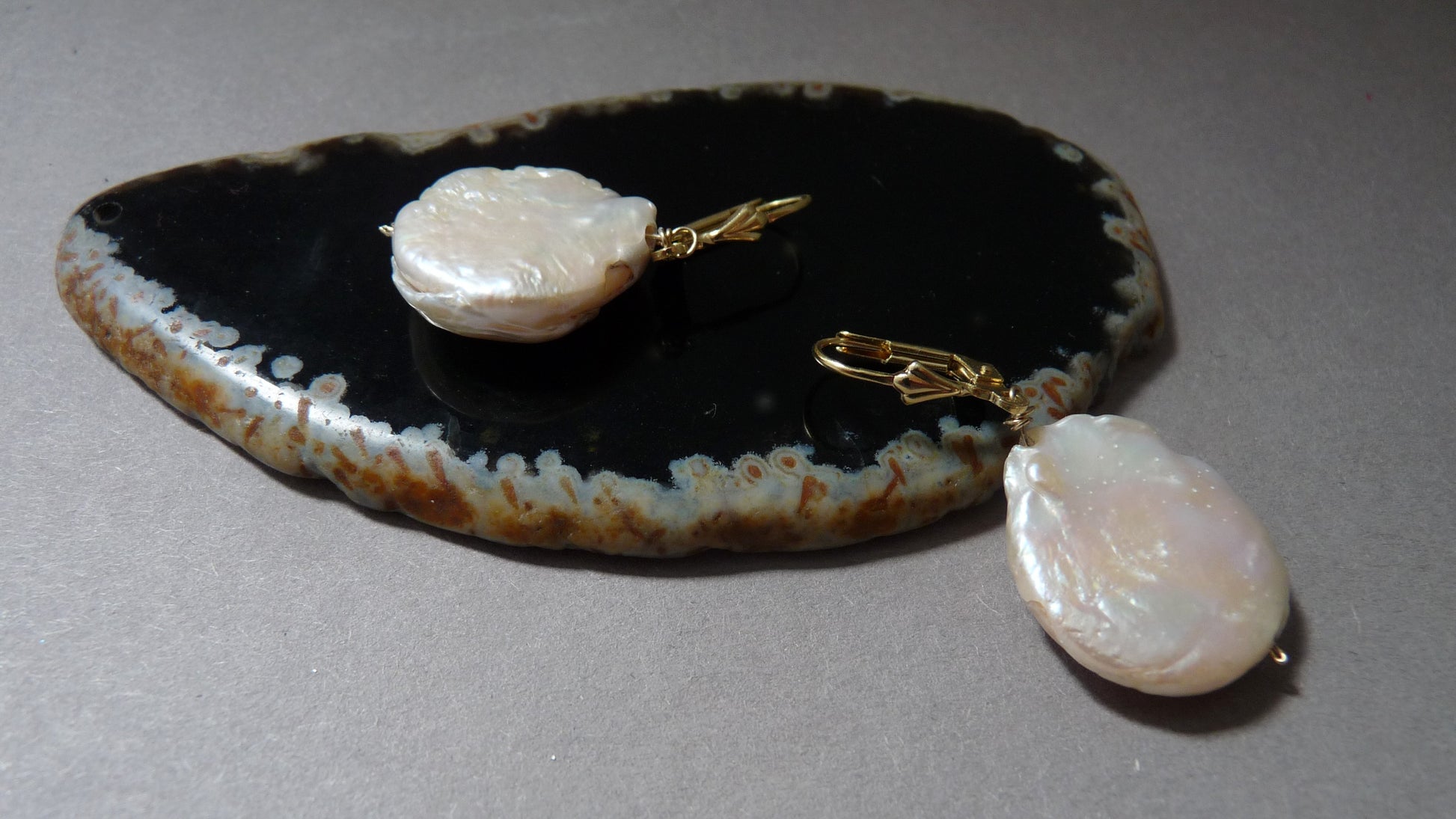 Handgefertigte goldene Perlenohrringe mit einem weichen, natürlichen Glanz.