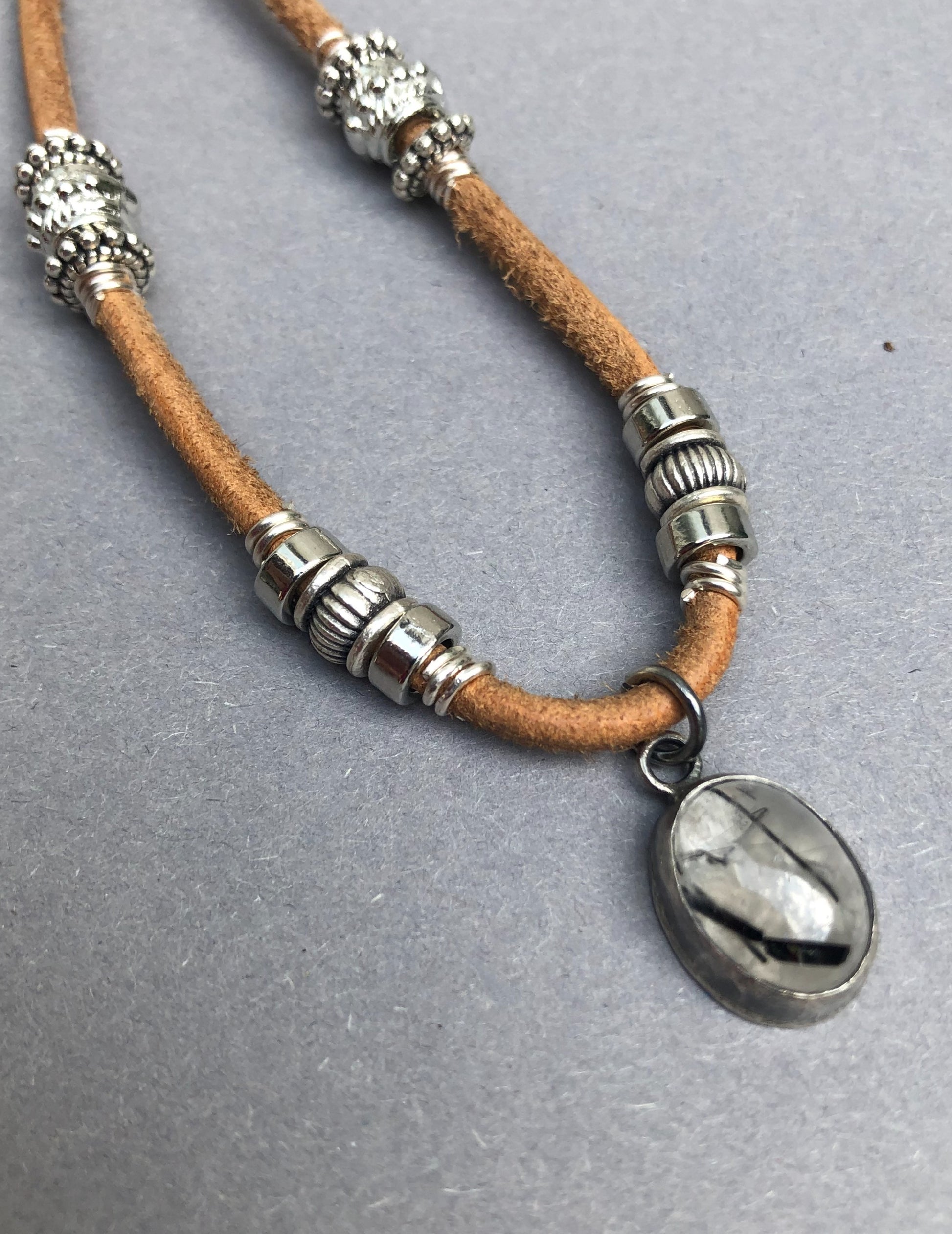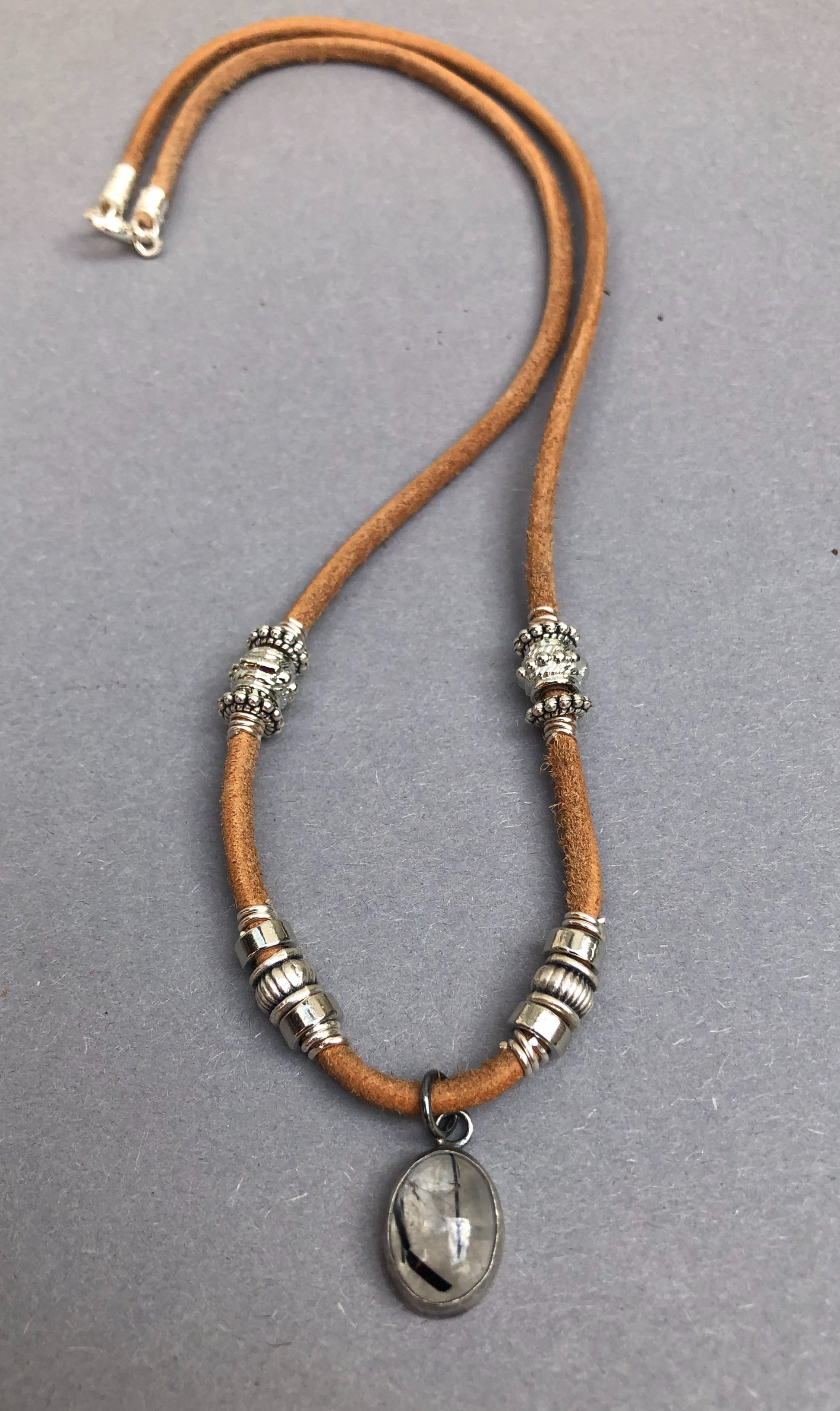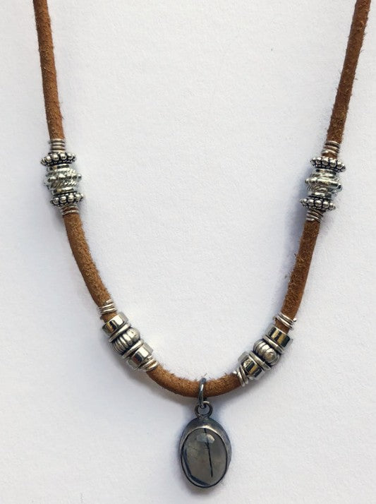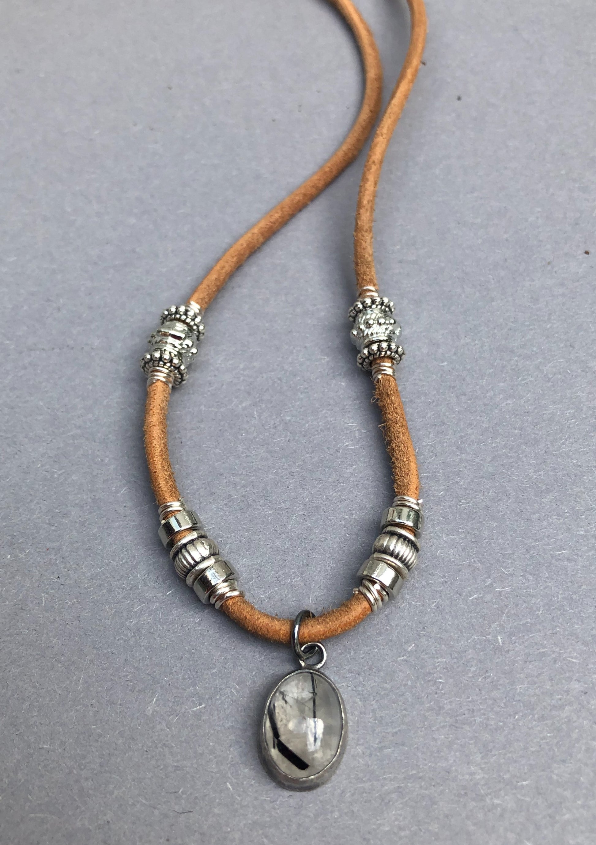 Handgefertigte Herrenhalskette aus Leder mit silbernem Turmalin-Quarz-Anhänger