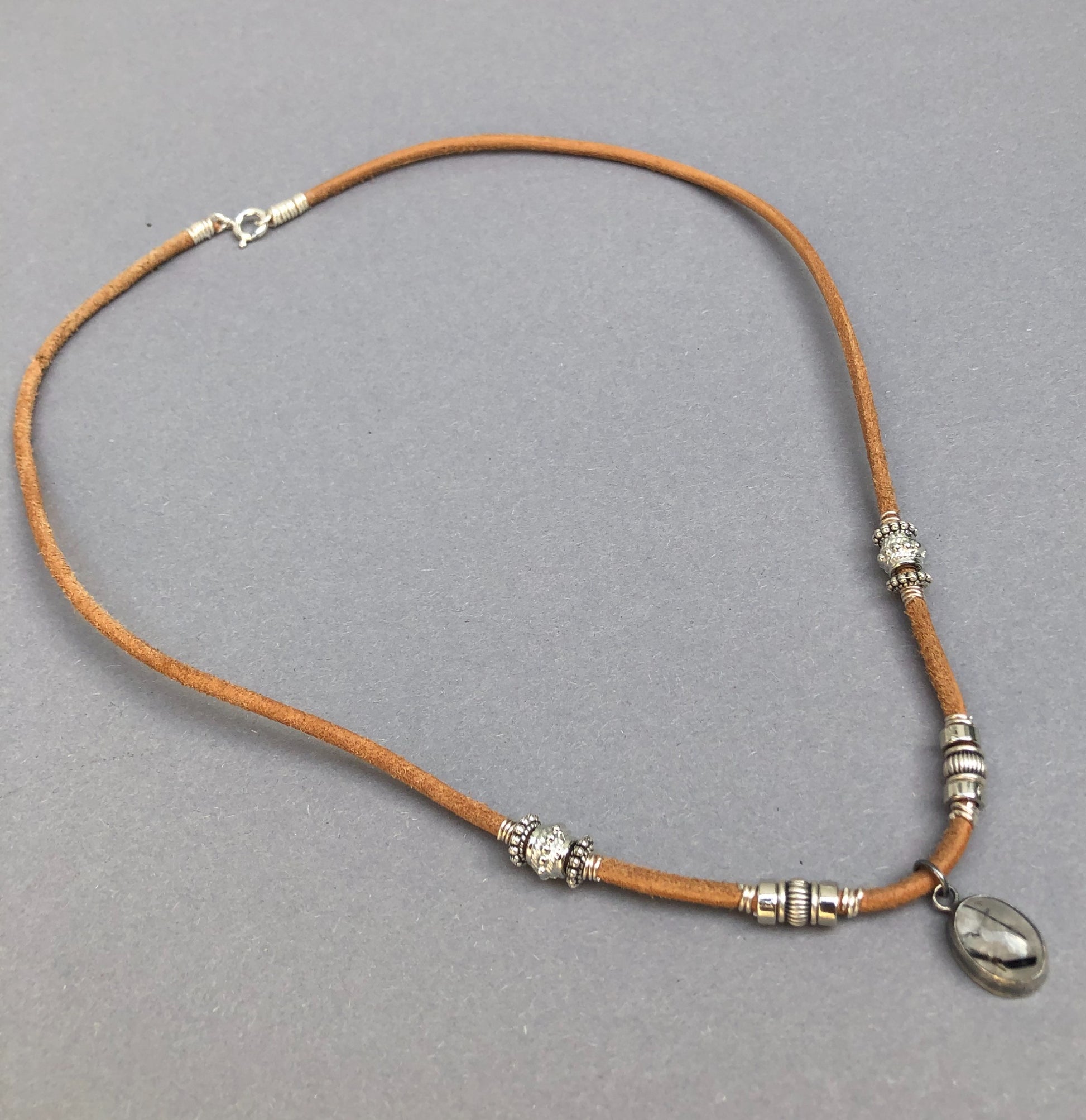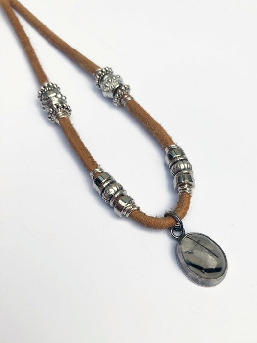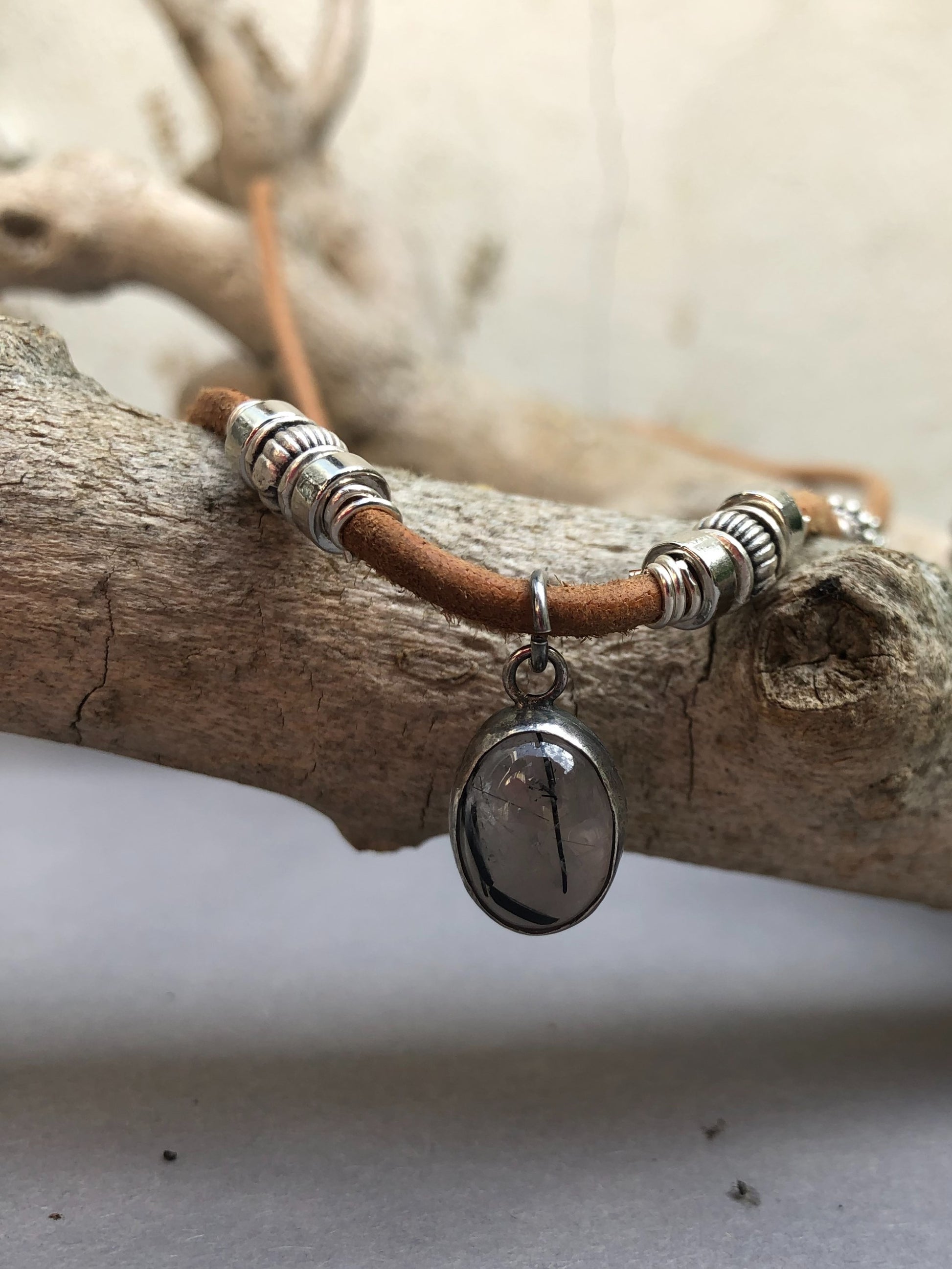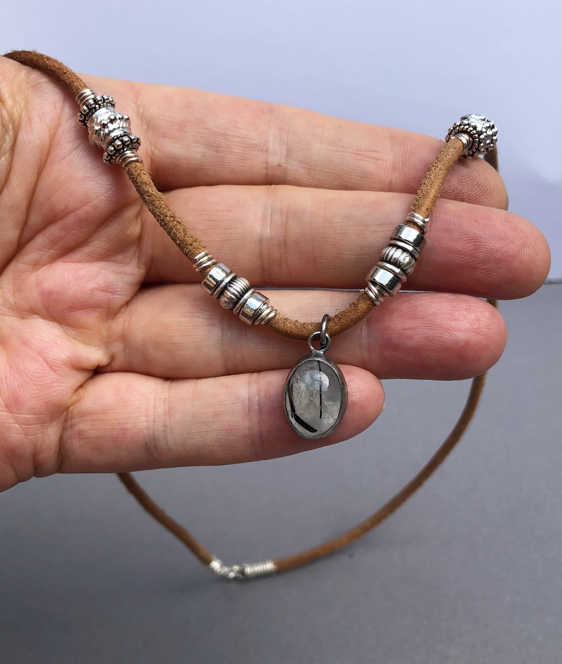 Handgefertigte Herrenhalskette aus Leder mit silbernem Turmalin-Quarz-Anhänger