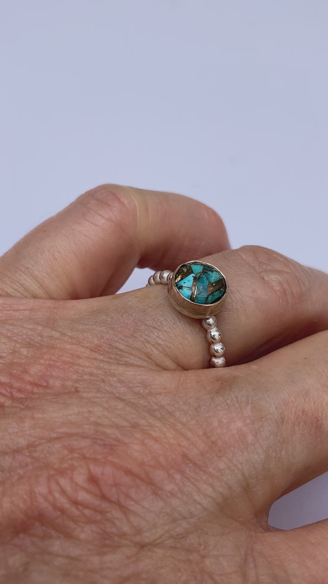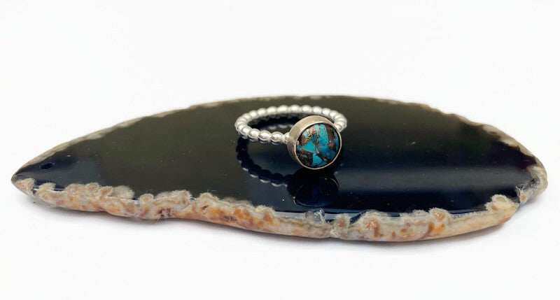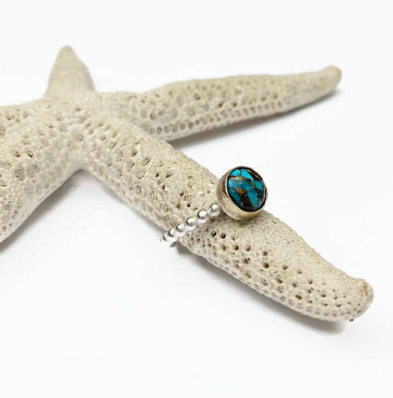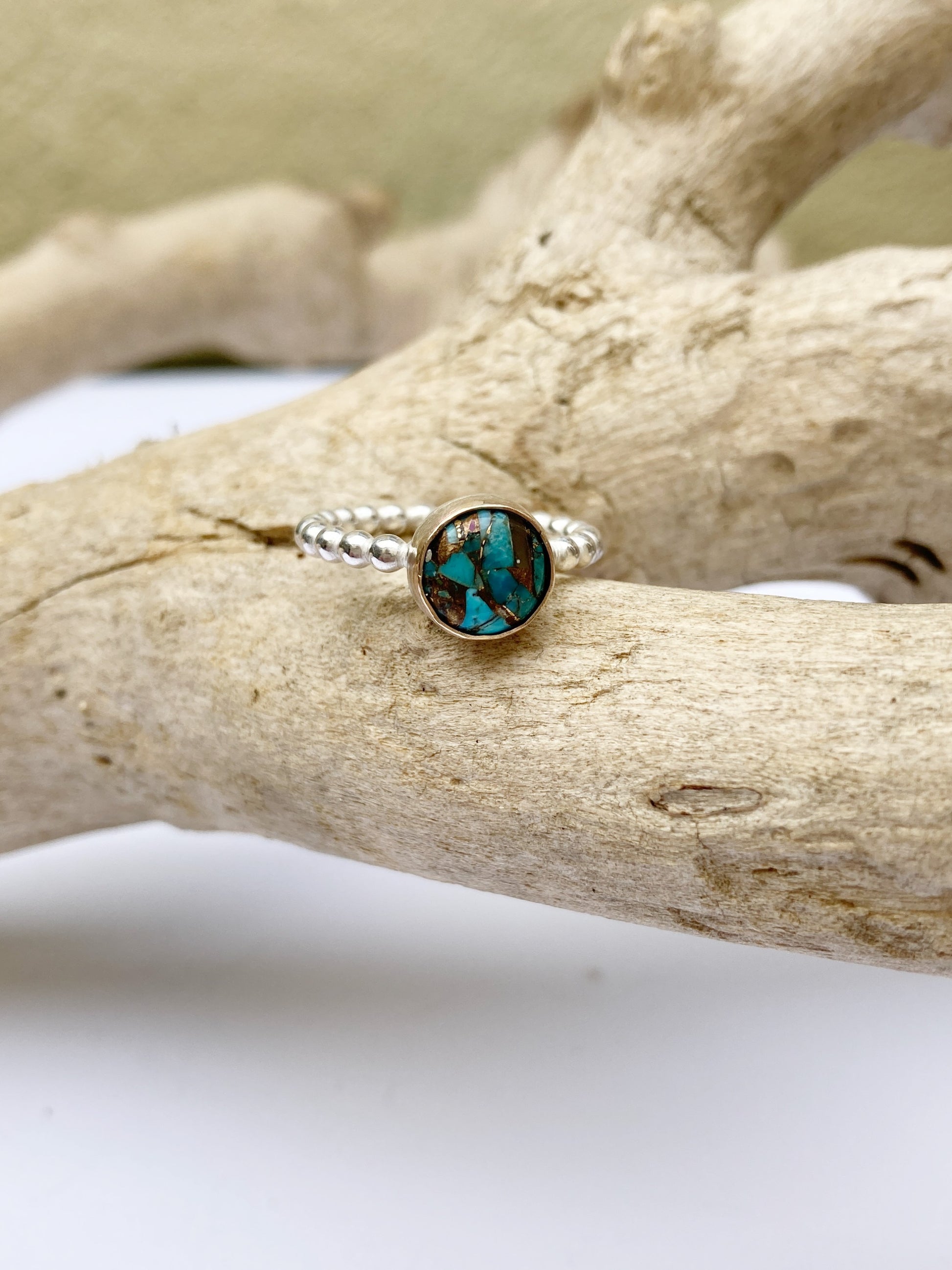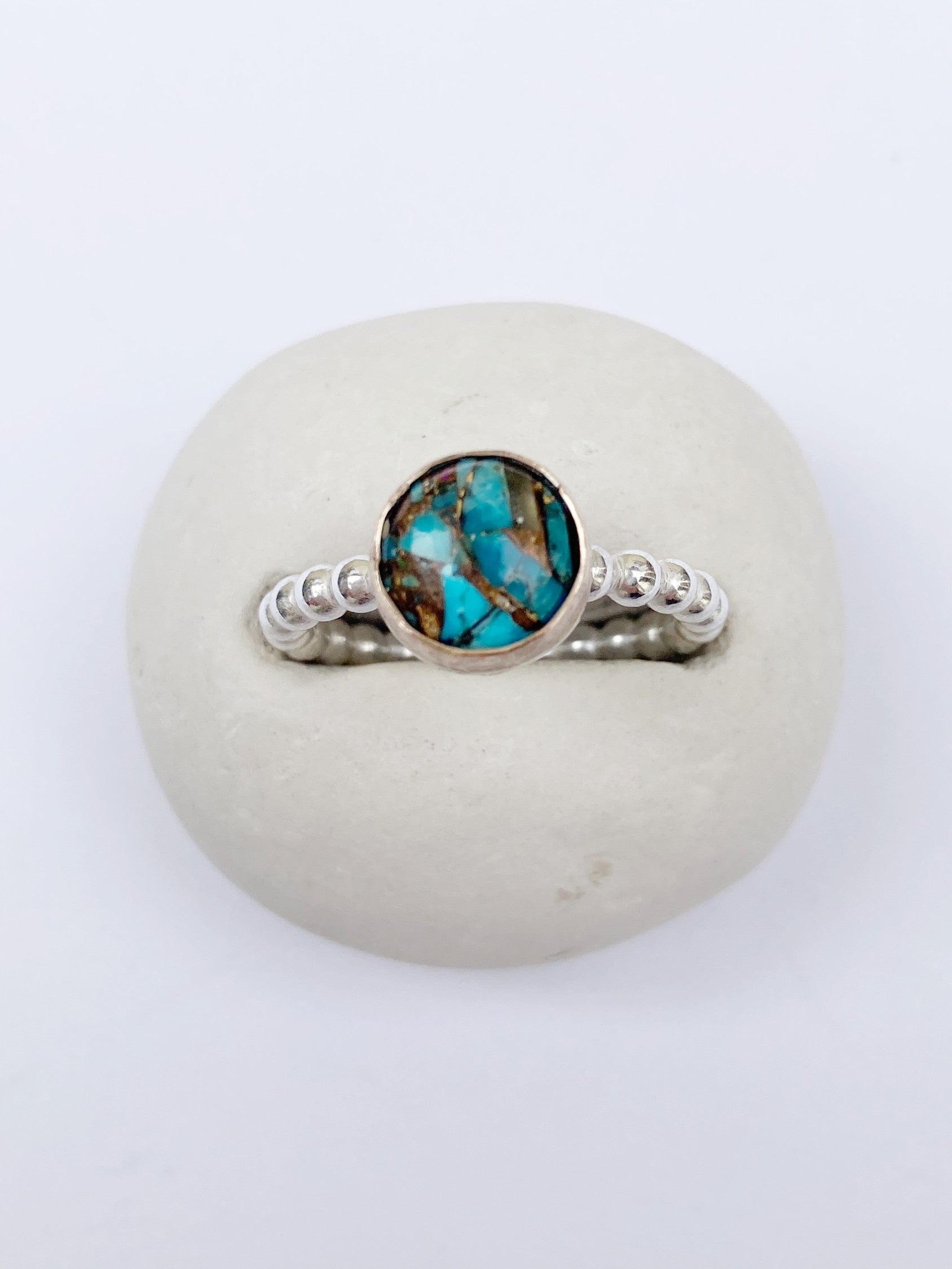 Ein wunderschöner handgefertigter Stapelring aus Gold und Silber, verziert mit einem echten kupfer-türkisen Edelstein von 8 mm. Dieses wunderschöne Schmuckstück kombiniert nahtlos ein Perldrahtband aus Sterlingsilber mit einer Fassungskante aus 9-Karat-Gold und ergibt so ein wunderschönes und einzigartiges Accessoire, das mühelos zu Ihrer gesamten Silber- und Goldring-mit-Steine-Kollektion passt. Stapelringe eignen sich hervorragend zur Kombination mit mehreren Ringen. Und durch die Verwendung von Gold und Silber in diesem Design sind die Kombinationsmöglichkeiten endlos.