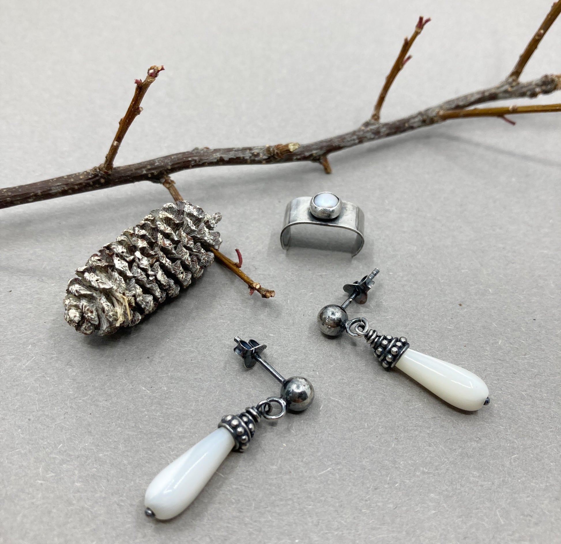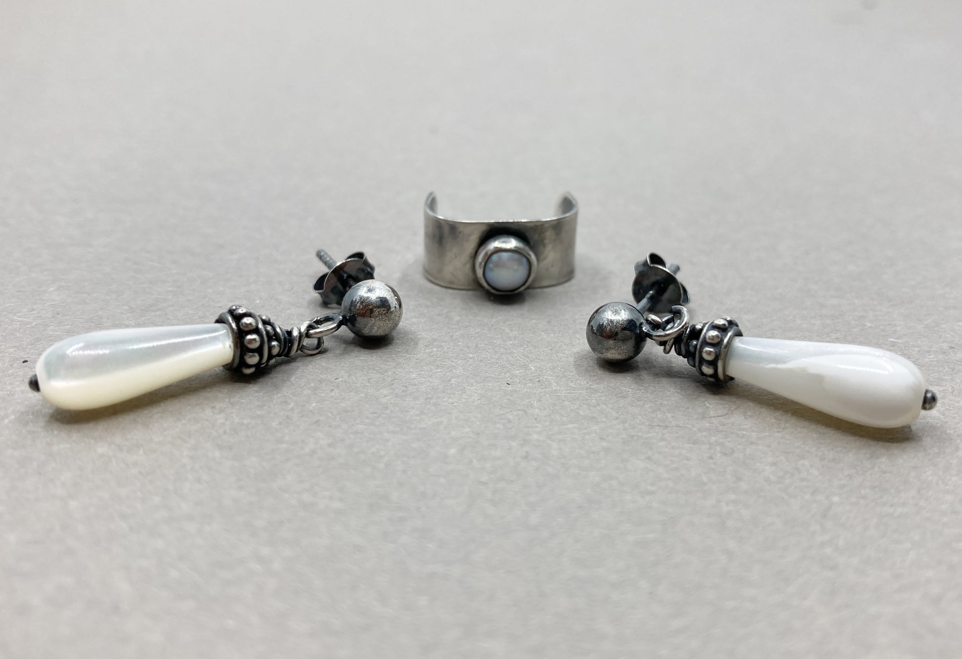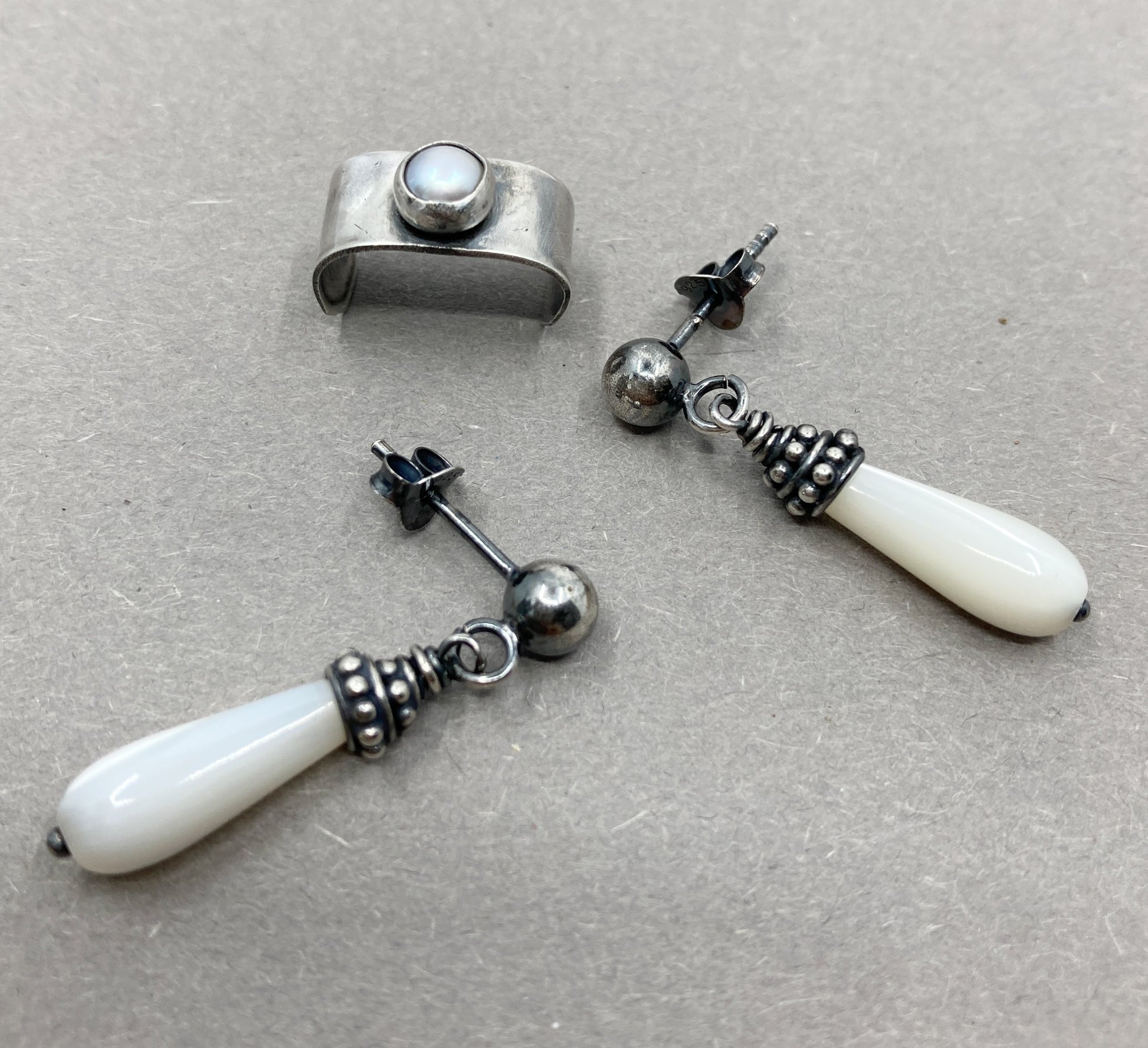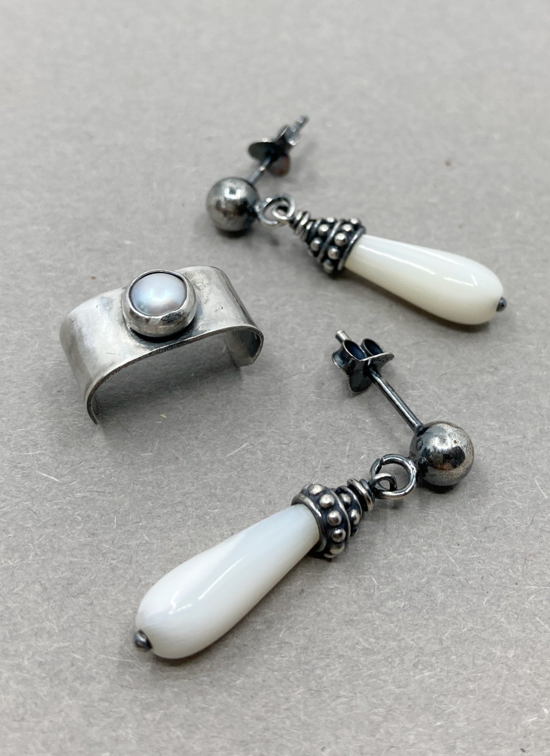 Entdecken Sie unseren einzigartigen und handgefertigten silbernen Herren-Ohrstecker mit Perle und passenden Ohrsteckern. Die silbernen Ohrstecker sind mit wunderschönen Perlmutttropfen mit Perlenkappen aus Bali-Silber verziert. Der passende trendige Ear Cuff hat eine echte 5 mm große Süßwasserperle. Wenn Sie ein echter Trendfolger sind, wird Ihnen dieses Set bestimmt gefallen!