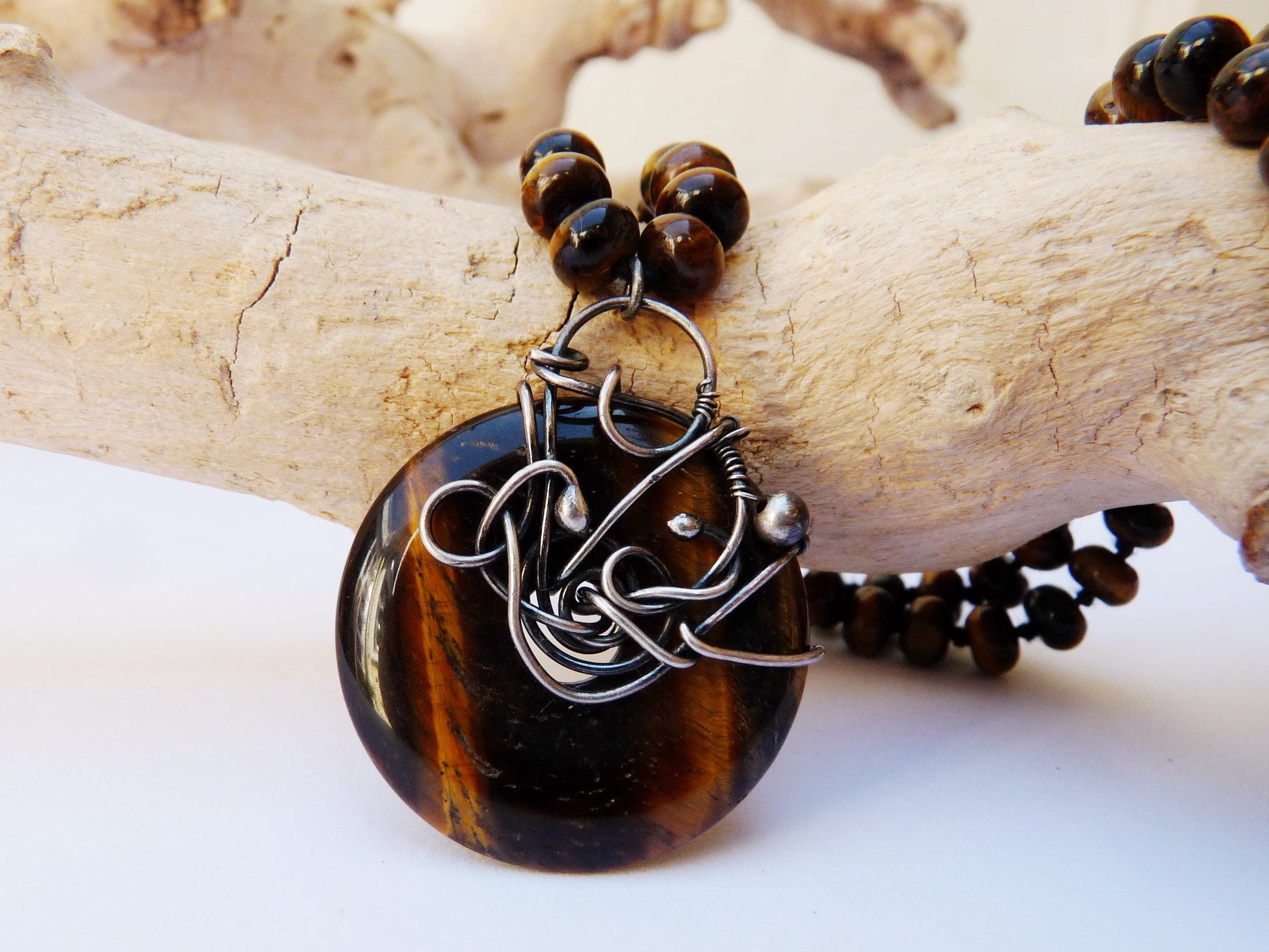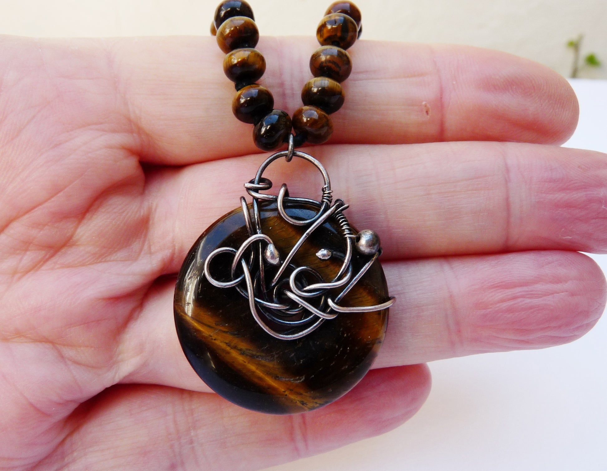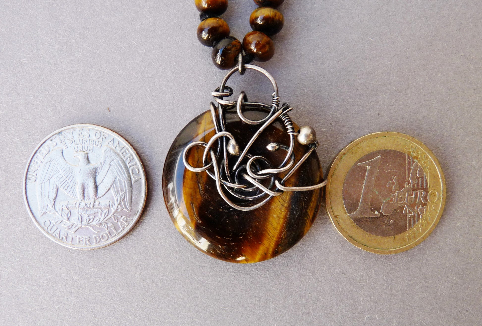 Der Hingucker dieser Tigerauge-Halskette ist der wunderschöne Donut-Anhänger, der mit Sterlingsilberdraht umwickelt ist. Diese einzigartige Kombination verleiht dem Ganzen einen Hauch von Raffinesse und Modernität und macht es zu einem perfekten Accessoire für lässige und formelle Anlässe.