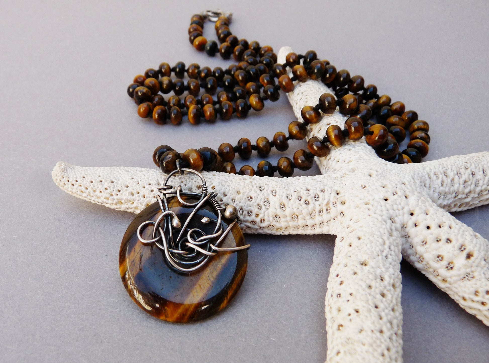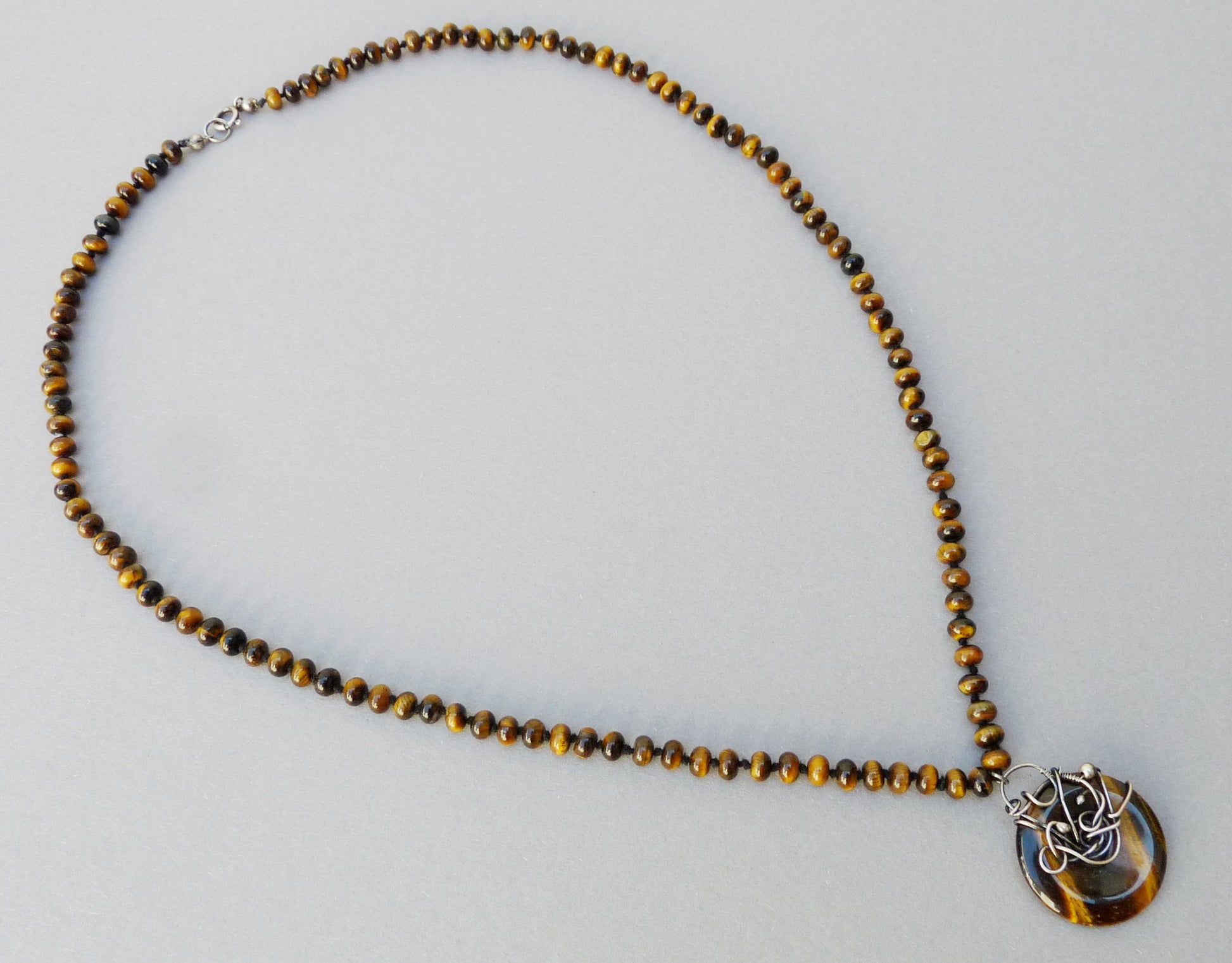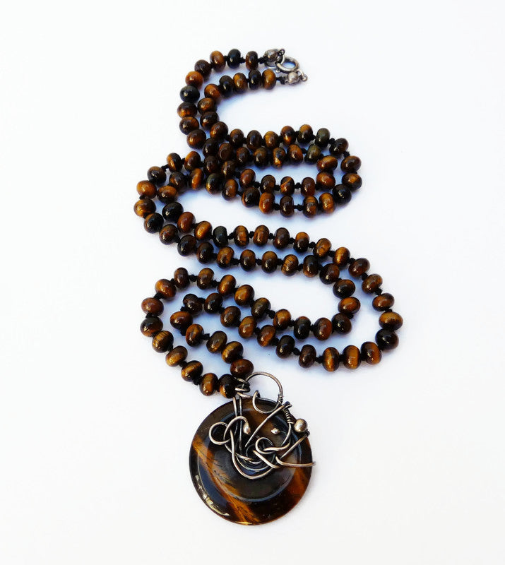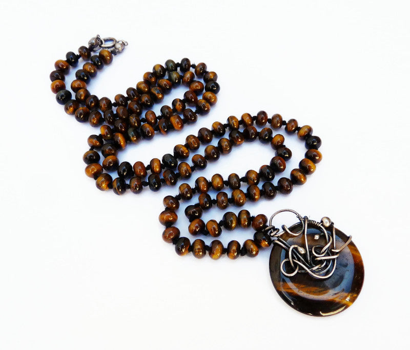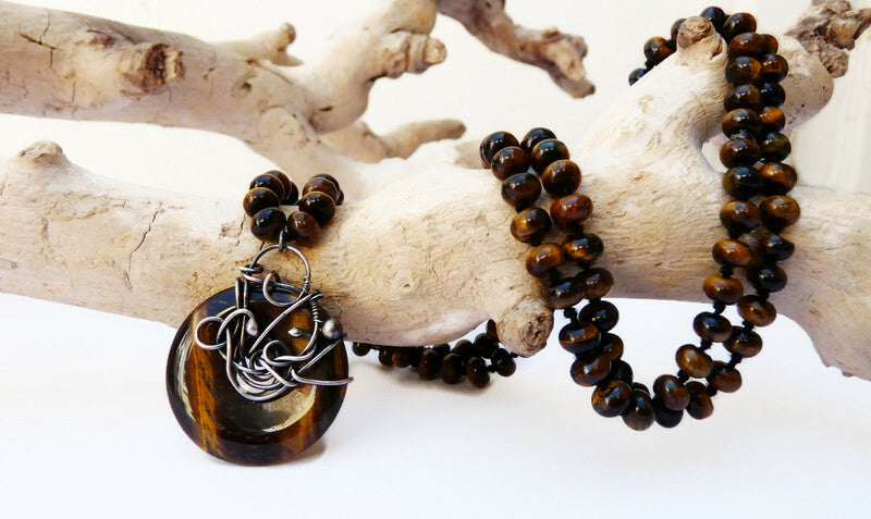 Der Hingucker dieser Tigerauge-Halskette ist der wunderschöne Donut-Anhänger, der mit Sterlingsilberdraht umwickelt ist. Diese einzigartige Kombination verleiht dem Ganzen einen Hauch von Raffinesse und Modernität und macht es zu einem perfekten Accessoire für lässige und formelle Anlässe.