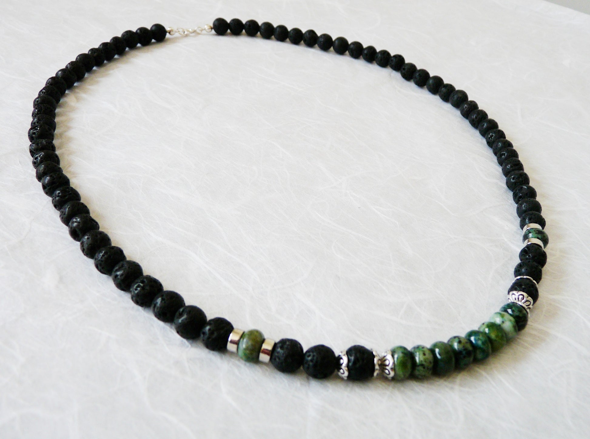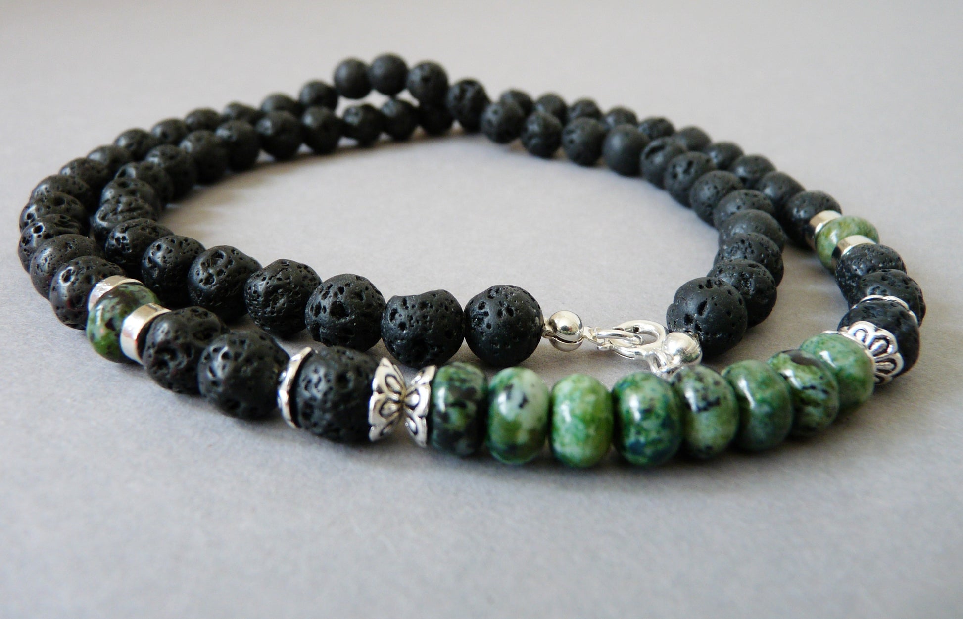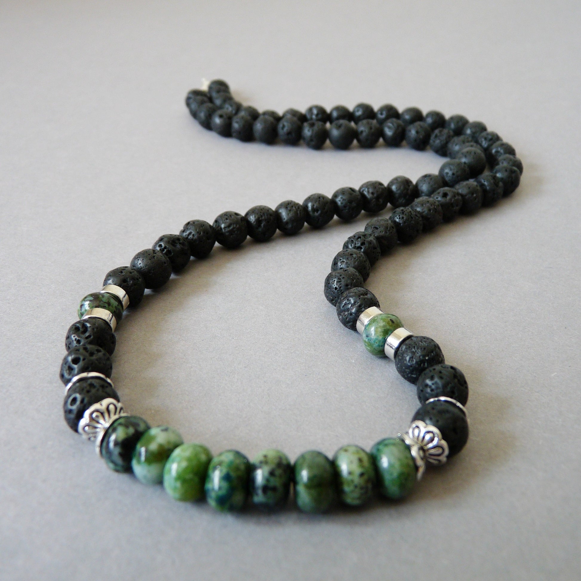 Kurze Herren-Perlenkette mit Natursteinen – Chrysokoll- und Lavaperlen