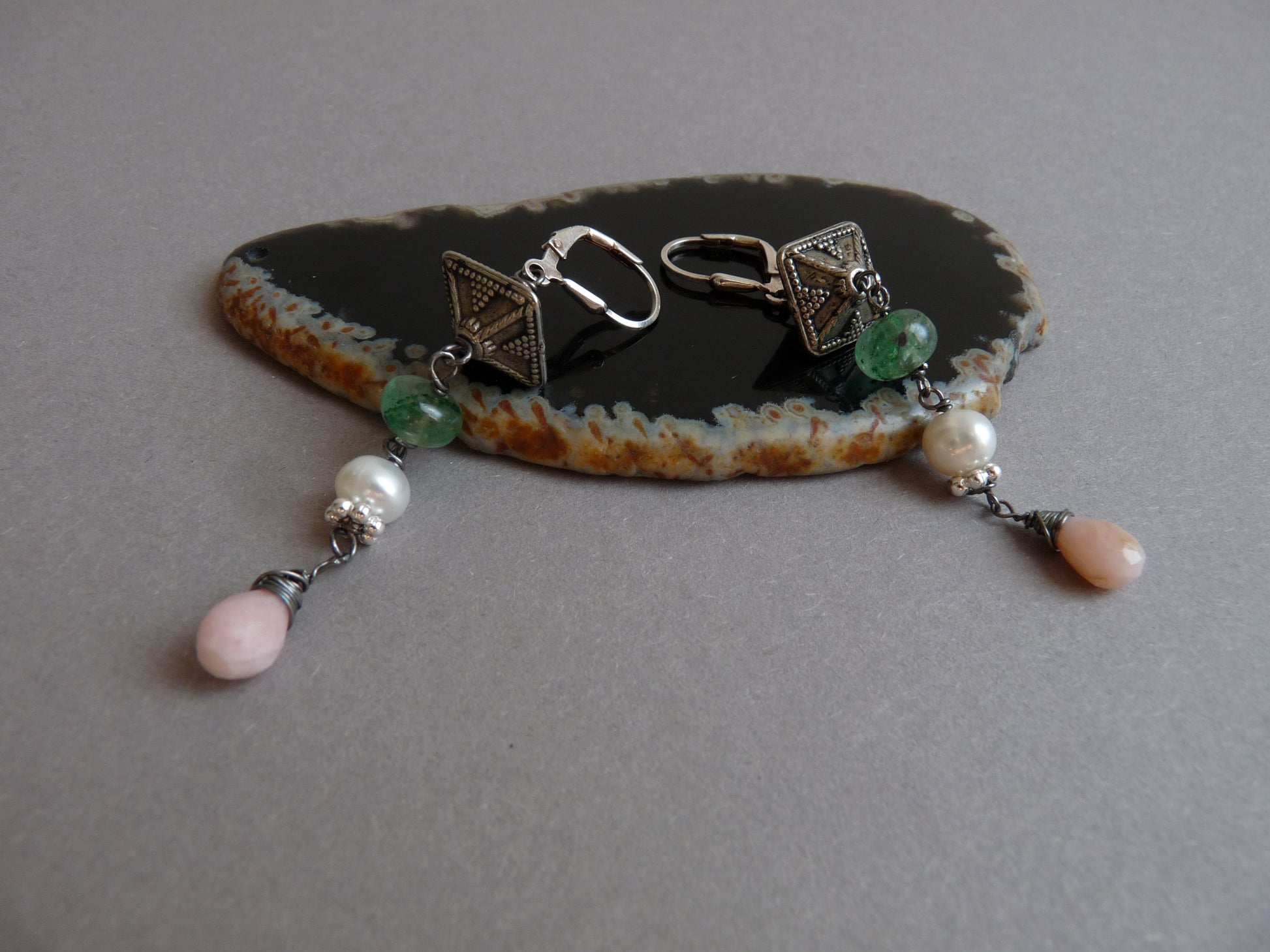 Diese eleganten langen silbernen Brautohrringe sind eine einzigartige Mischung aus zeitloser Klasse und Vintage-Charme. Mit einer verspielten Kombination aus grünem Erdbeerquarz , einer wunderschönen Süßwasserperle und lachsrosa Opal-Brioletten strahlen einen sanften, romantischen Look aus.