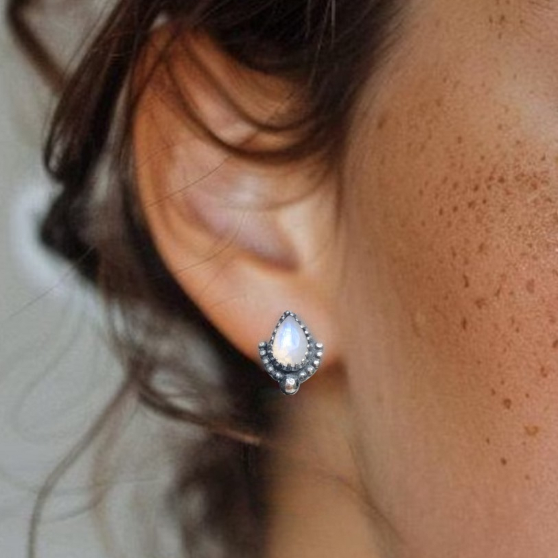 Diese stilvollen Ohrstecker sind handgefertigt aus Sterlingsilber und verfügen über einen tropfenförmigen Mondstein, der für seinen sanften Glanz und seine magische Anziehungskraft bekannt ist. Das natürliche schillernde Funkeln des Steins verleiht diesen Ohrringen ein subtiles, bezauberndes Aussehen.