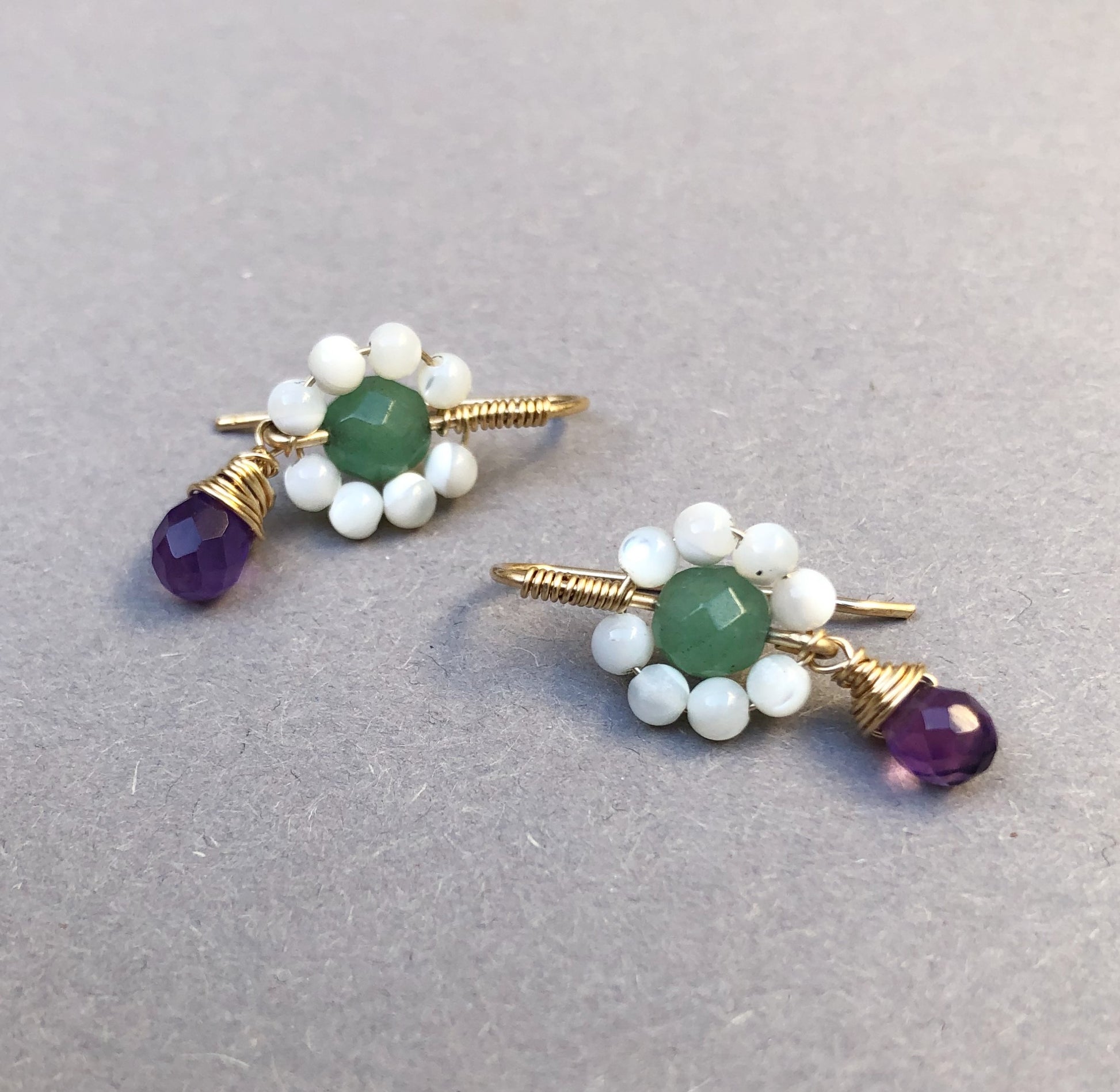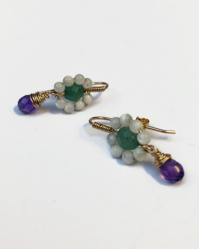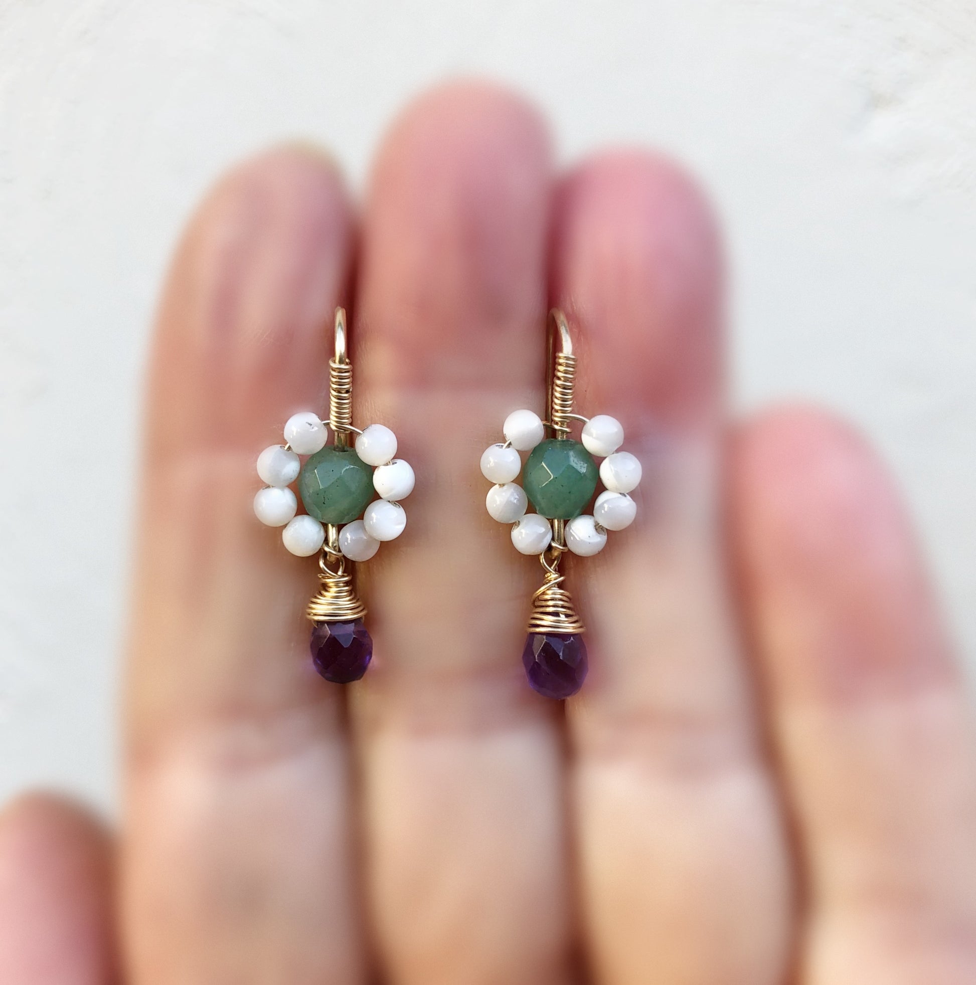 Entdecken Sie den raffinierten Charme dieser handgefertigten Ohrringe aus 14 Karat Gold. Die zartgrüne 6 mm große Aventurinperle in der Mitte ist von kleinen 4 mm großen Perlmuttperlen umgeben, die ein dezentes Blumenmuster bilden. Als eleganter Abschluss tanzt darunter ein facettierter Amethysttropfen und verleiht jeder Bewegung einen Hauch von Farbe und Funkeln.