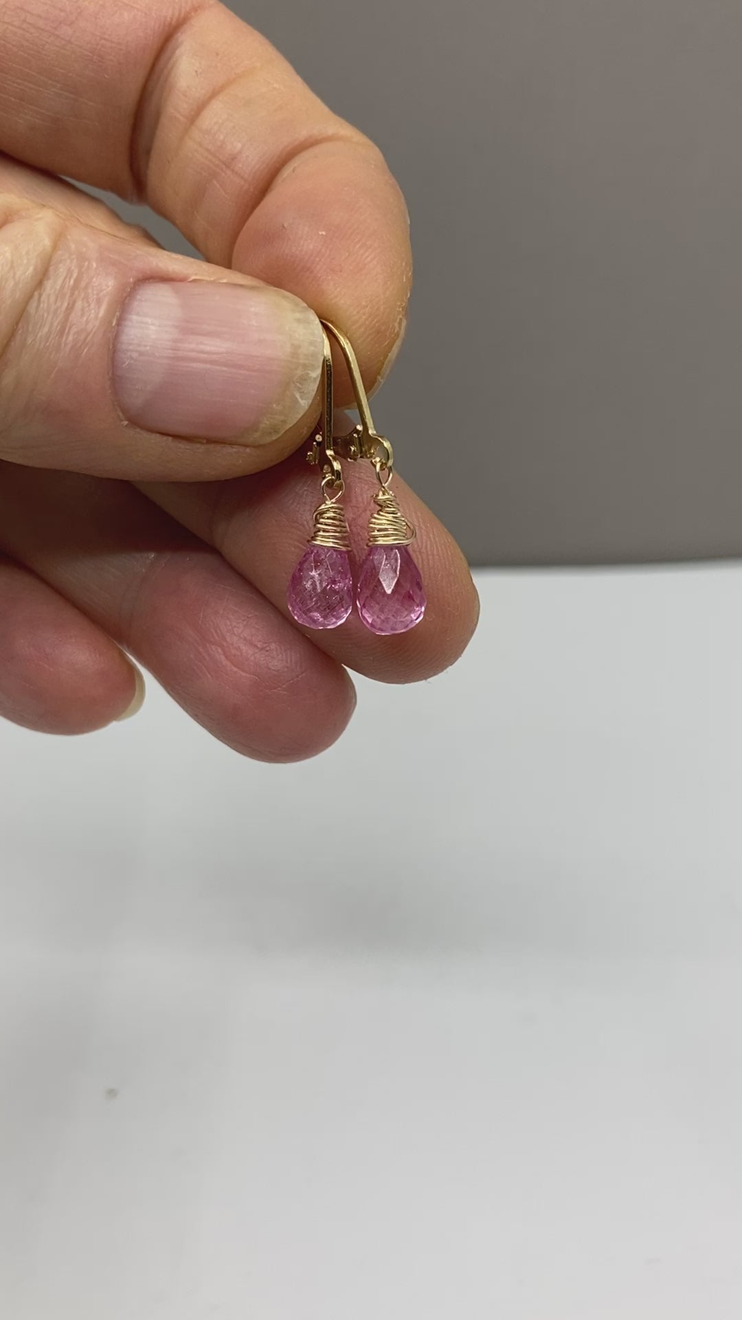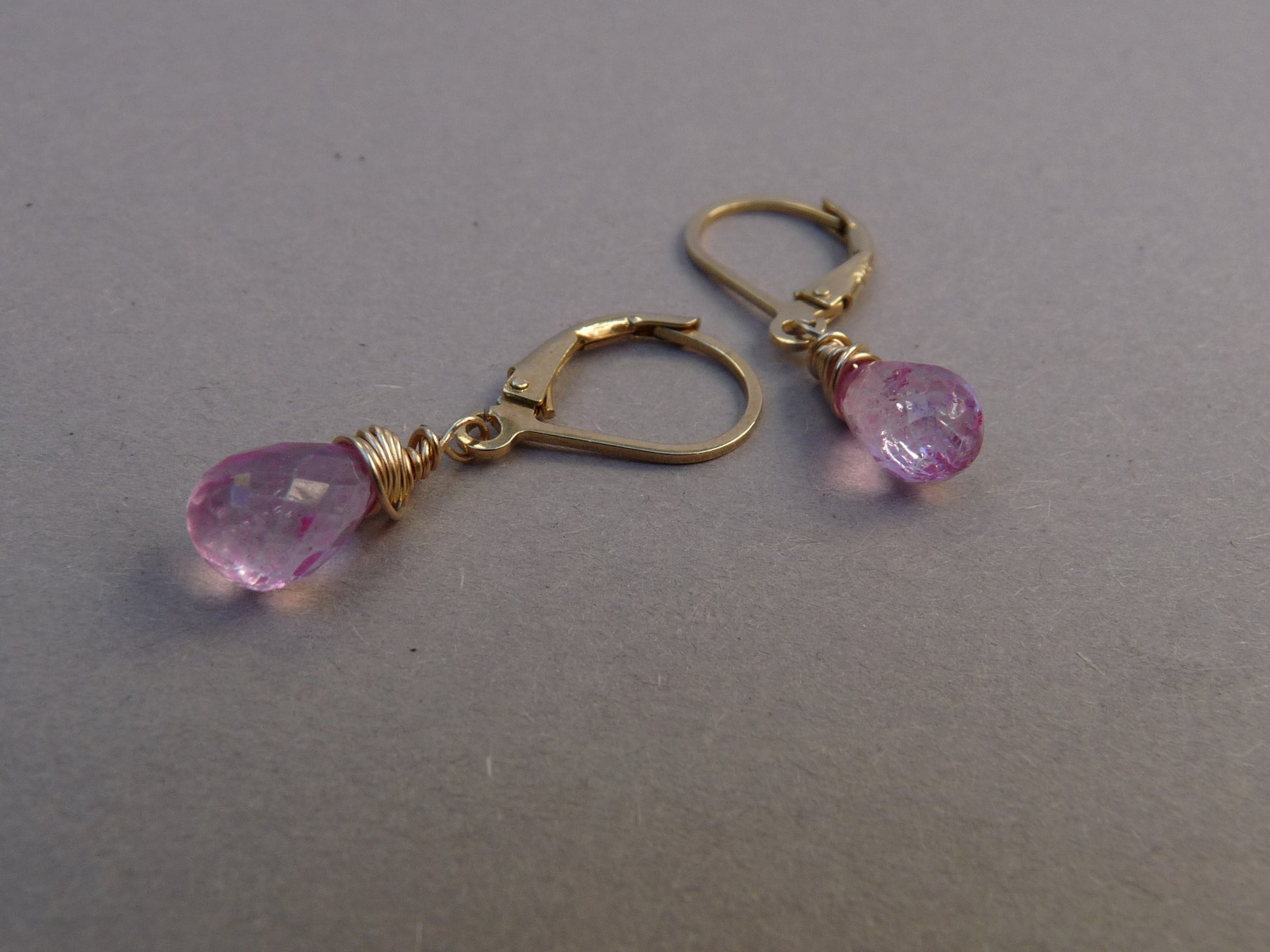 An einem Paar Gold-Vermeil-Ohrringe aus 925er Silber (mit Silberpunze) ist ein wunderschön funkelnder Tropfen aus rosafarbenem Topas befestigt. Ein schlichtes, aber sehr feminines Paar Ohrringe, die funkeln, sobald sie das Licht einfangen.