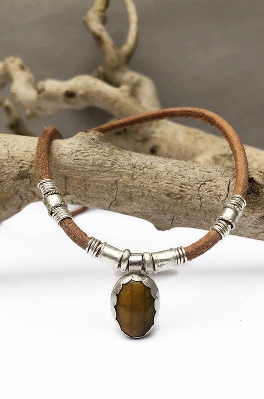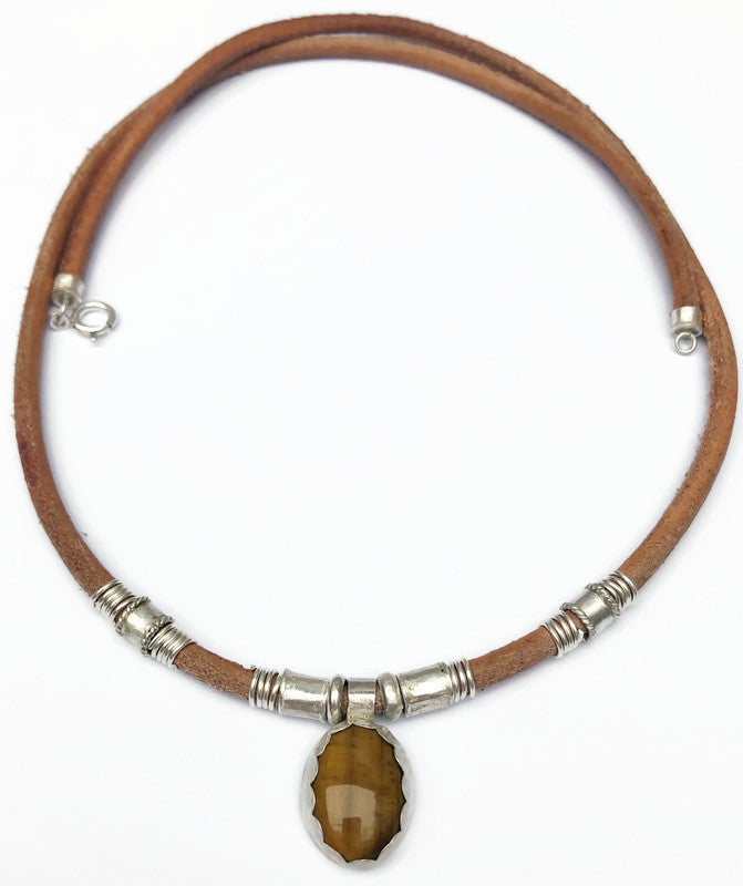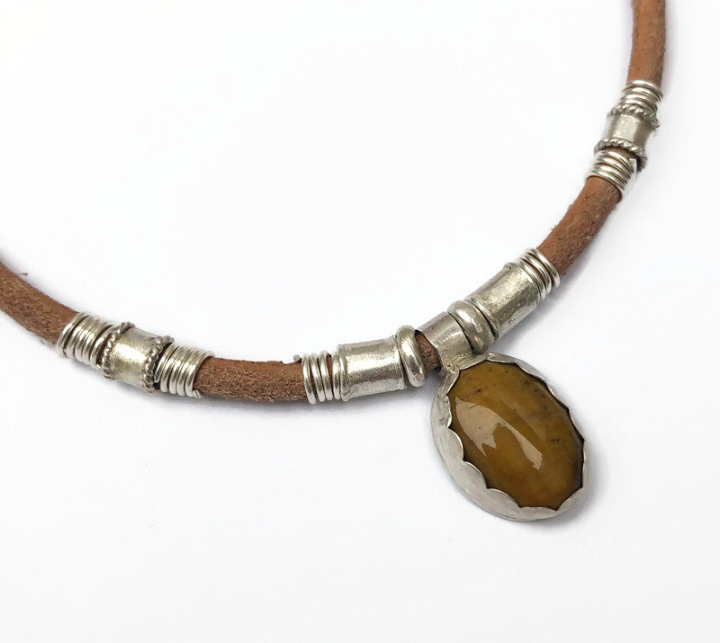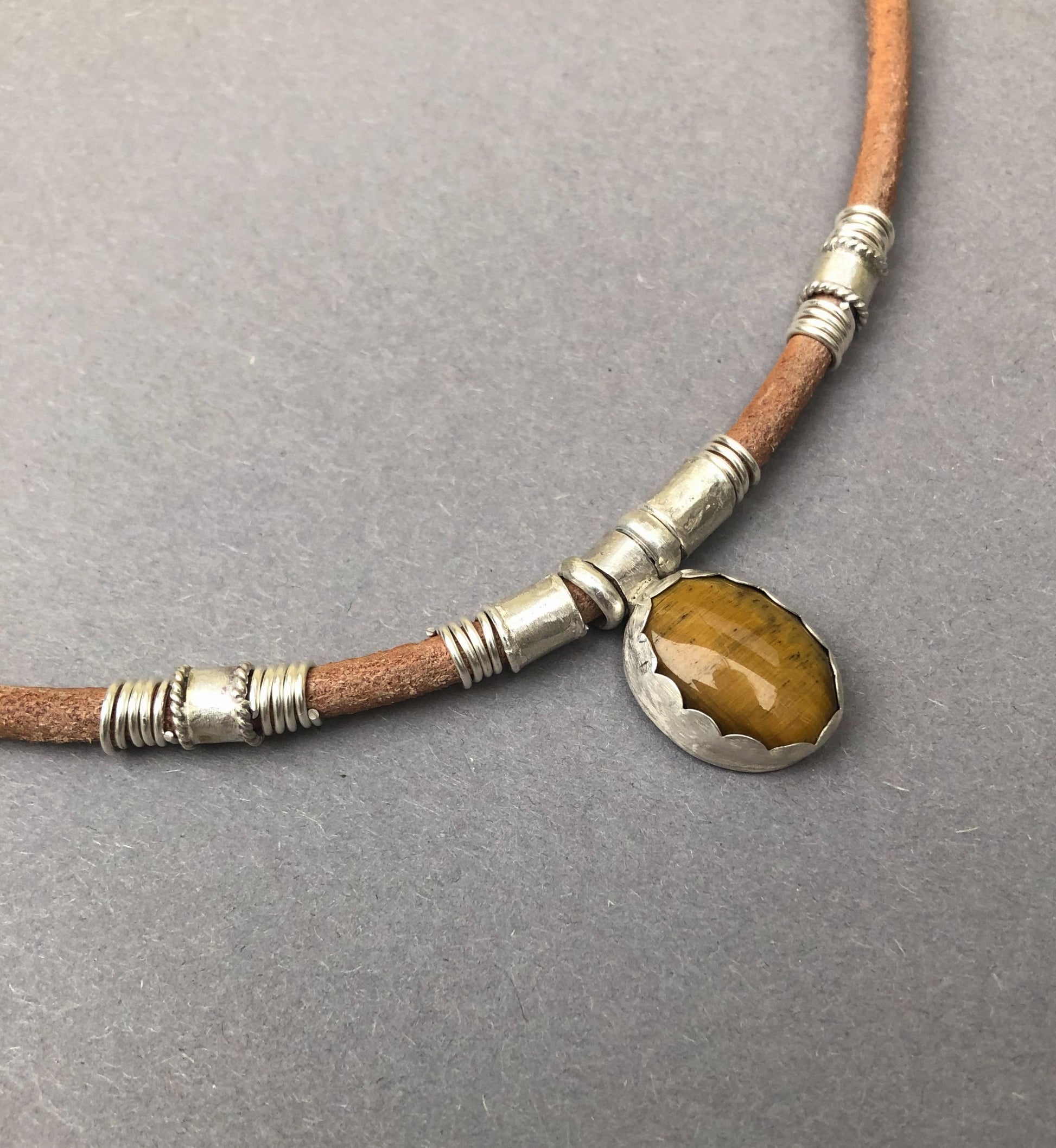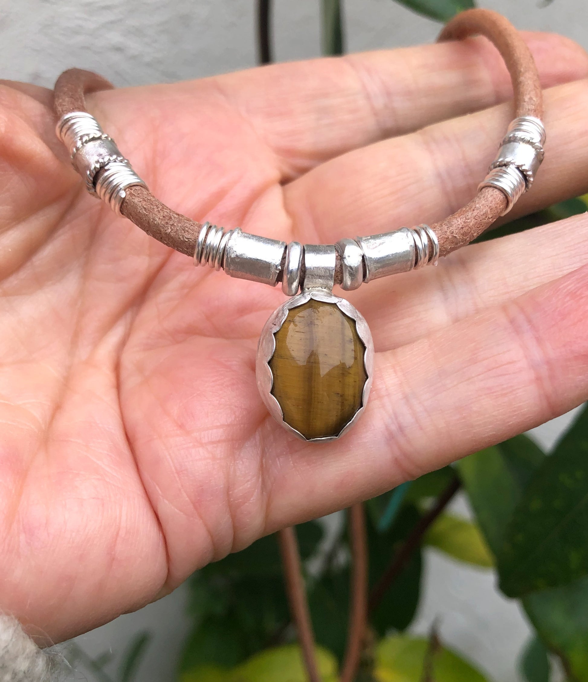 Der Anhänger besteht aus einem wunderschönen Tigerauge-Edelstein und ist mit einem gewellten Silberrand versehen, der den warmen, glänzenden Charakter des Steins betont. Der Anhänger misst 2,5 cm ab der Kordel und symbolisiert Stärke und Schutz, perfekt für Männer, die ihrem Stil gerne eine persönliche Note verleihen.