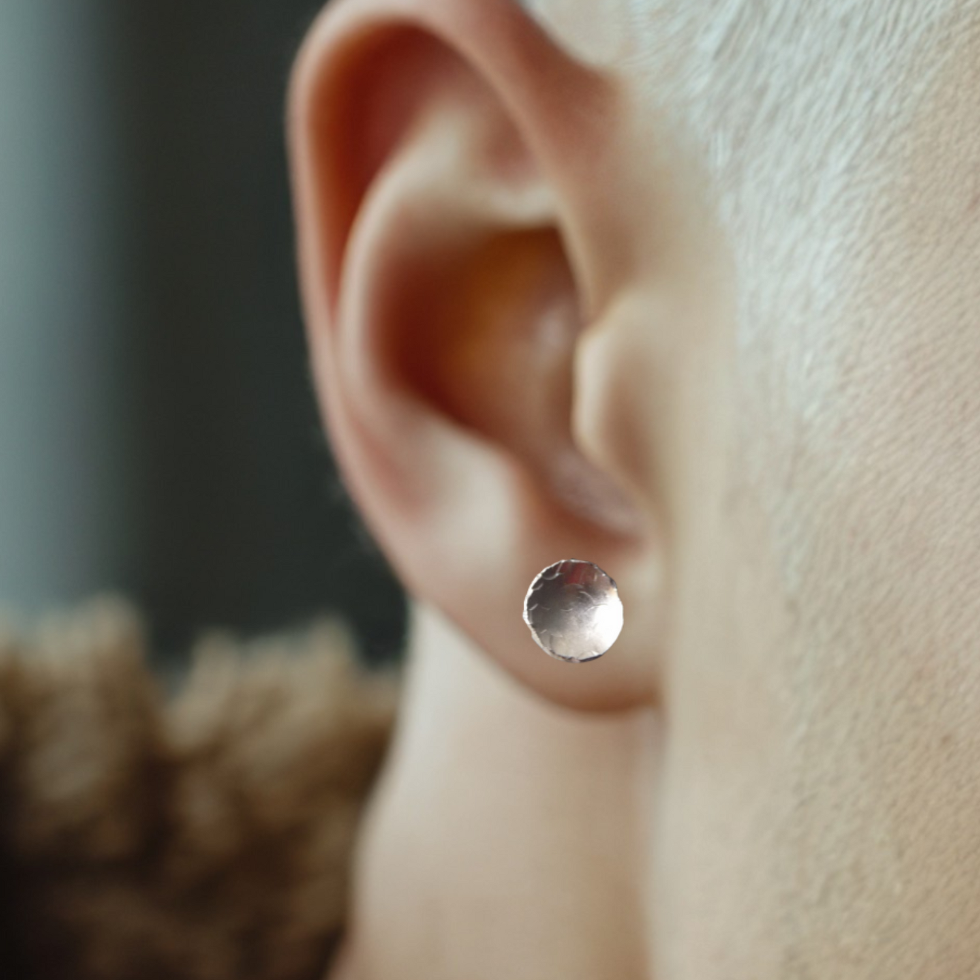 Mit einem Durchmesser von ca. 6–7 mm sind sie kompakt und dennoch auffällig. Aus massivem Silber handgeschmiedet und mit robusten silbernen Pousetten (Rücken) für einen bequemen, sicheren Sitz ausgestattet.