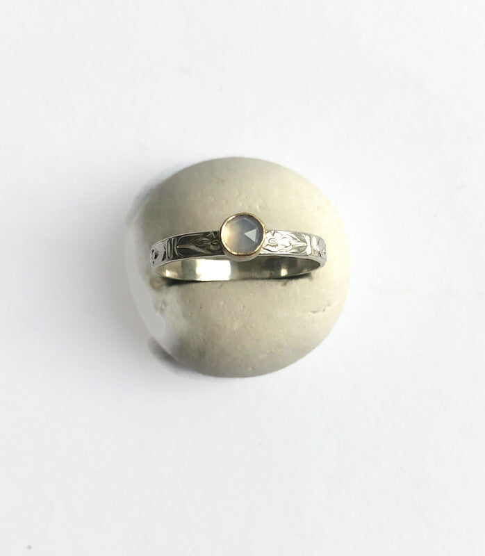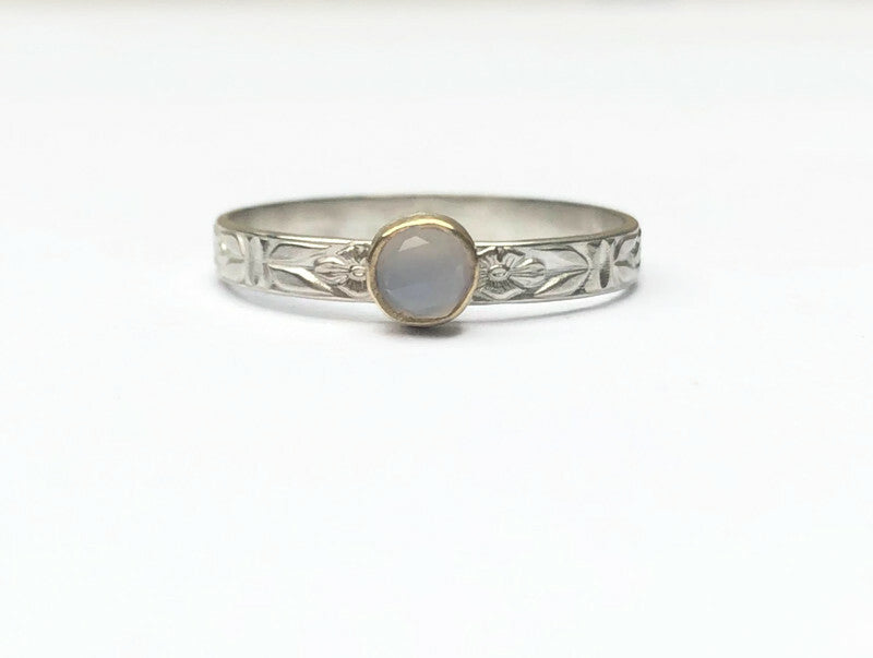 Die feine silberne Ringschiene ist elegant mit einem subtilen Blumenmuster versehen, das dem Design ein weiches, elegantes Aussehen verleiht. Im Herzen des Rings glänzt ein 4 mm großer, facettengeschliffener Chalcedon, eingefasst in eine warme Fassung aus 9 Karat Gold. Chalcedon ist als Stein der Ruhe, des Gleichgewichts und der Harmonie bekannt – perfekt als bedeutungsvolles Geschenk zwischen Freunden oder als dezenter Verlobungsring für einen intimen Heiratsantrag.
