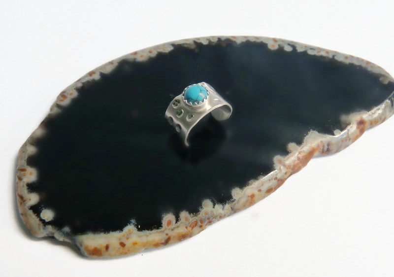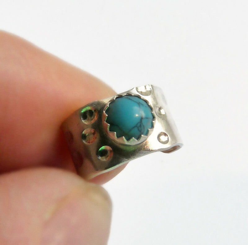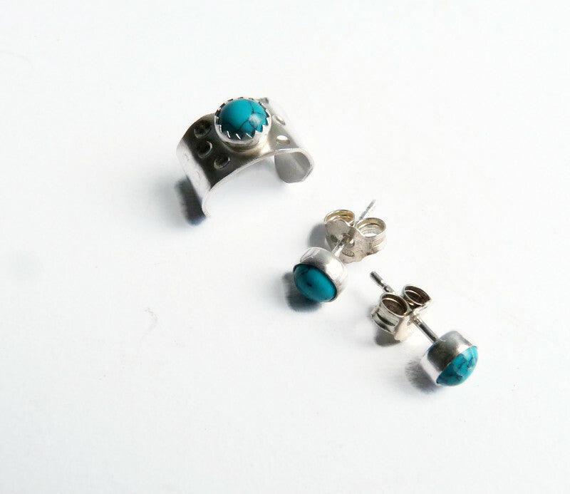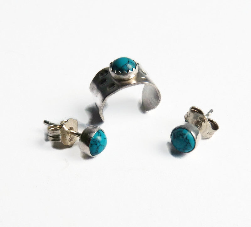 Dieser handgefertigte silberne Ohrring mit einem 5 mm großen türkisfarbenen Edelstein verleiht Ihrem Look sofort Charakter. Die gehämmerten Details verleihen diesem robusten Stück einen kühnen und verspielten Look. Dieses Stück ist ein Unikat und wird in unserem Atelier handgefertigt.
