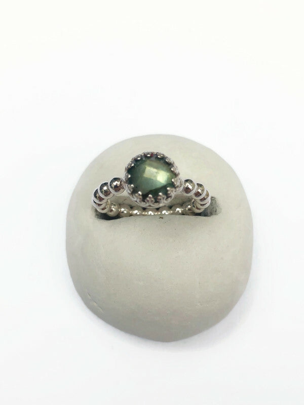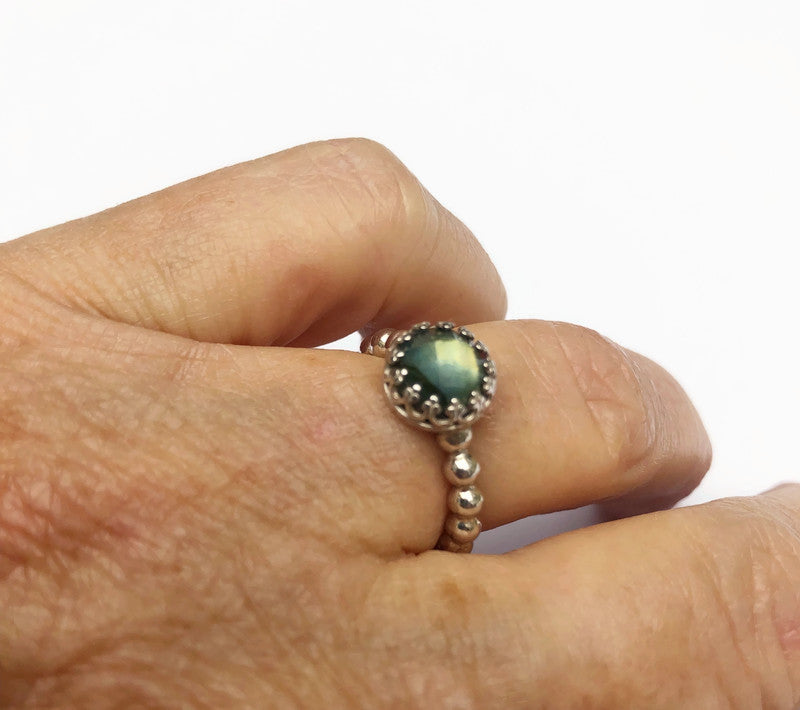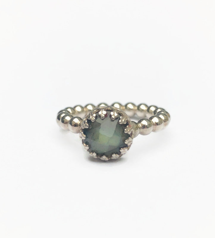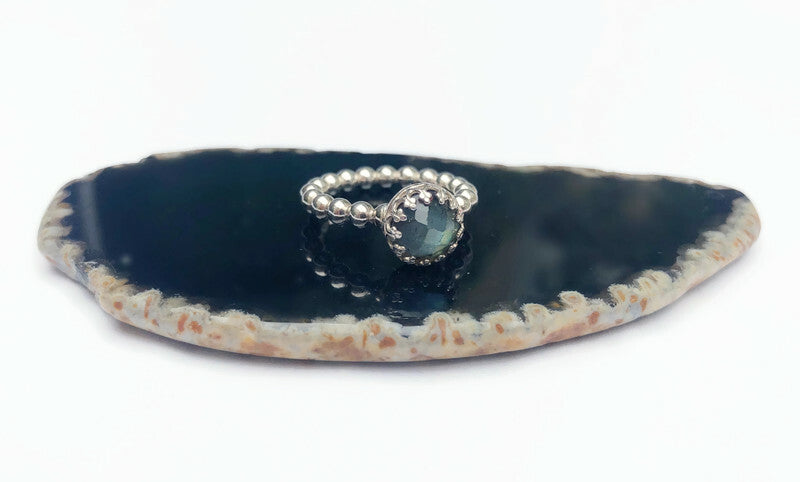 Entdecken Sie den magischen Reiz unseres Silberrings mit einem wunderschönen Labradorit-Stein. Dieser einzigartige Zusatzring vereint Eleganz mit Mystik. Der Ring ist aus hochwertigem Silber gefertigt und verfügt über eine stabile Perldrahtschiene, die für einen edlen und zeitlosen Look sorgt.
