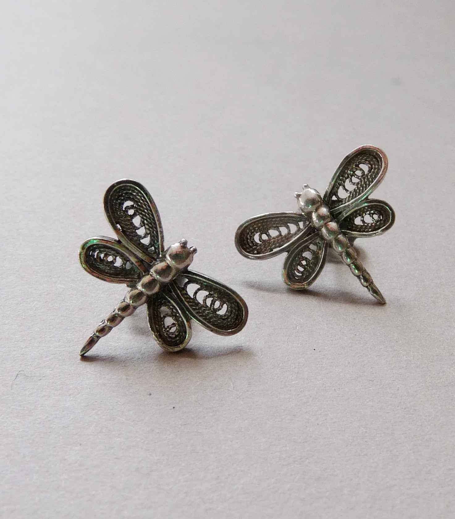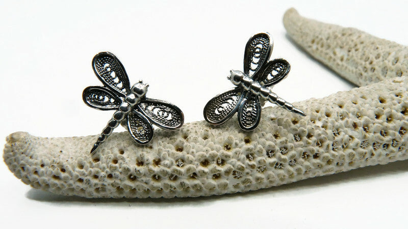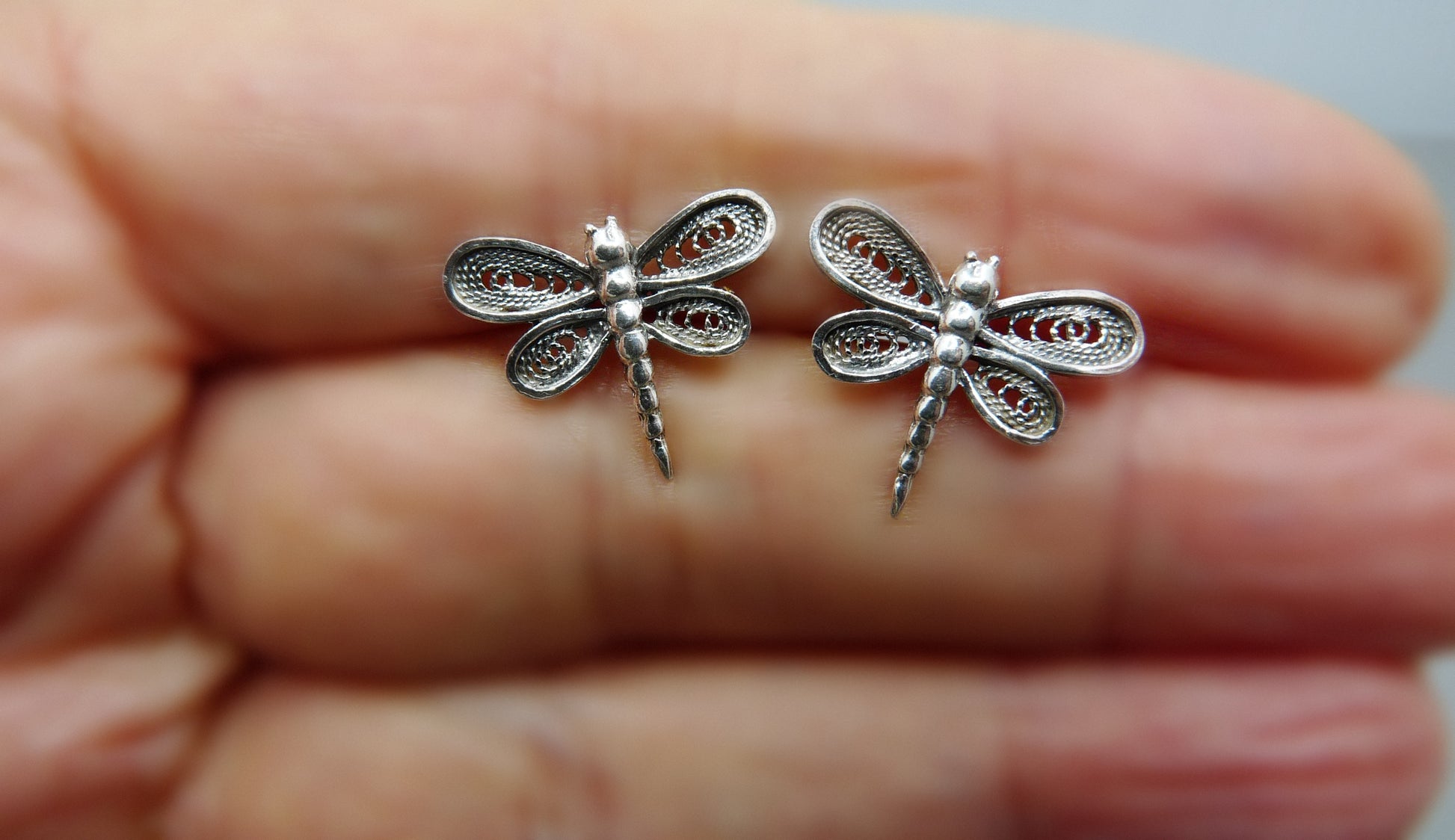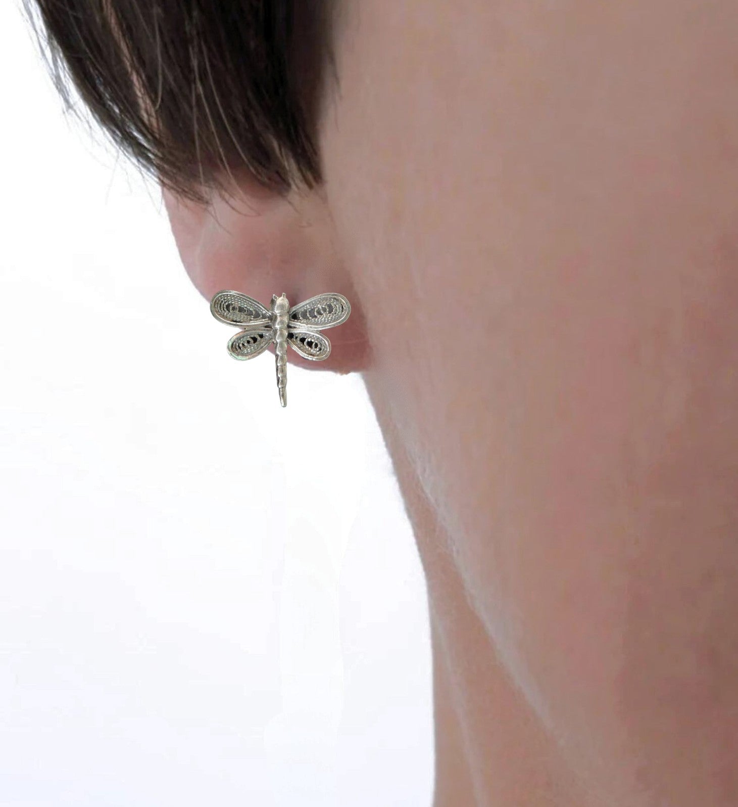Ein anmutiges und besonderes Paar Libellen-Ohrringe, handgefertigt in Filigranarbeit. Obwohl diese Ohrstecker aus Sterlingsilber supersüß sind, sehen sie aufgrund der speziellen Technik, mit der sie hergestellt werden, auch sehr elegant und raffiniert aus und fühlen sich robust und solide an.