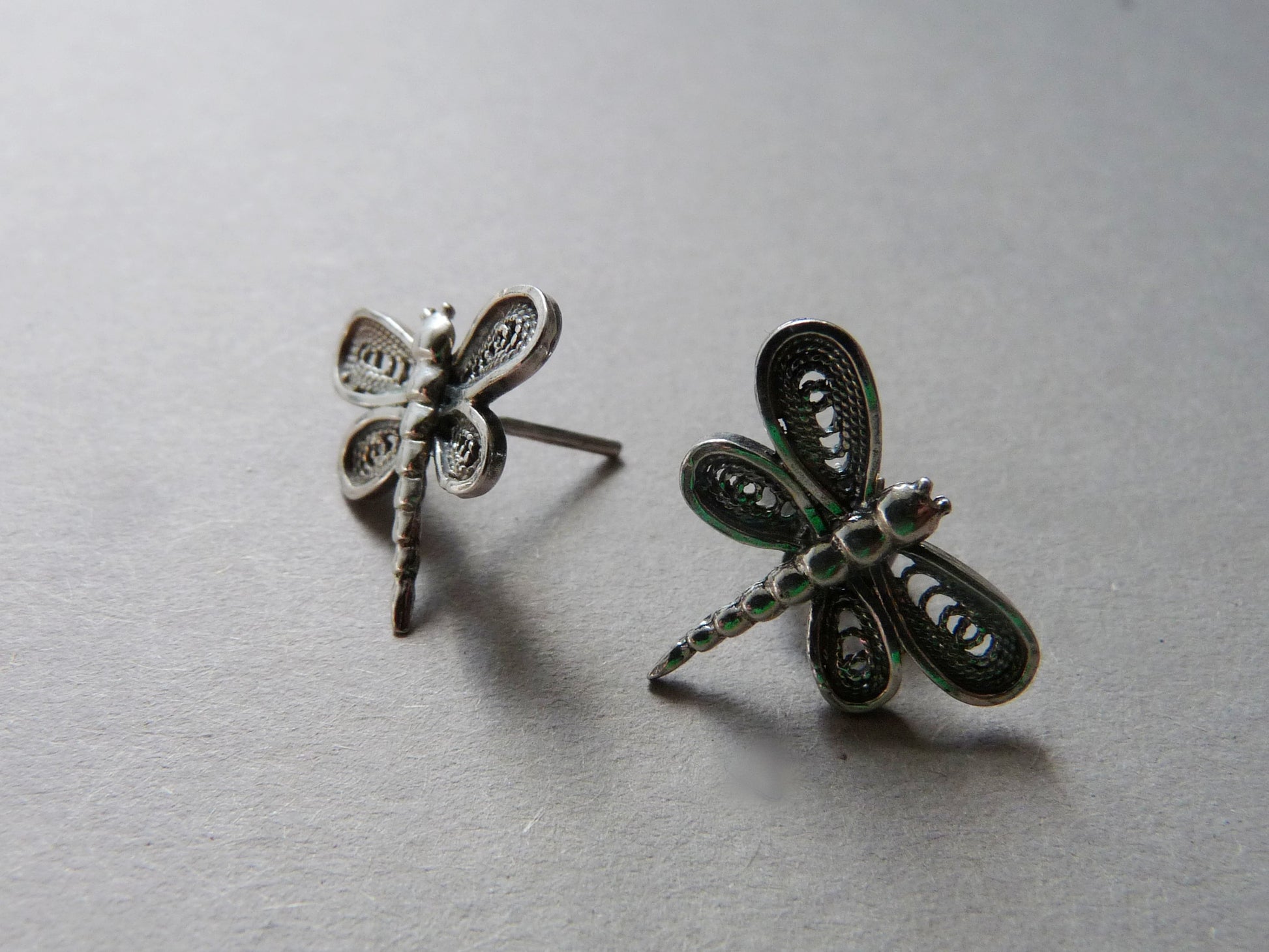 Silberne Libellen-Ohrringe in Filigran, Ohrringe in dunklem Silber