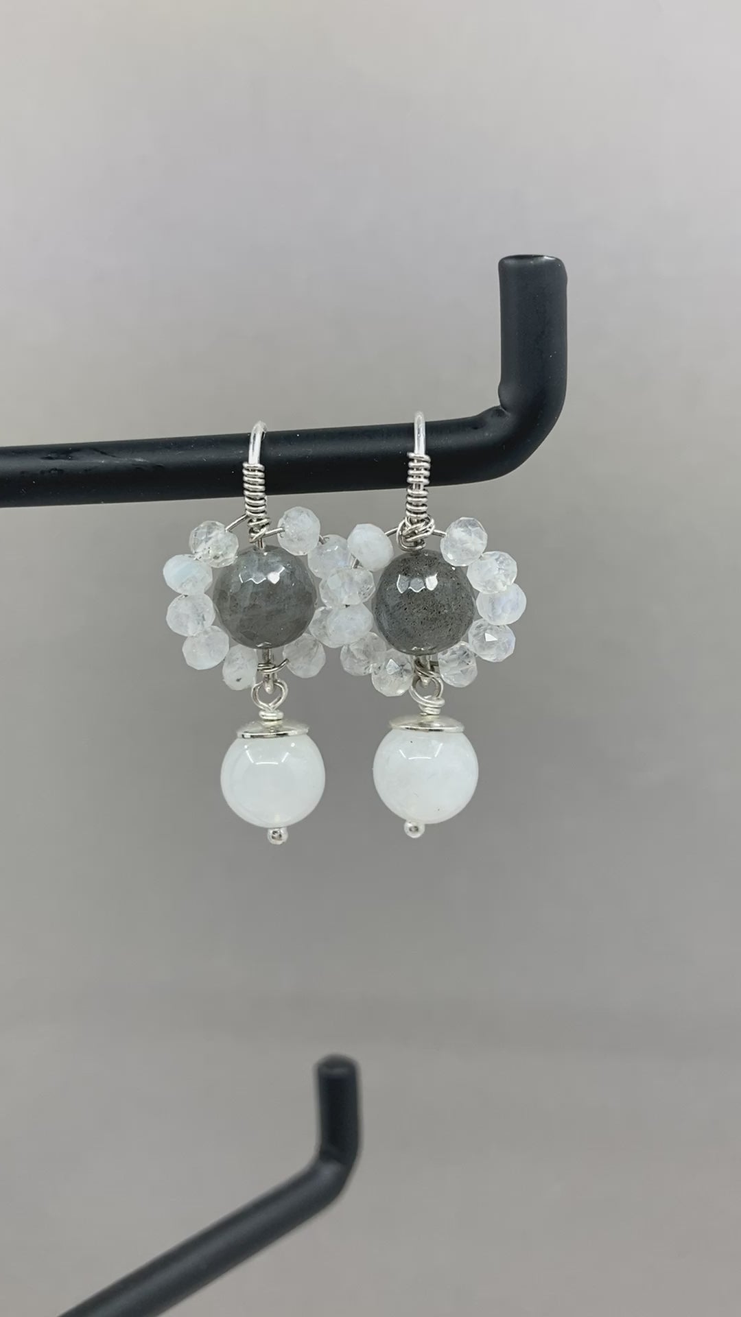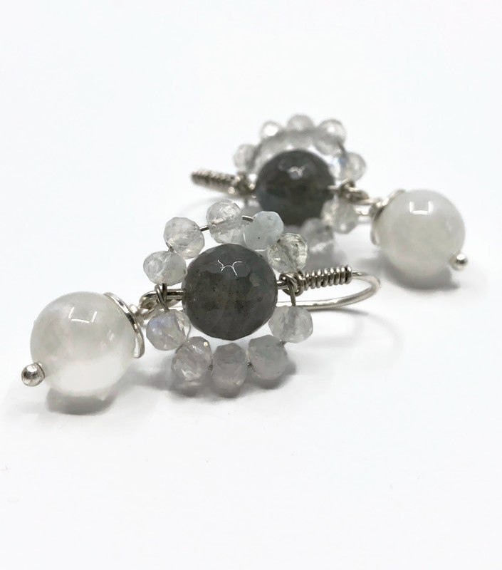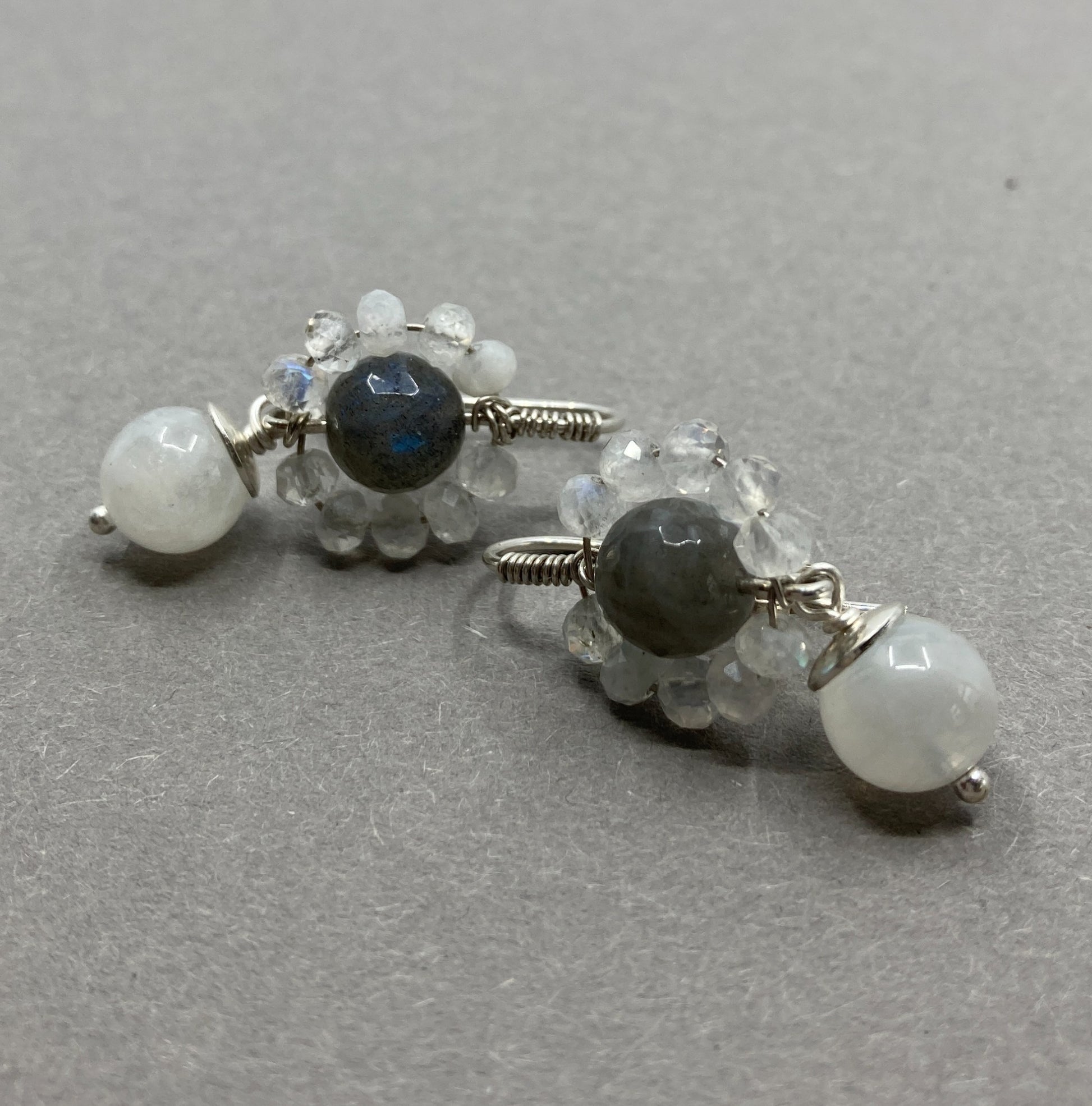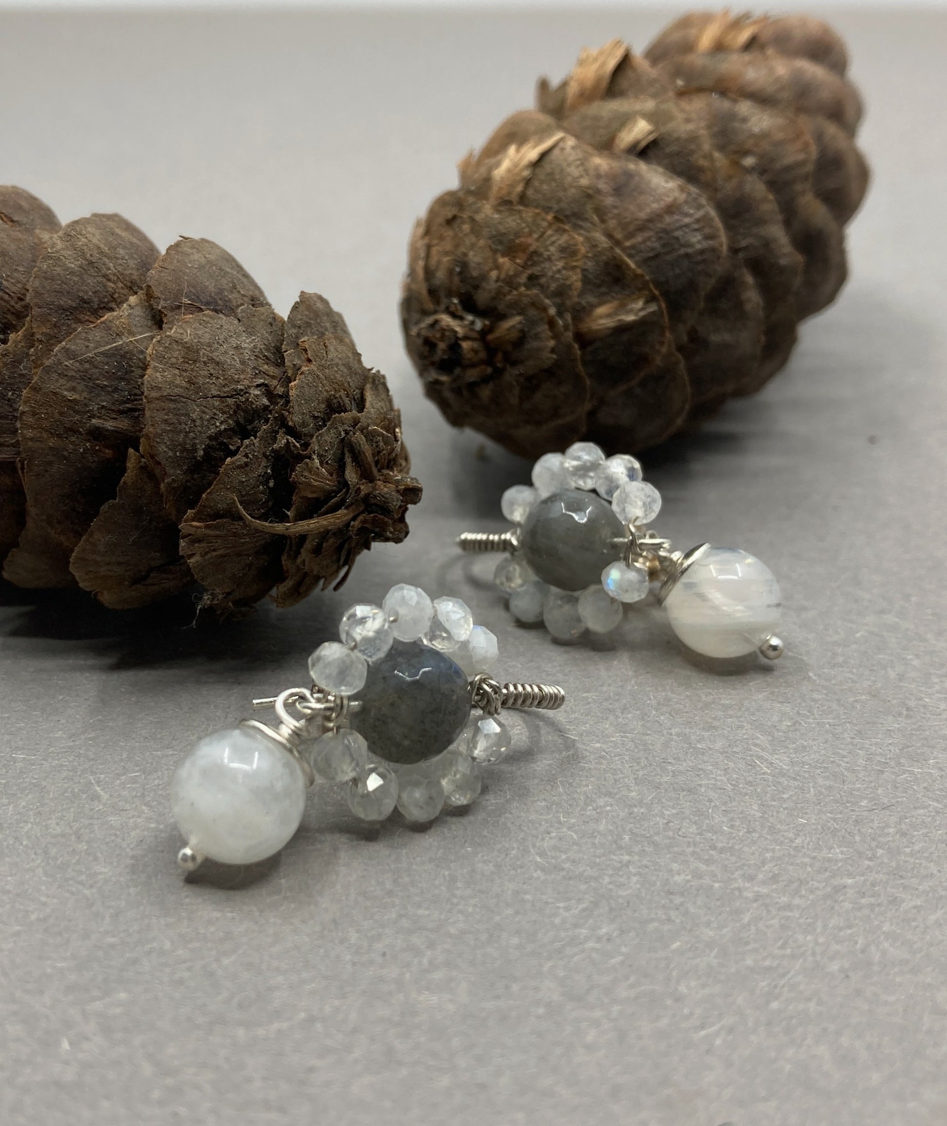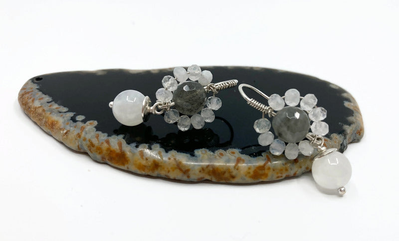 Silberne Blumenohrringe aus Mondstein und Labradorit