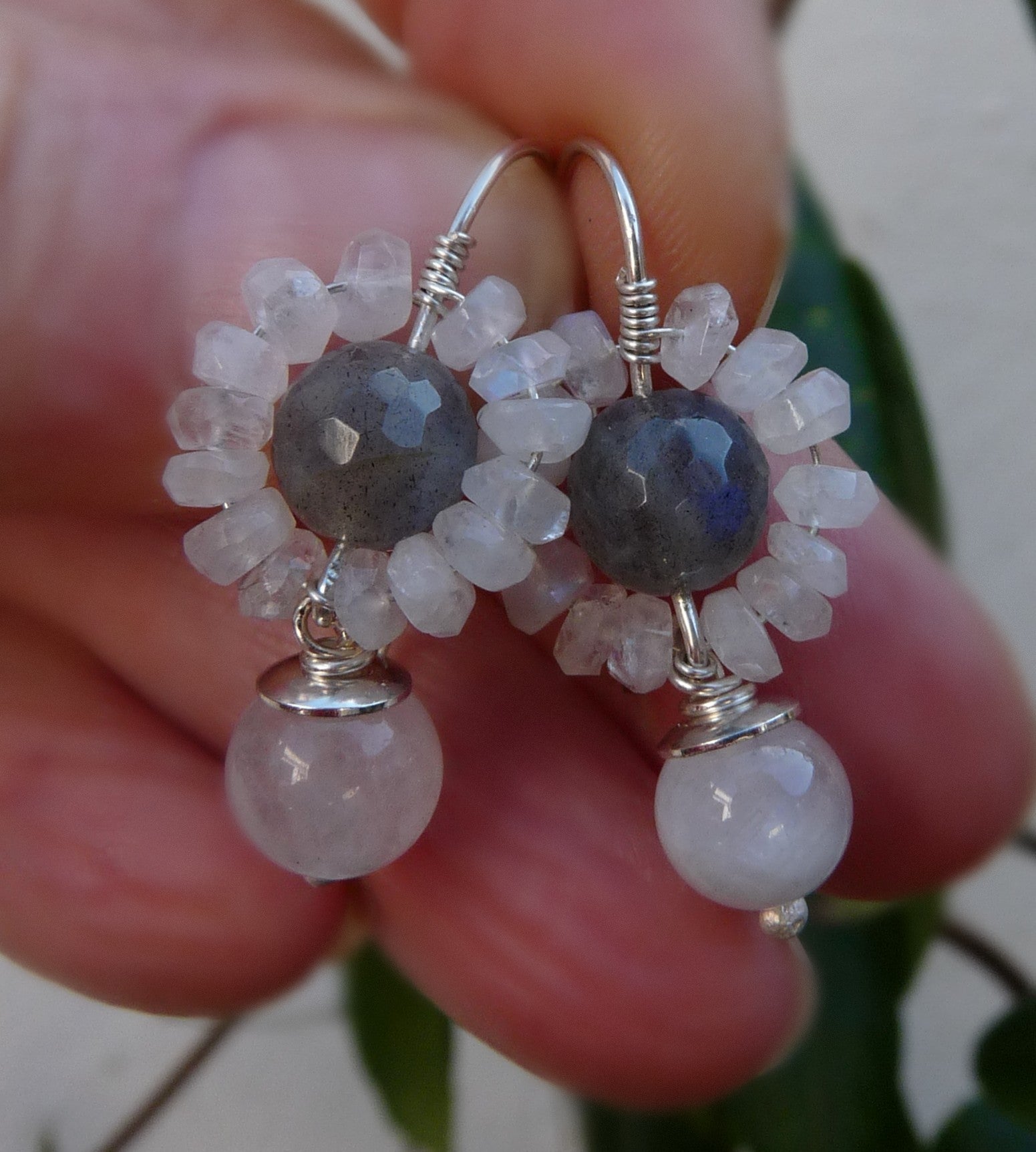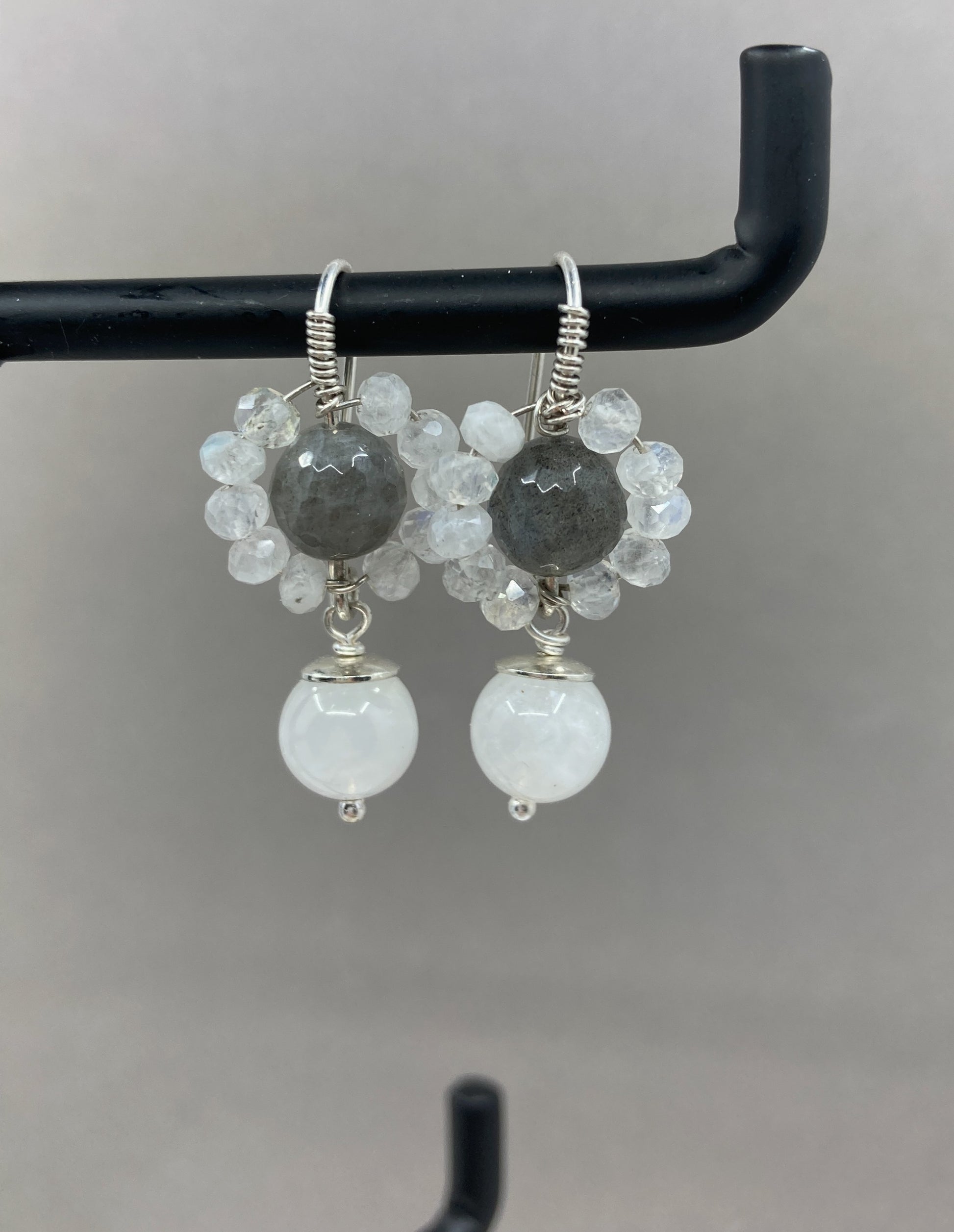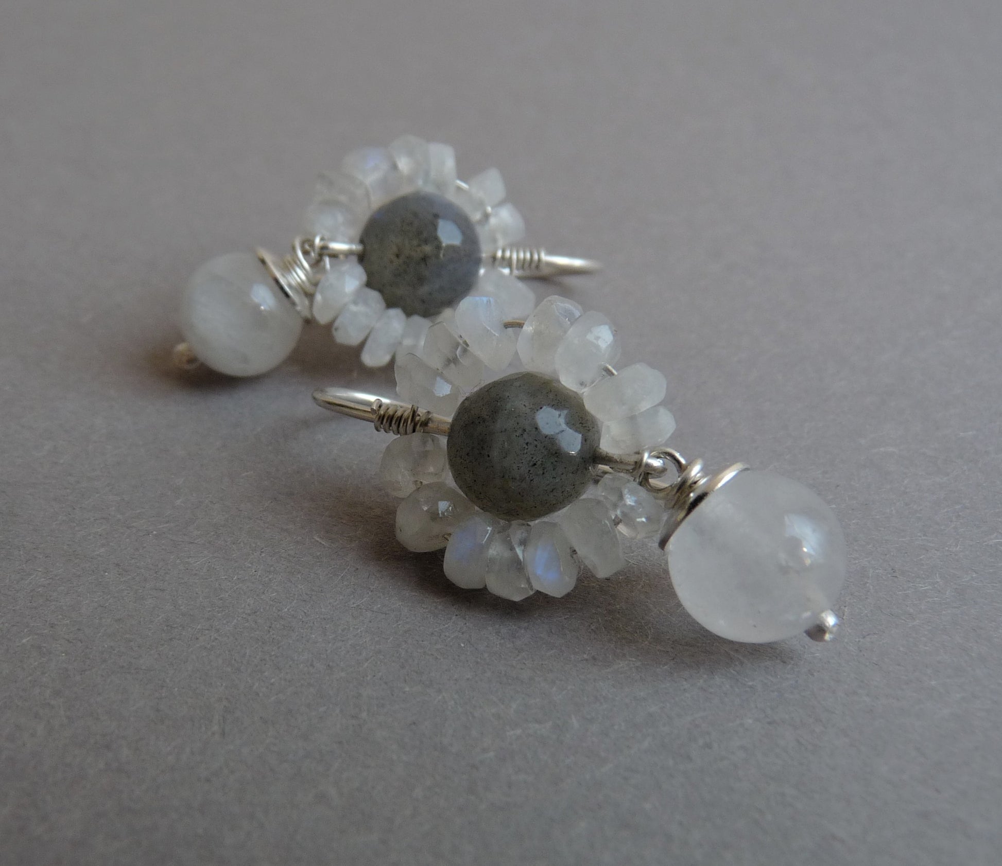 Silberne Blumenohrringe aus Mondstein und Labradorit