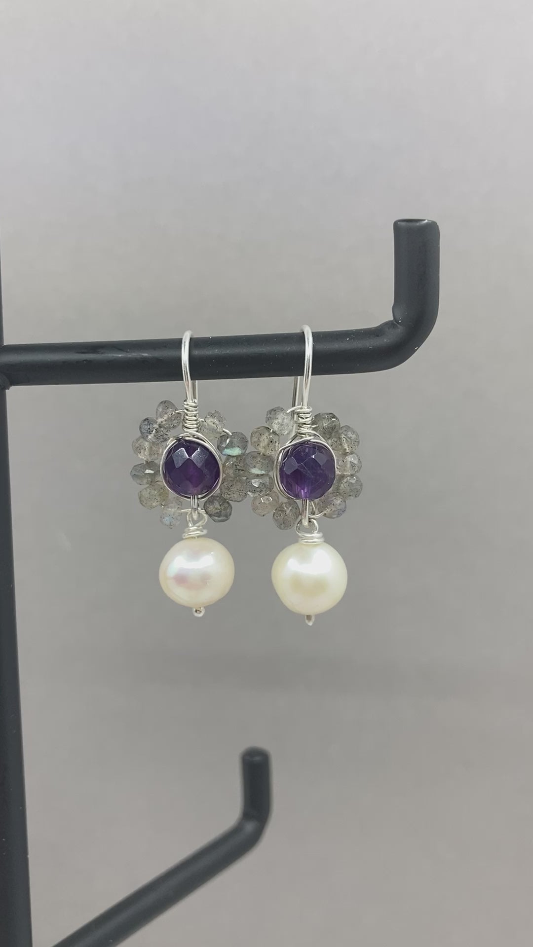 Dieses Paar handgefertigter Silberohrringe beweist, dass Labradorit eine wunderschöne Kombination mit Süßwasserperlen ist. Der tiefviolette Amethyst in der Mitte sorgt bei diesem Design für einen würzigen Akzent. Ein Set, das einem Hochzeitskleid mit Würde schmeichelt und mit seiner Eleganz zurückhaltend genug ist, um nicht sofort ins Auge zu fallen.