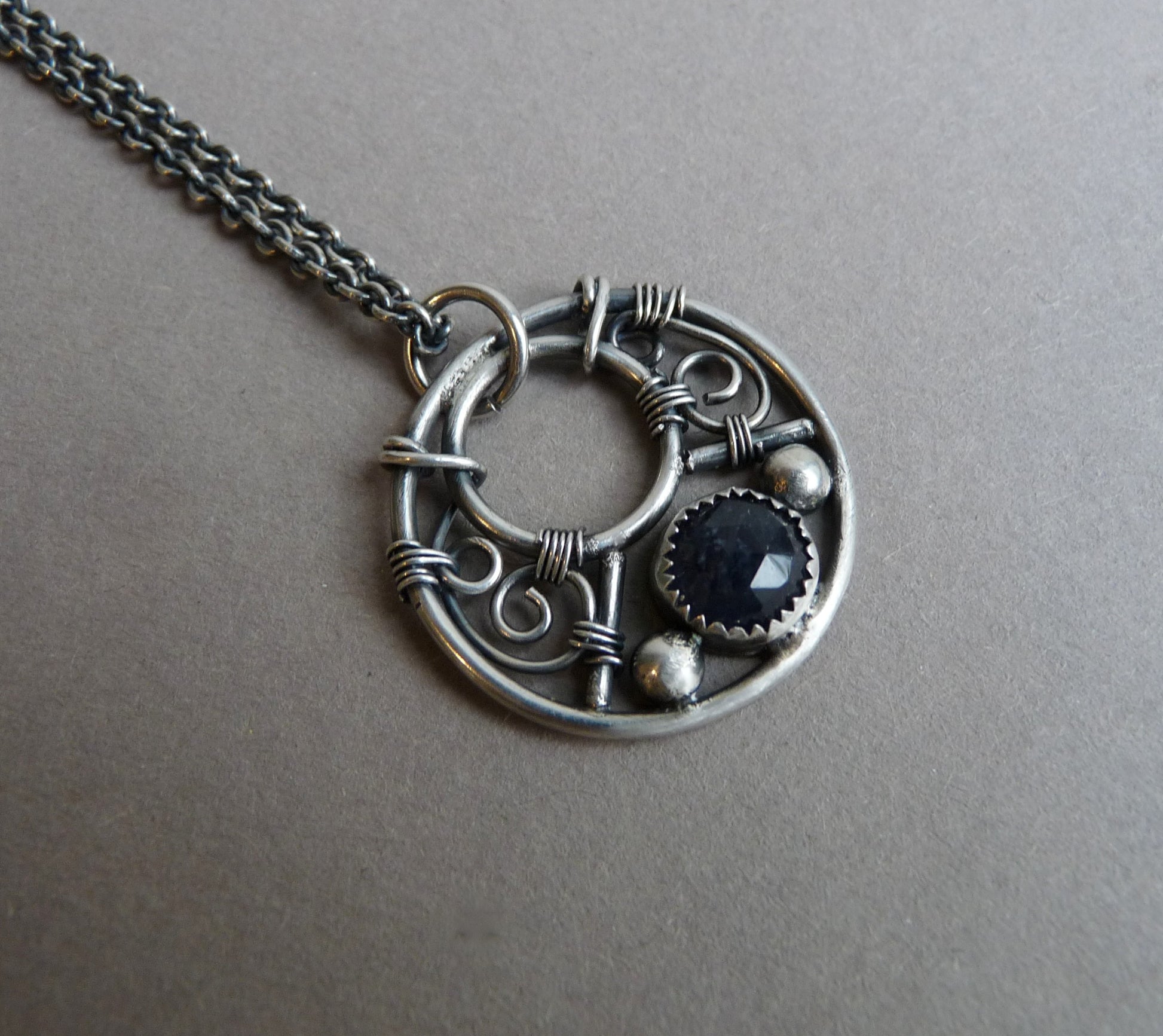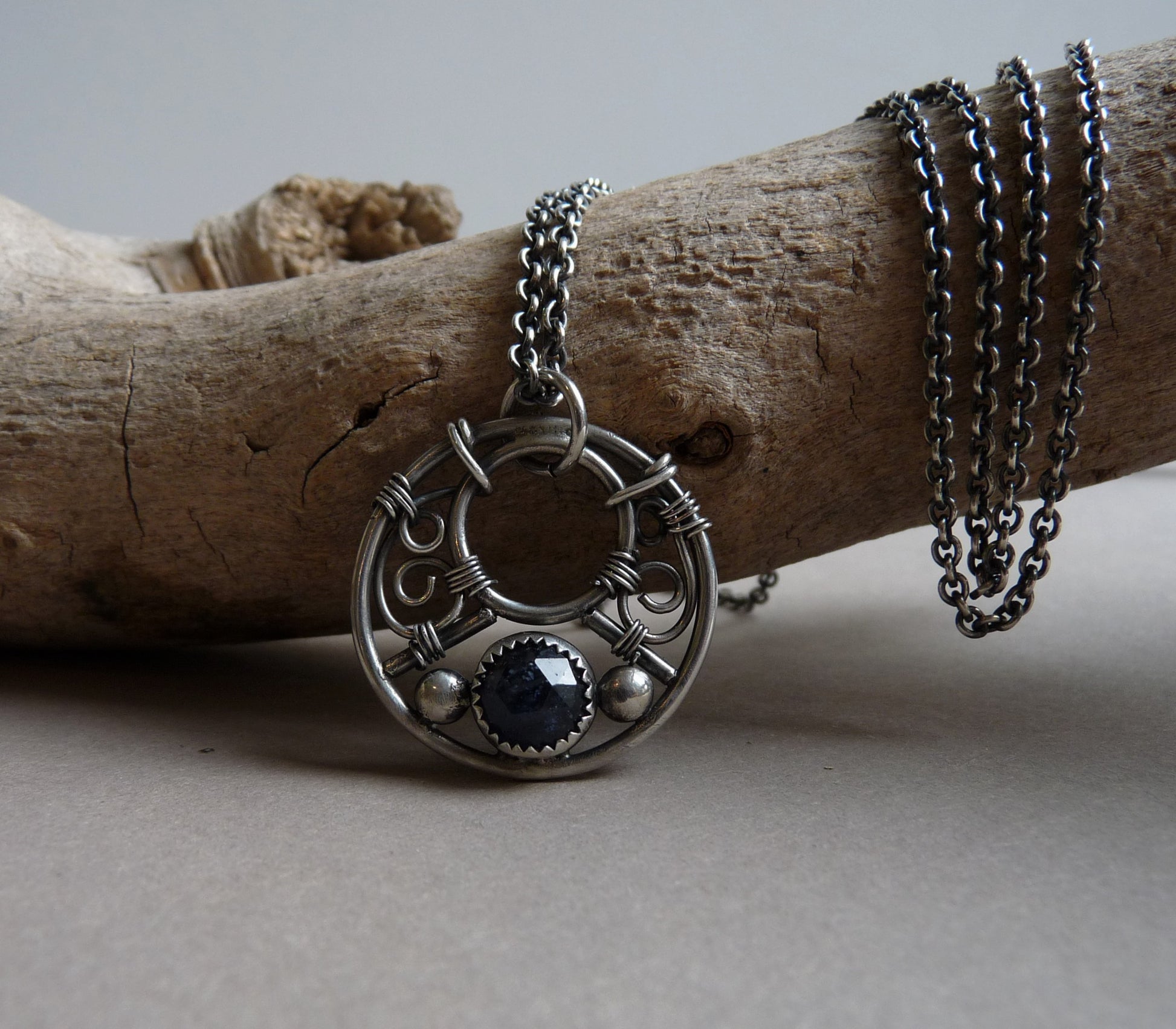 The pendant (2.5 cm) is crafted from solid silver and refined with elegant wire patterns. At its center shines a faceted 8 mm iolite, a gemstone known for its deep, mystical blue and subtle sparkle. This stone gives the necklace a powerful, masculine look and makes it a real eye-catcher.