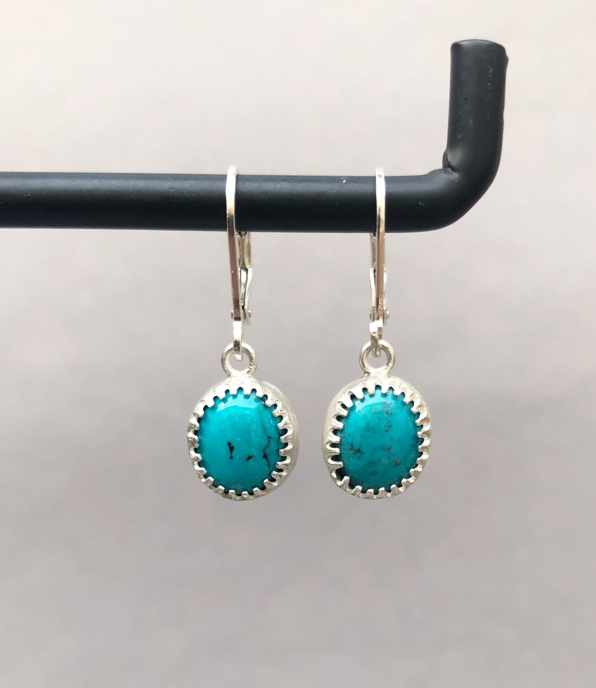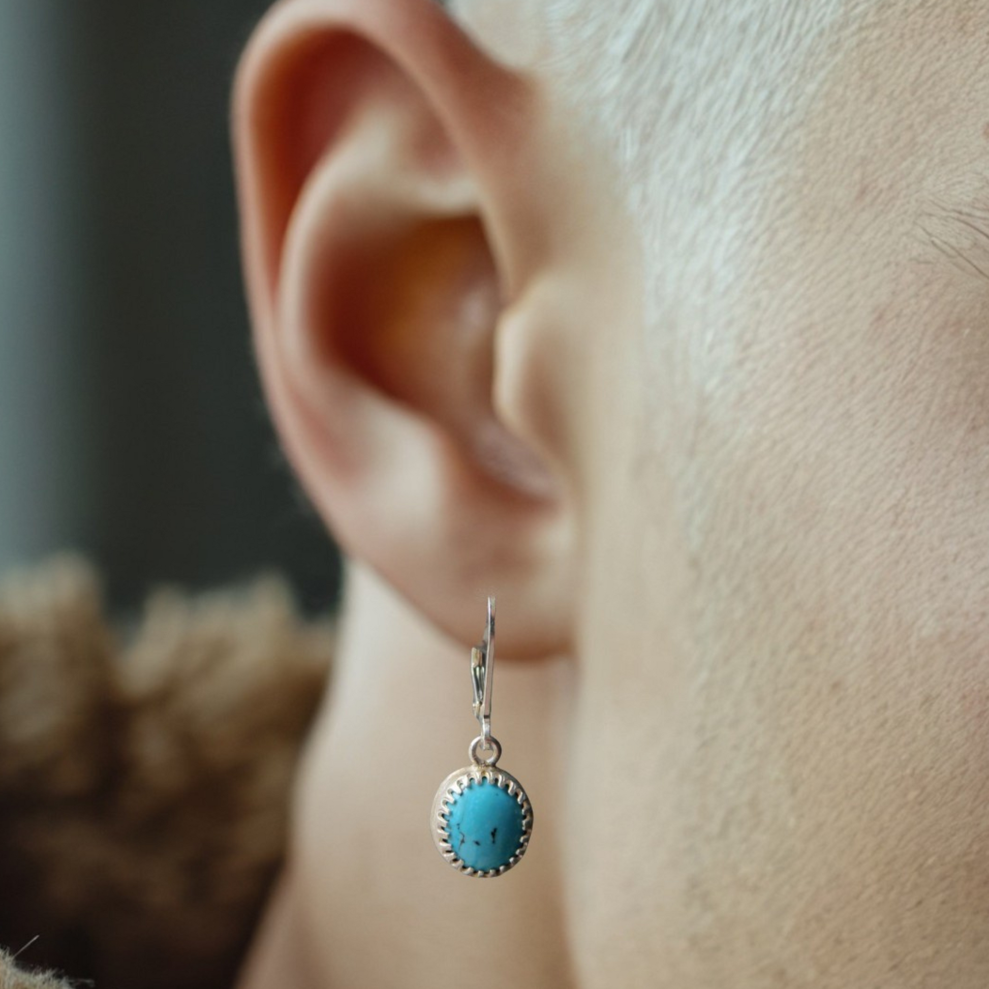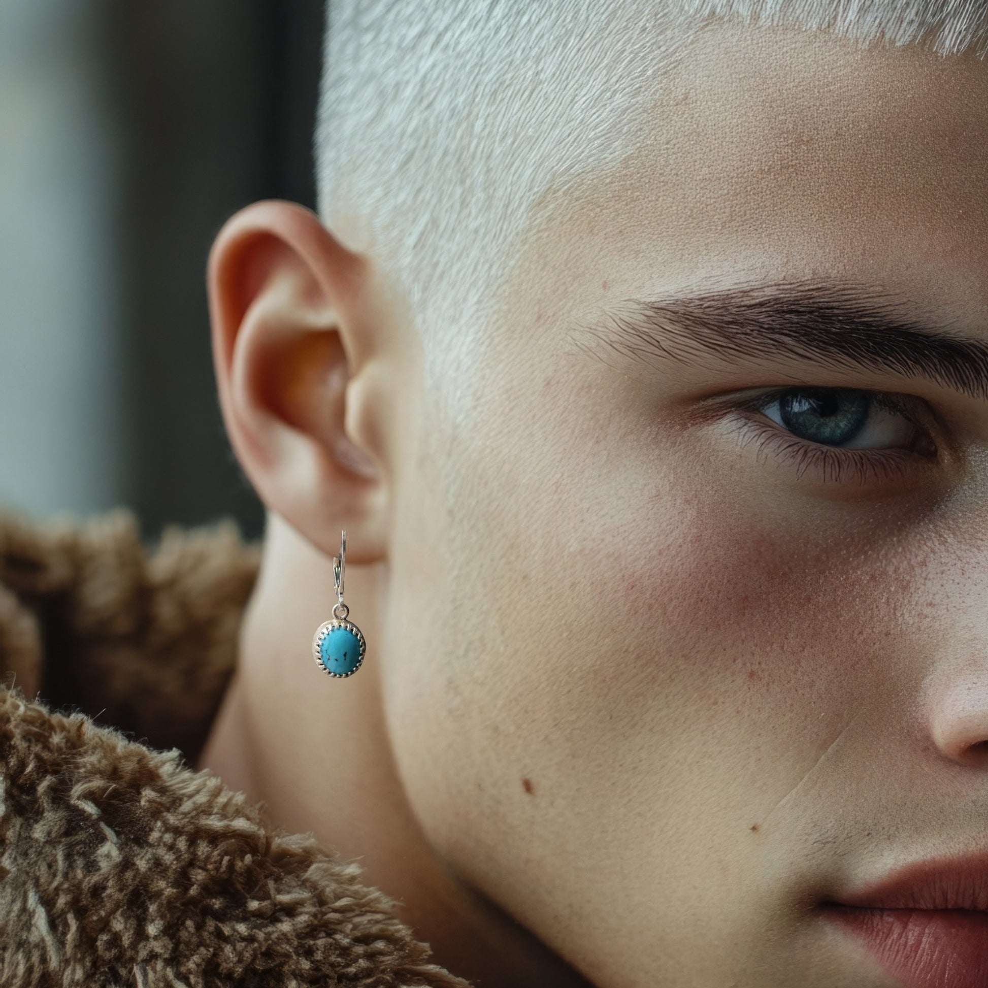 These handmade sterling silver earrings for men are finished with deep blue turquoise. The stone adds a subtle bohemian touch, and its natural color makes them perfect for everyday wear or special occasions.