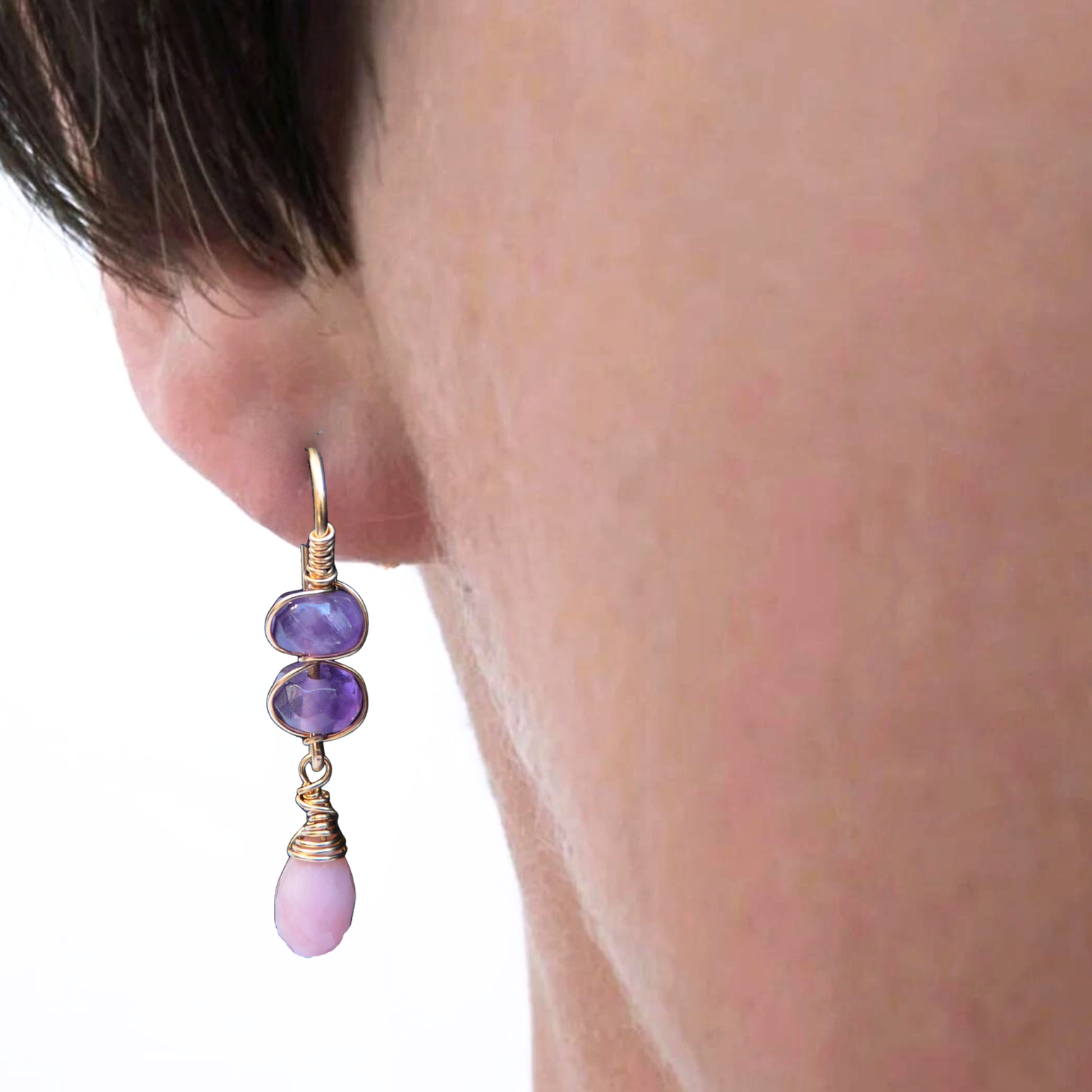 De oorbellen meten circa 3,5 cm vanaf het haakje en omlijsten het gezicht subtiel zonder zwaar te dragen. De fijne gouden haakjes zitten comfortabel, terwijl de sprankeling van Amethist en de natuurlijke gloed van Opaal elke outfit verrijken – van dagelijkse looks tot formele gelegenheden.