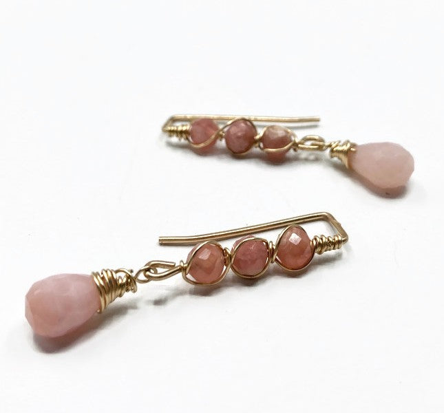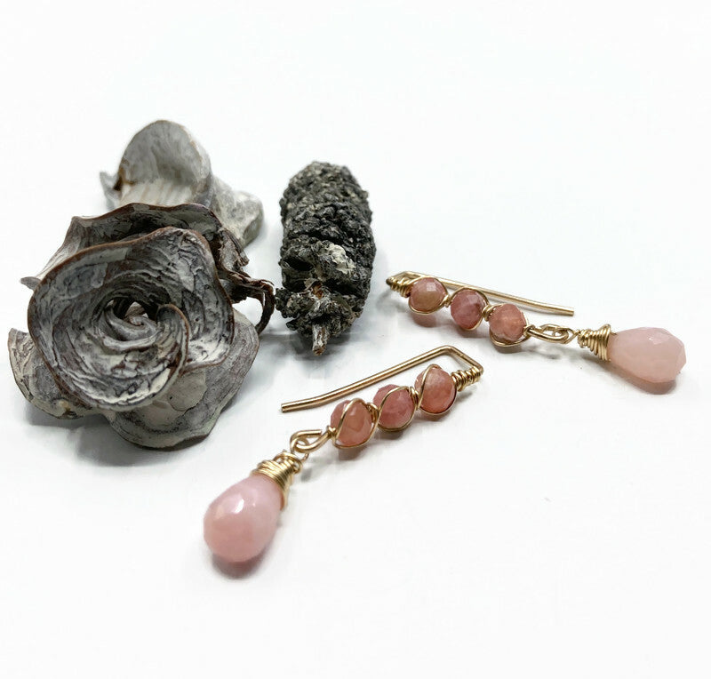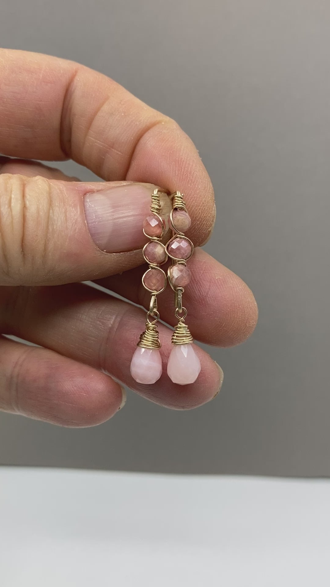 Ik maak ze graag omdat ze super stijlvol zijn! Voor dit paar heb ik 14K Goldfilled draad gebruikt, gecombineerd met sprankelende Rhodochrosiet kralen en prachtige roze Opaal druppels.