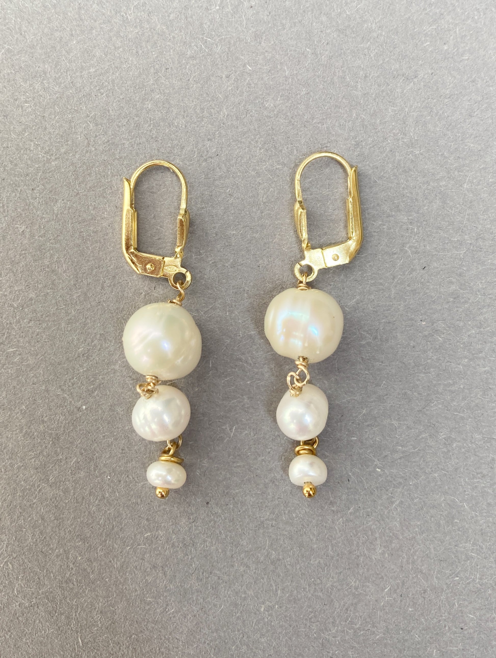 Dit paar 14K Goldfilled oorbellen is voorzien van drie zoetwaterparels in verschillende maten, wat een dynamisch en sprankelend effect creëert. Deze variatie in grootte zorgt voor een speelse maar verfijnde uitstraling, perfect voor elke gelegenheid. De parels hangen sierlijk aan haakjes van geelgoud verguld op zilver, wat de oorbellen een luxueuze afwerking geeft.