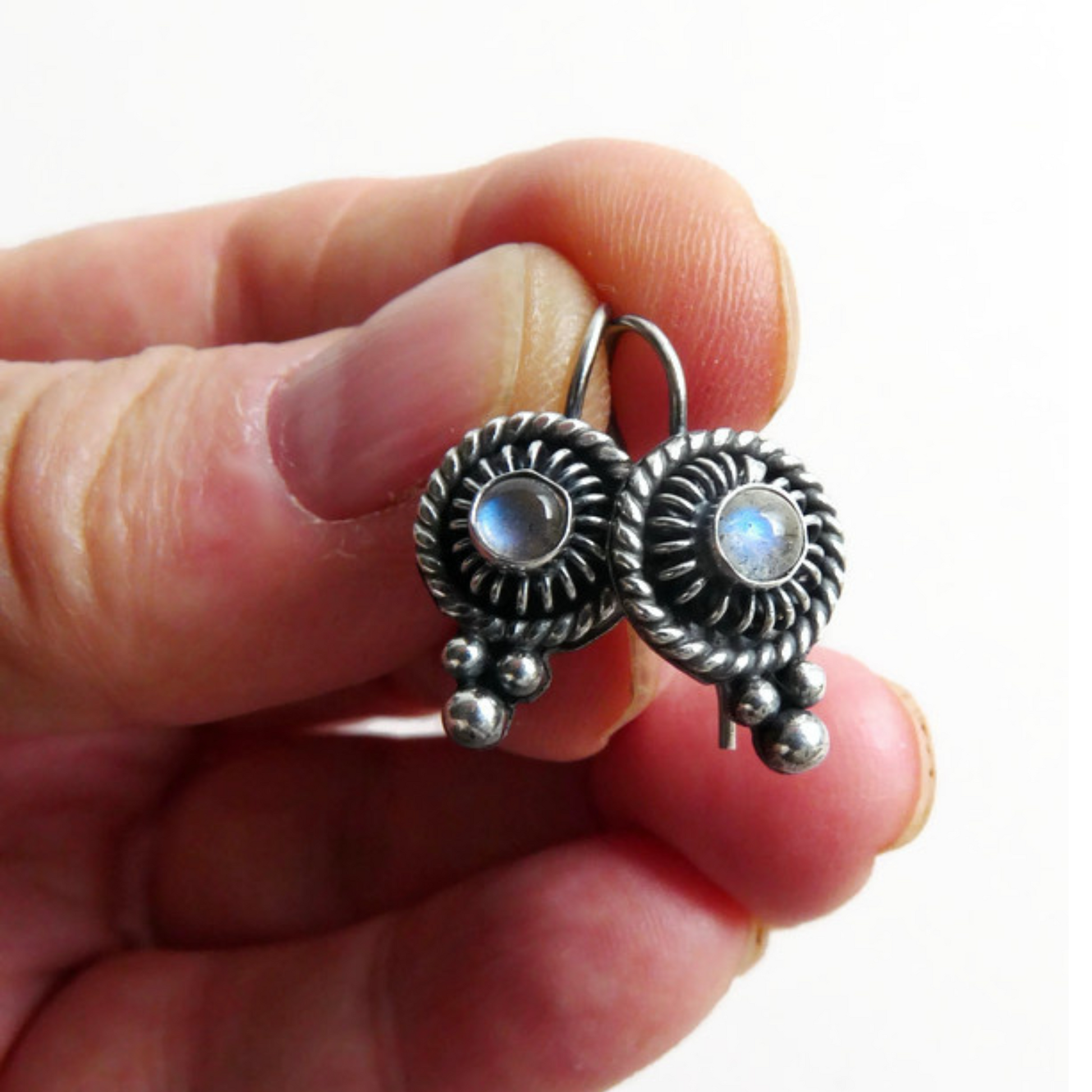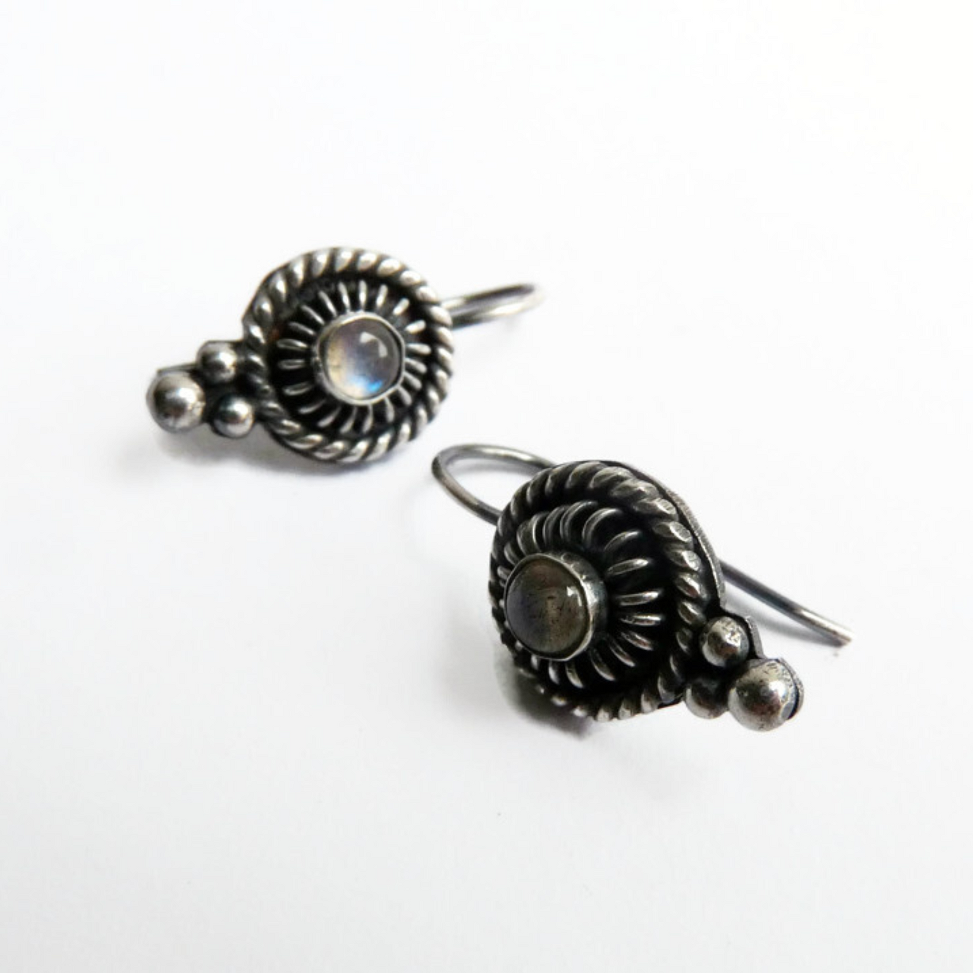 Laat je betoveren door deze handgemaakte oorbellen, waarin traditie en eigentijds design samenkomen. Het unieke ontwerp is geïnspireerd op de oud-Hollandse spinnetjes, maar kregen een frisse en elegante update. In het hart van elk spinnetje schittert een zorgvuldig gezette 4 mm Labradoriet, een edelsteen die bekend staat om zijn mysterieuze, blauwgrijze gloed.