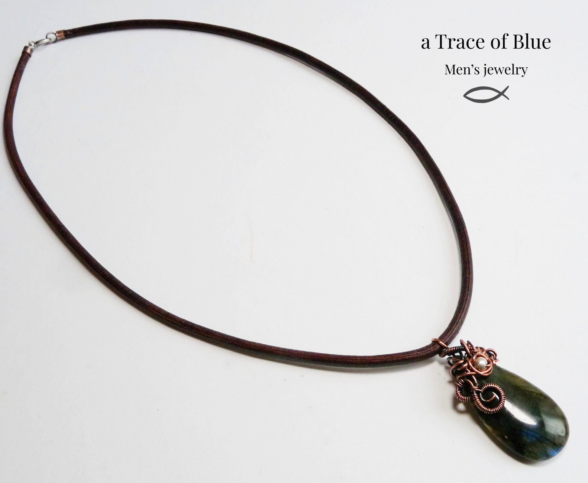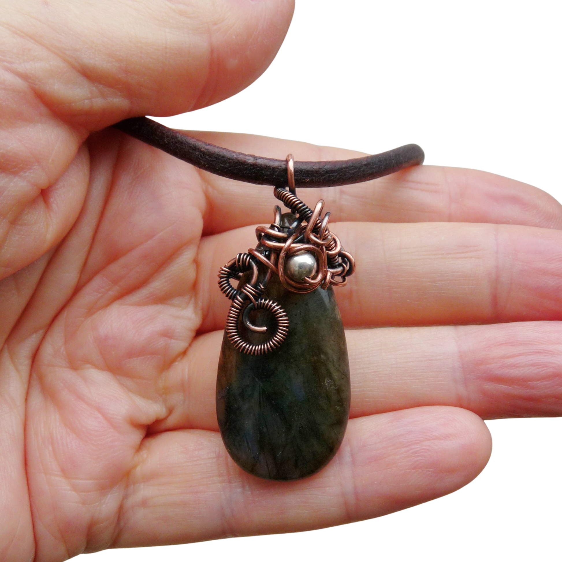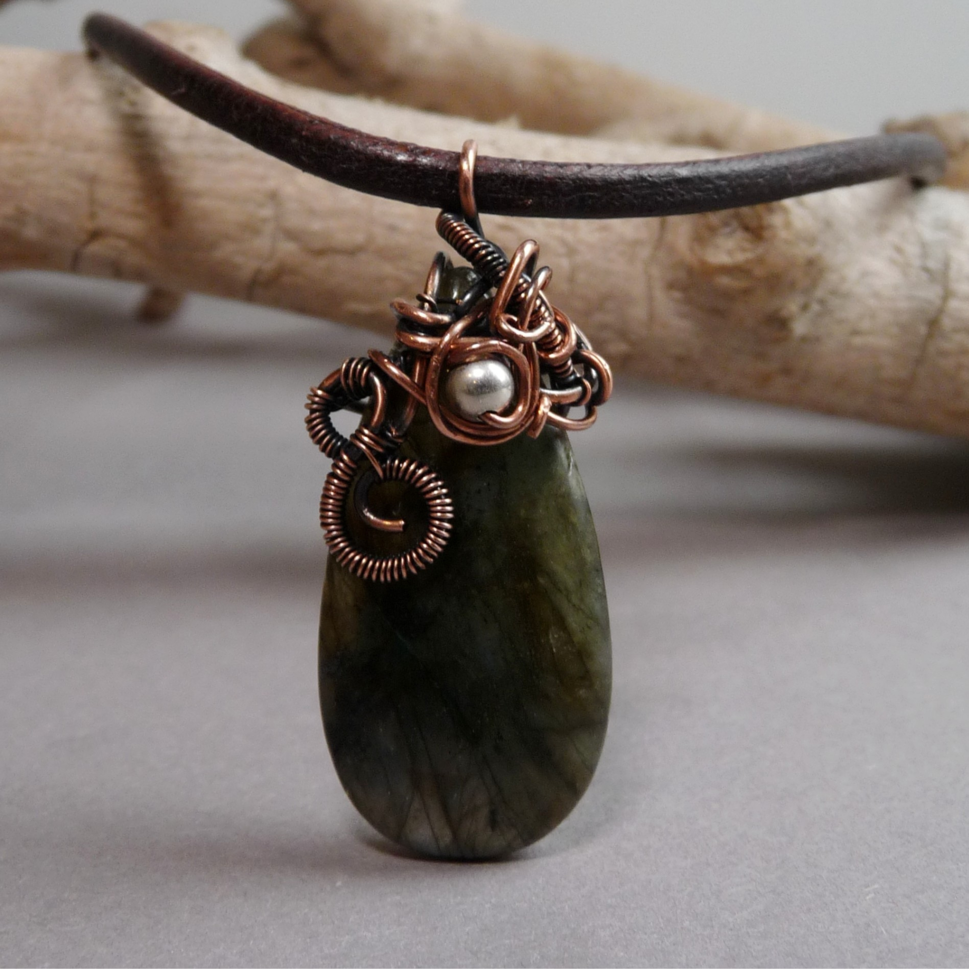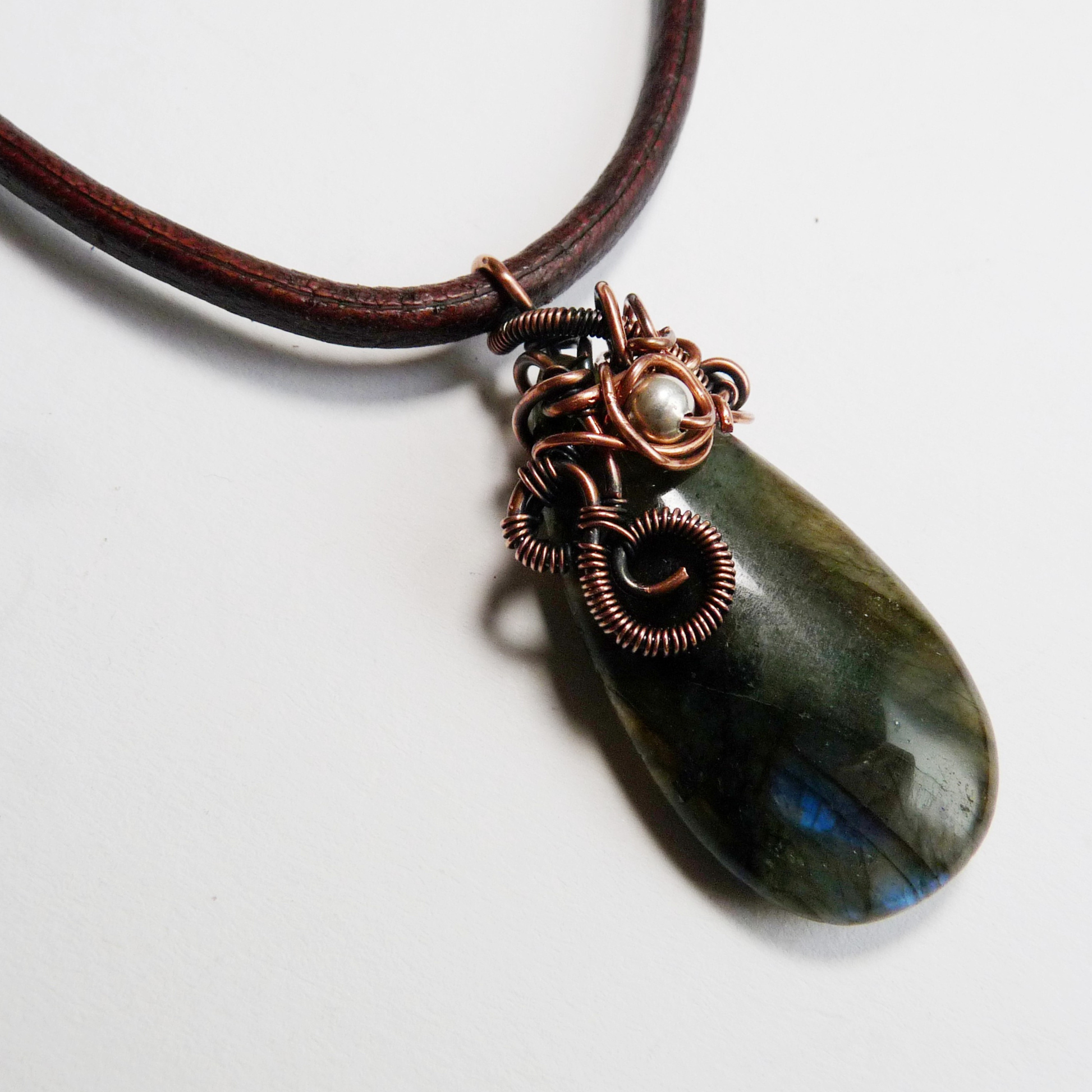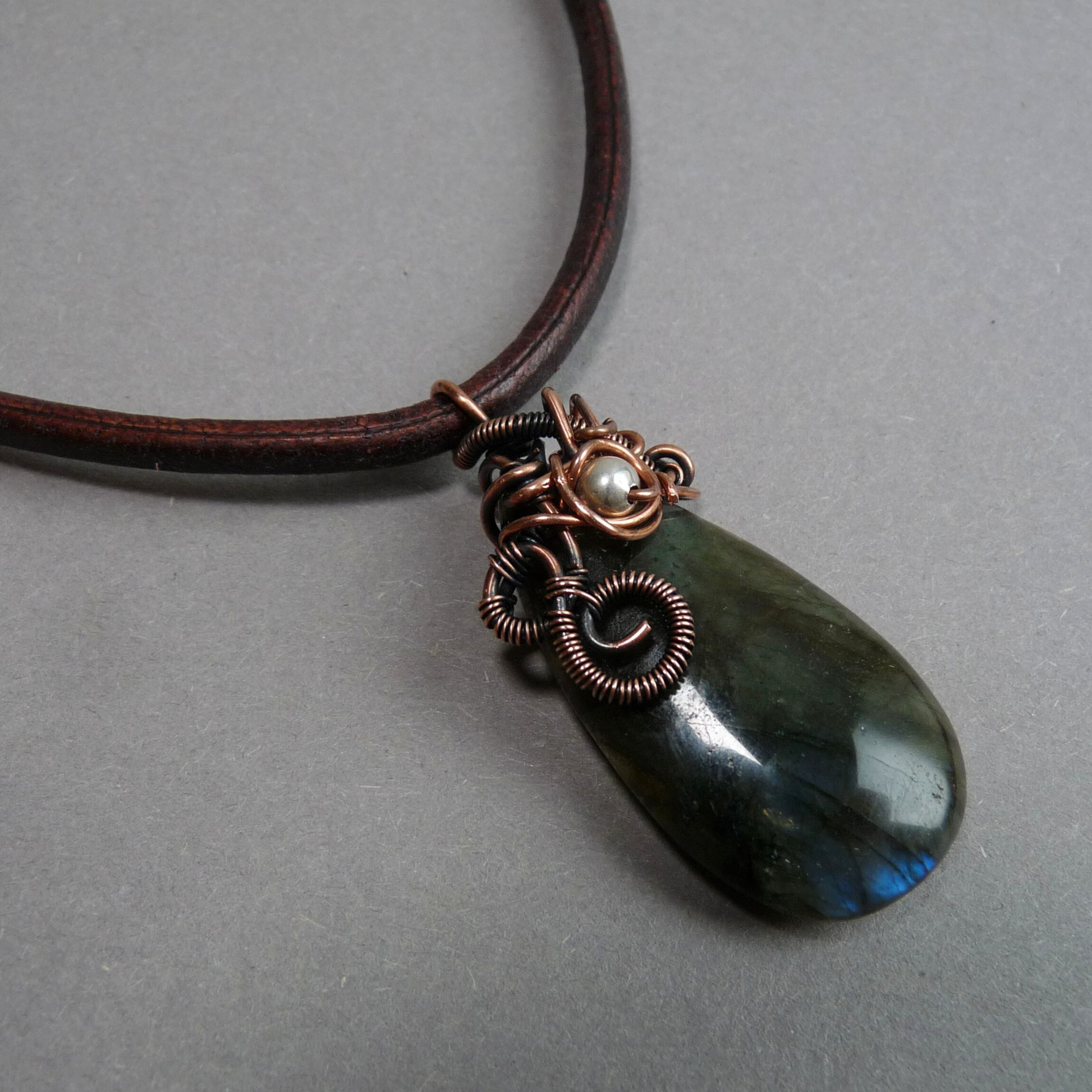 Materiaal: Labradoriet, geoxideerd koperdraad, leer, zilver (slot en oogjes)