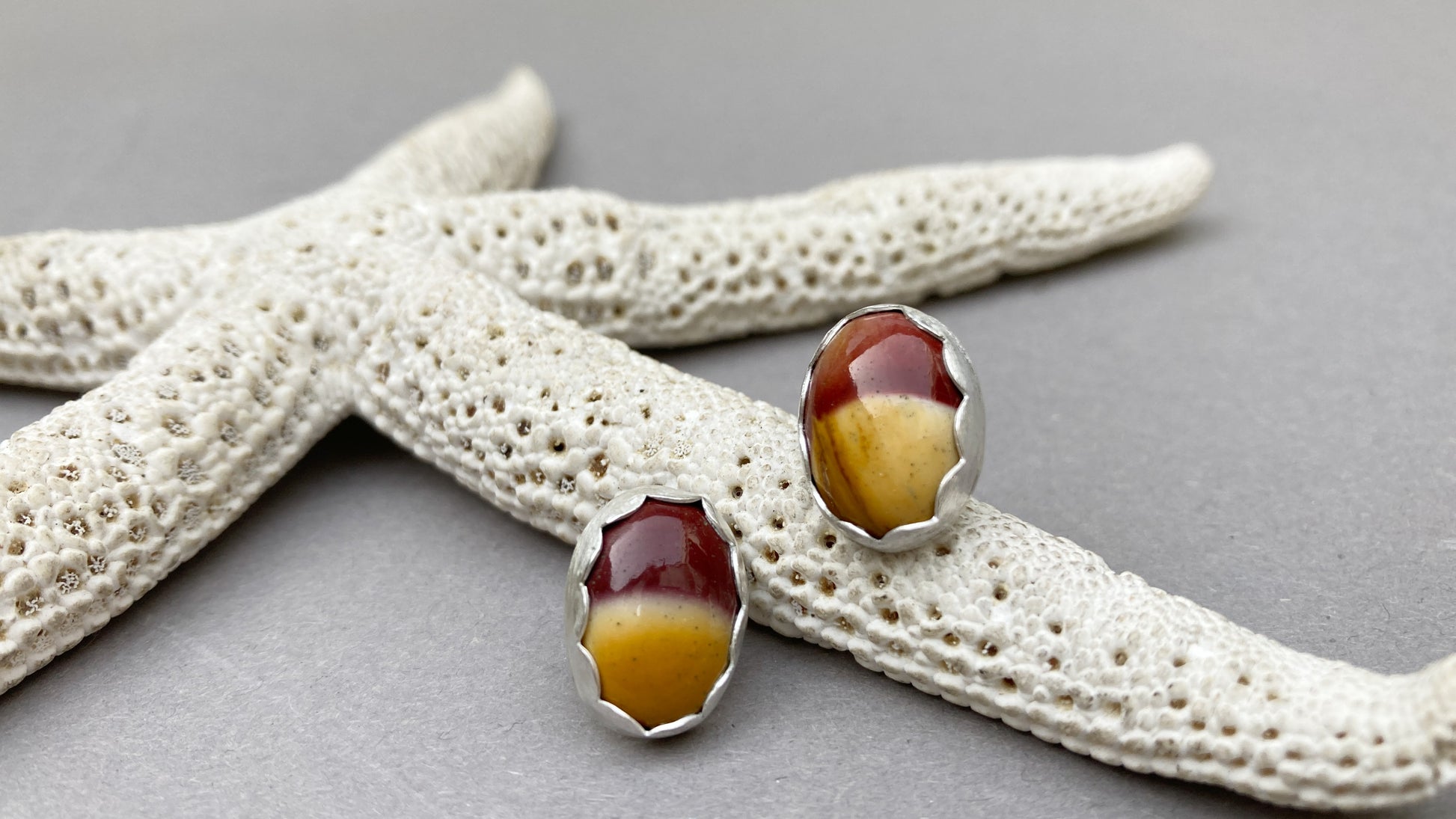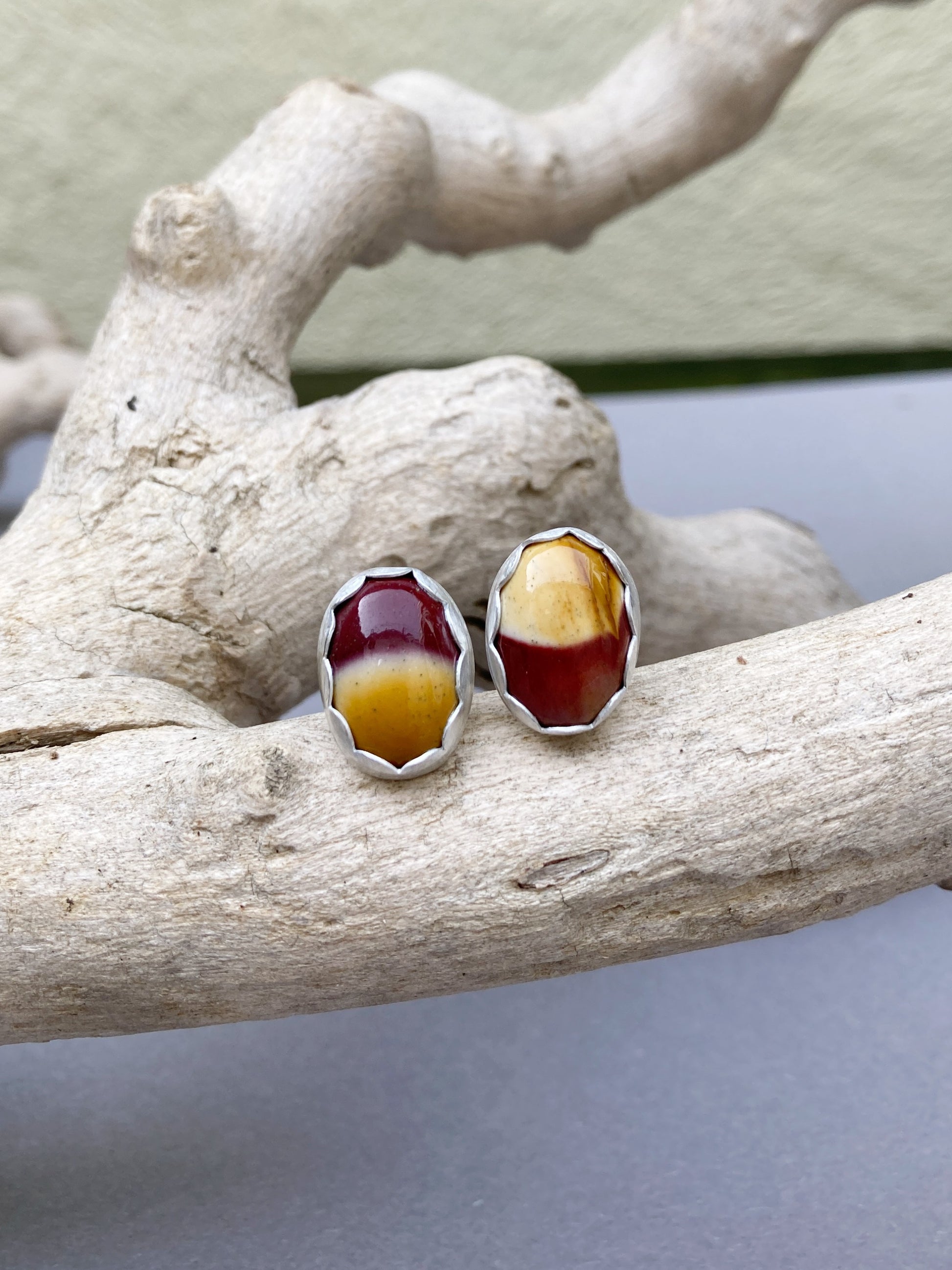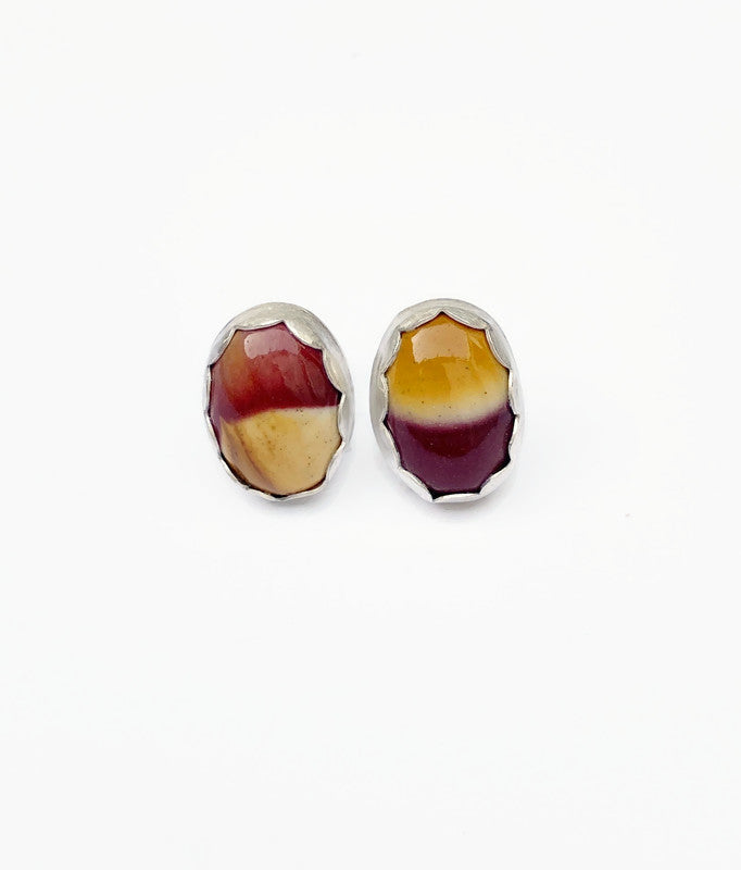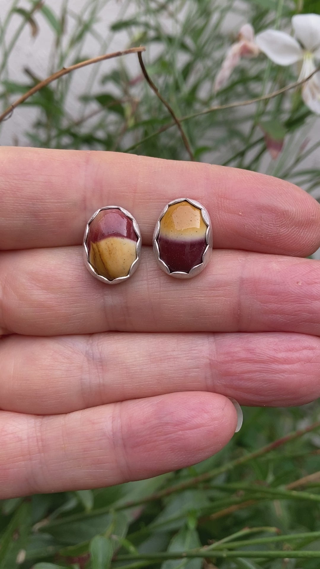 Een paar bijzondere zilveren oorknopjes met Mookait gezet in een geschulpte rand. Het leuke van deze zilveren oorstekers is dat je ze tegengesteld van elkaar kunt dragen wat een speels effect geeft. Kenmerkend zijn de ustgevende energieën van Mookait in dit prachtig handgemaakte Sterling zilveren oorknopjes.