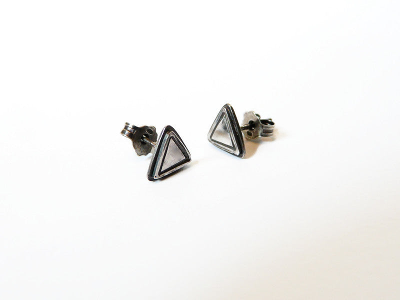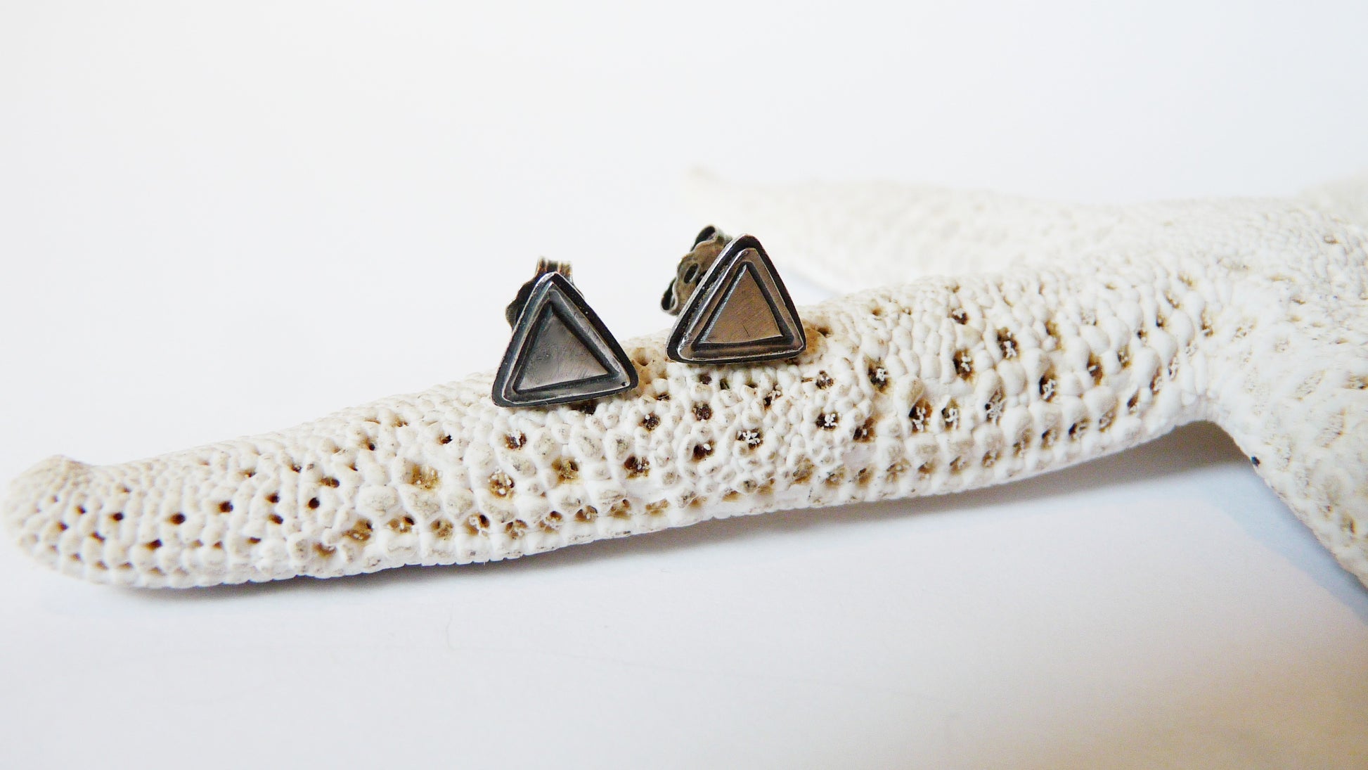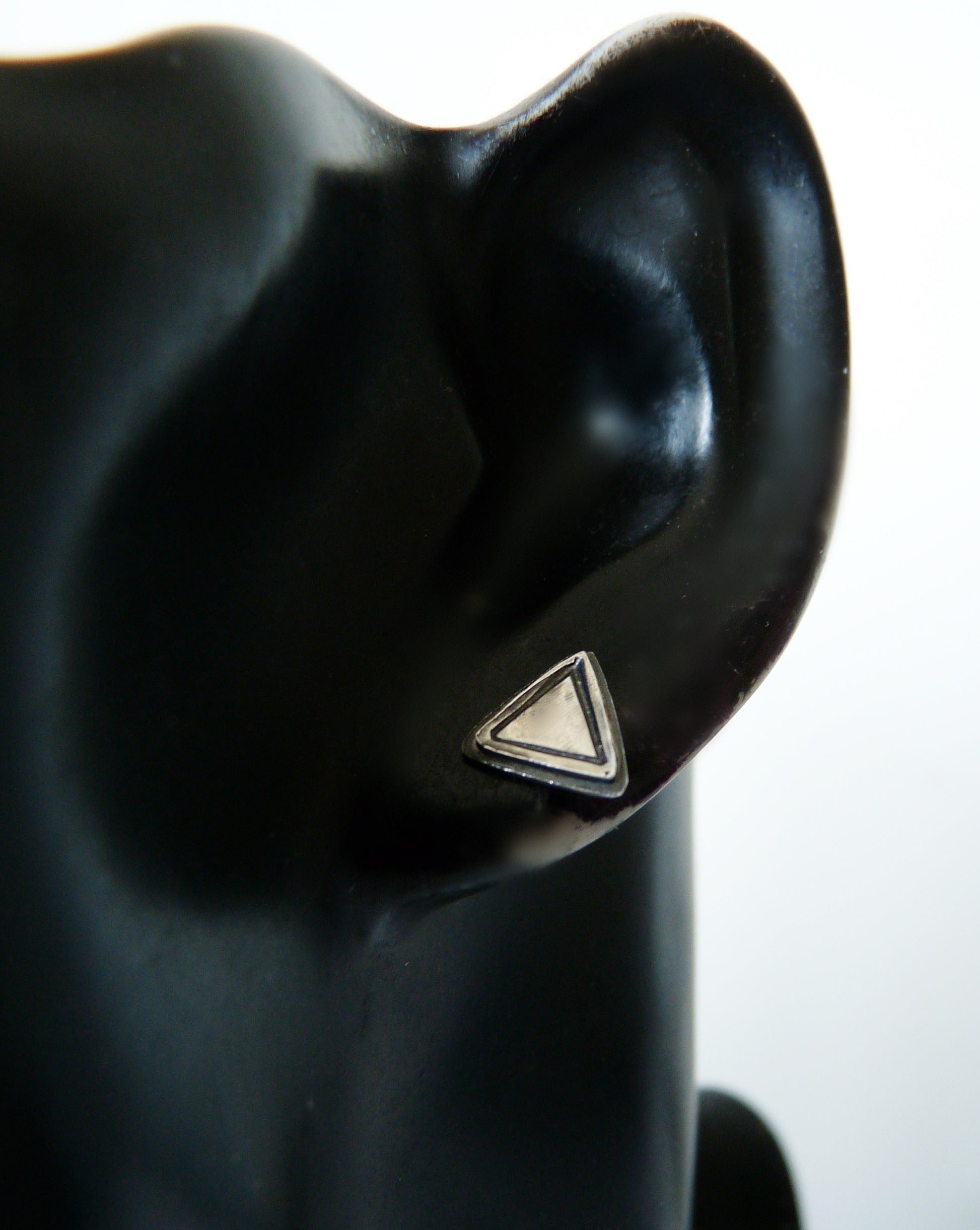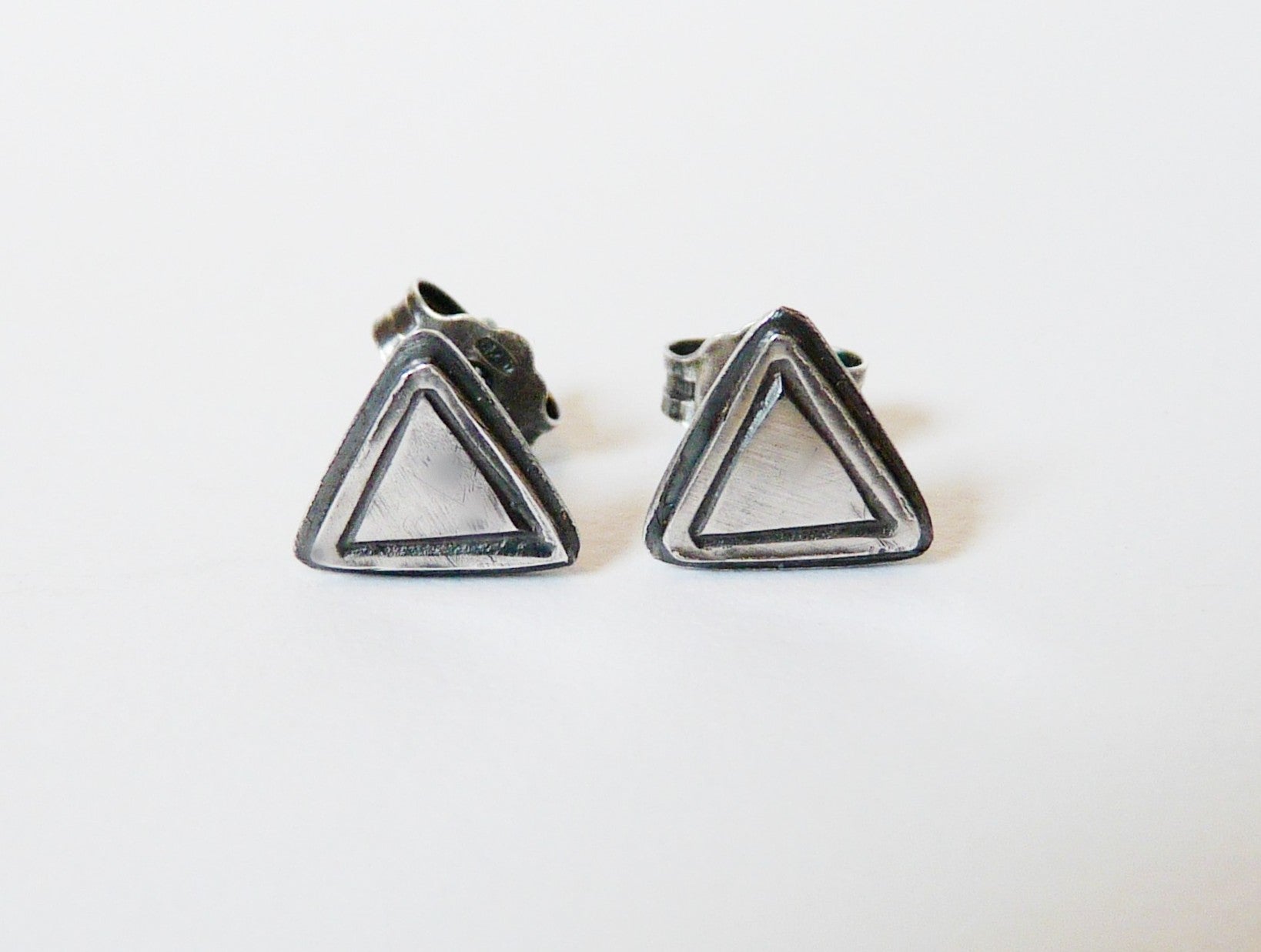 Ontdek de onweerstaanbare charme van onze hand-gestempelde, donker zilveren heren oorknopjes! Deze verfijnde, driehoekige oorbellen zijn het toppunt van minimalistische heren sieraden en stralen pure elegantie uit.
