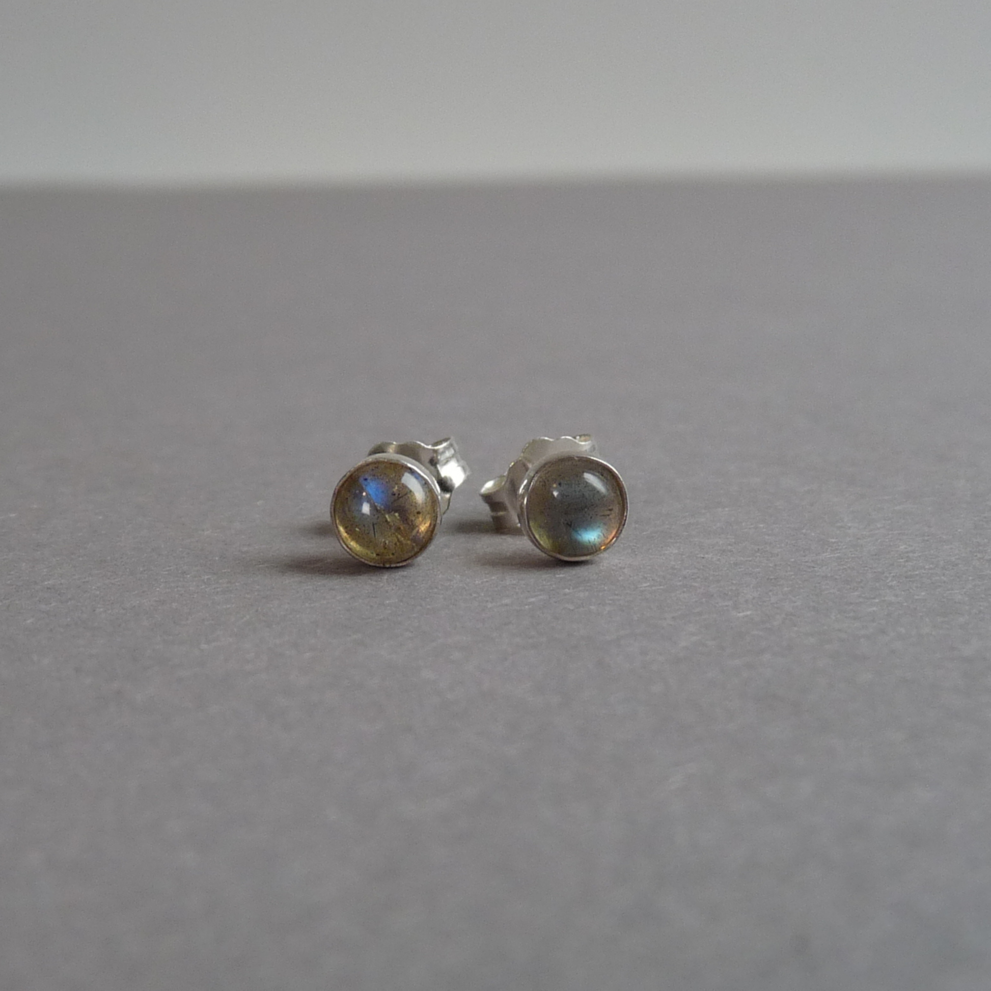 Minimalistische knopjes oorbellen in zilver met 5 mm facet geslepen labradoriet. Subtiele oorstekers met een zachte glans en een karaktervolle, licht mystieke uitstraling.