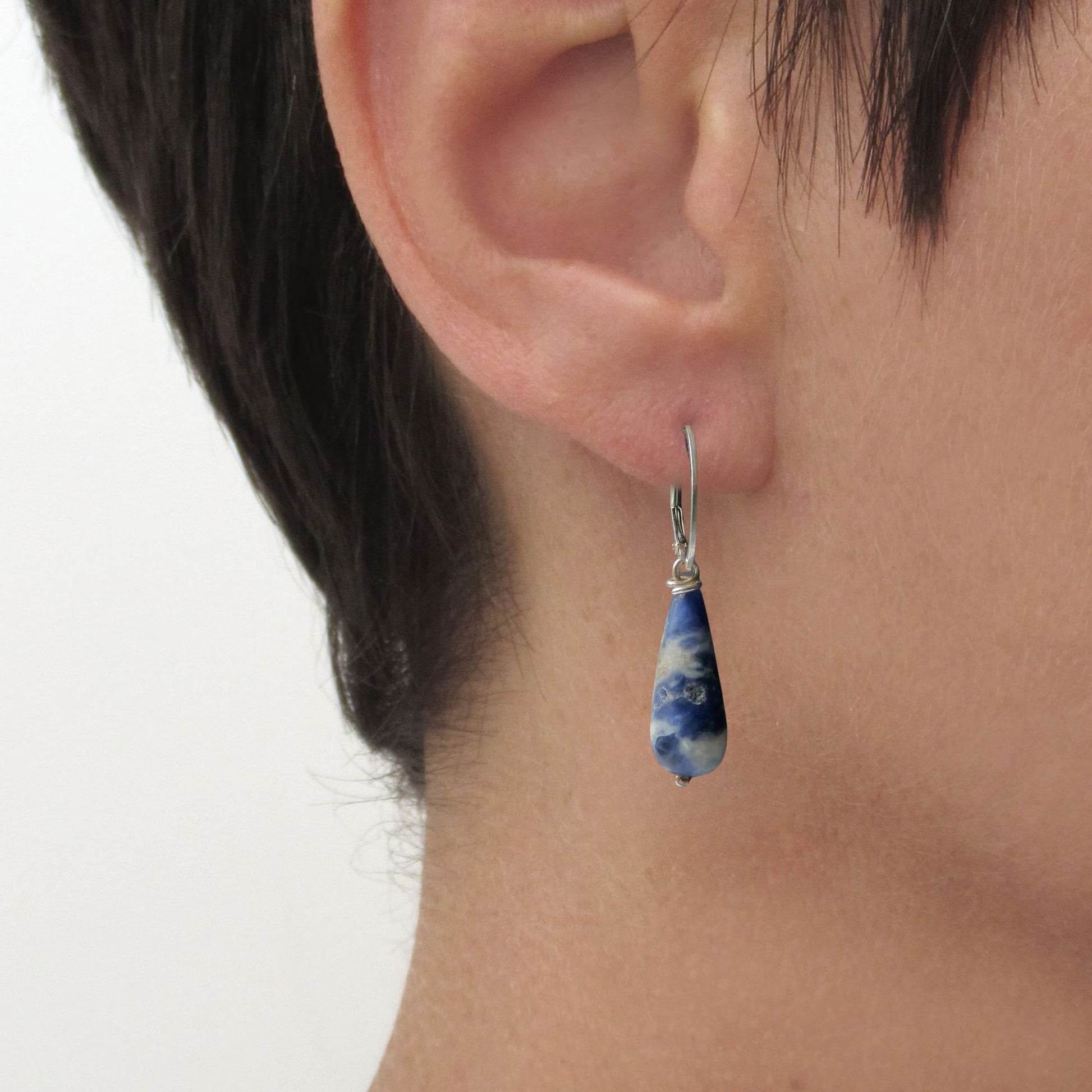 Deze verfijnde lange zilveren oorbellen combineren elegantie met karakter. De 2.2 cm lange Sodaliet druppels tonen een uniek blauw-wit gewolkt patroon – elke steen is als een klein kunstwerkje uit de natuur.