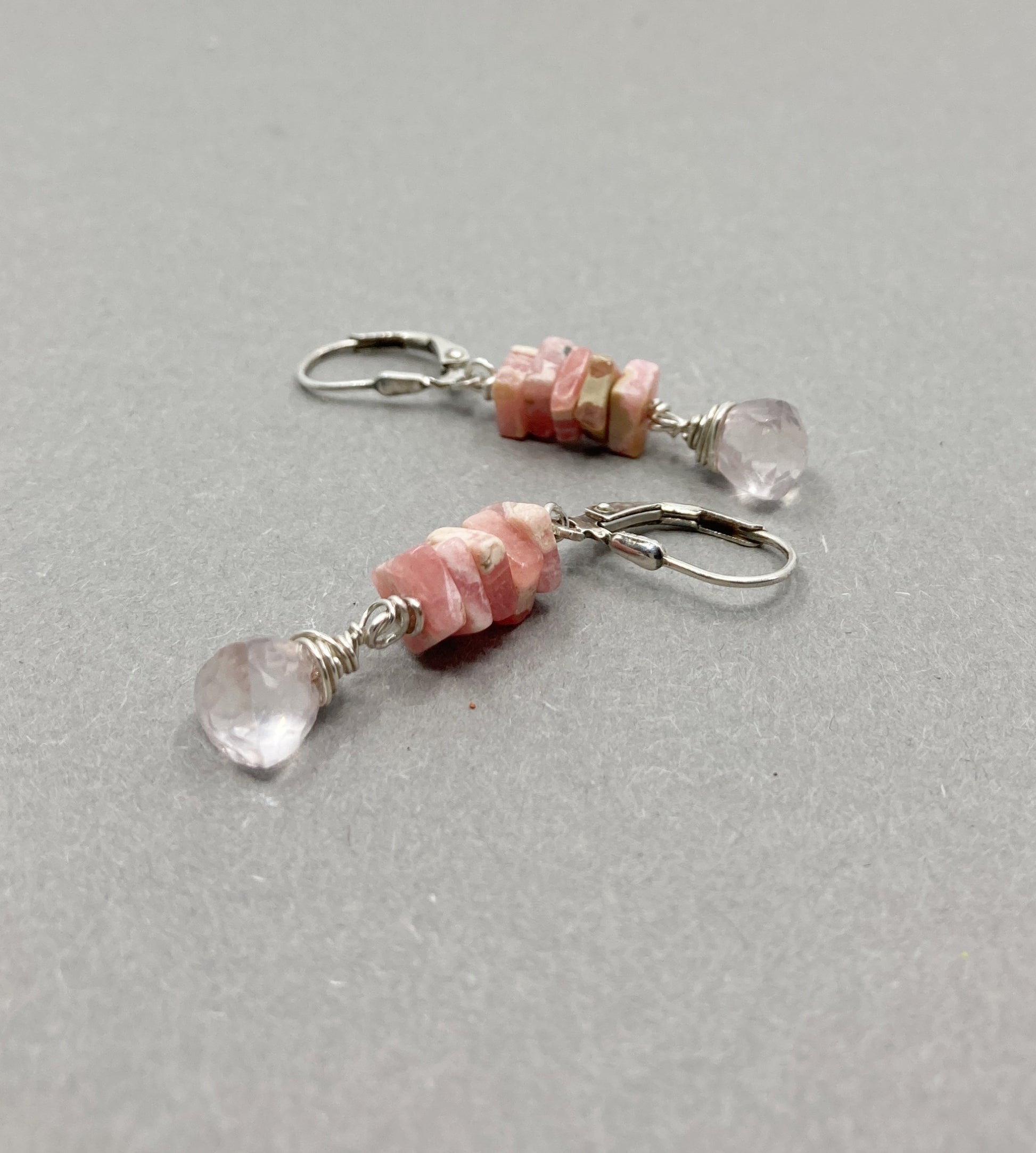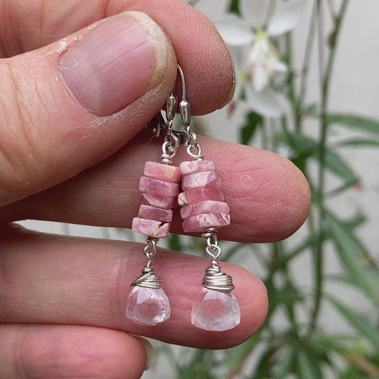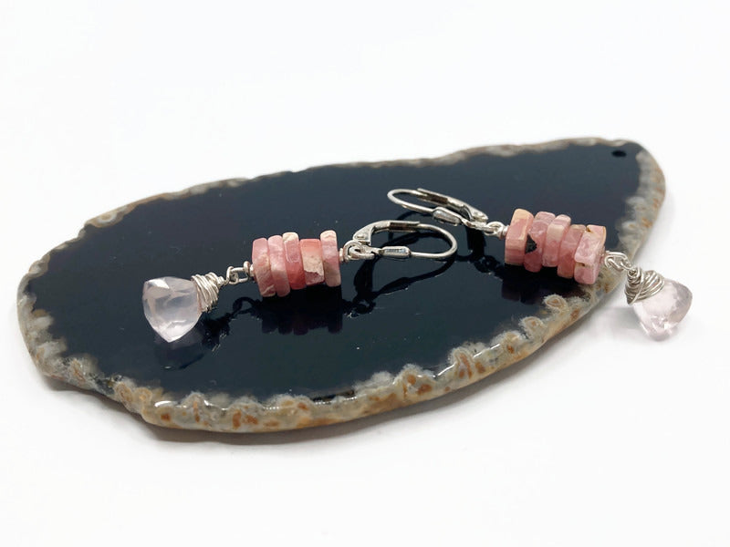 Zilveren oorbellen met rodochrosiet Heishi-kralen en rozenkwartsbrioletten