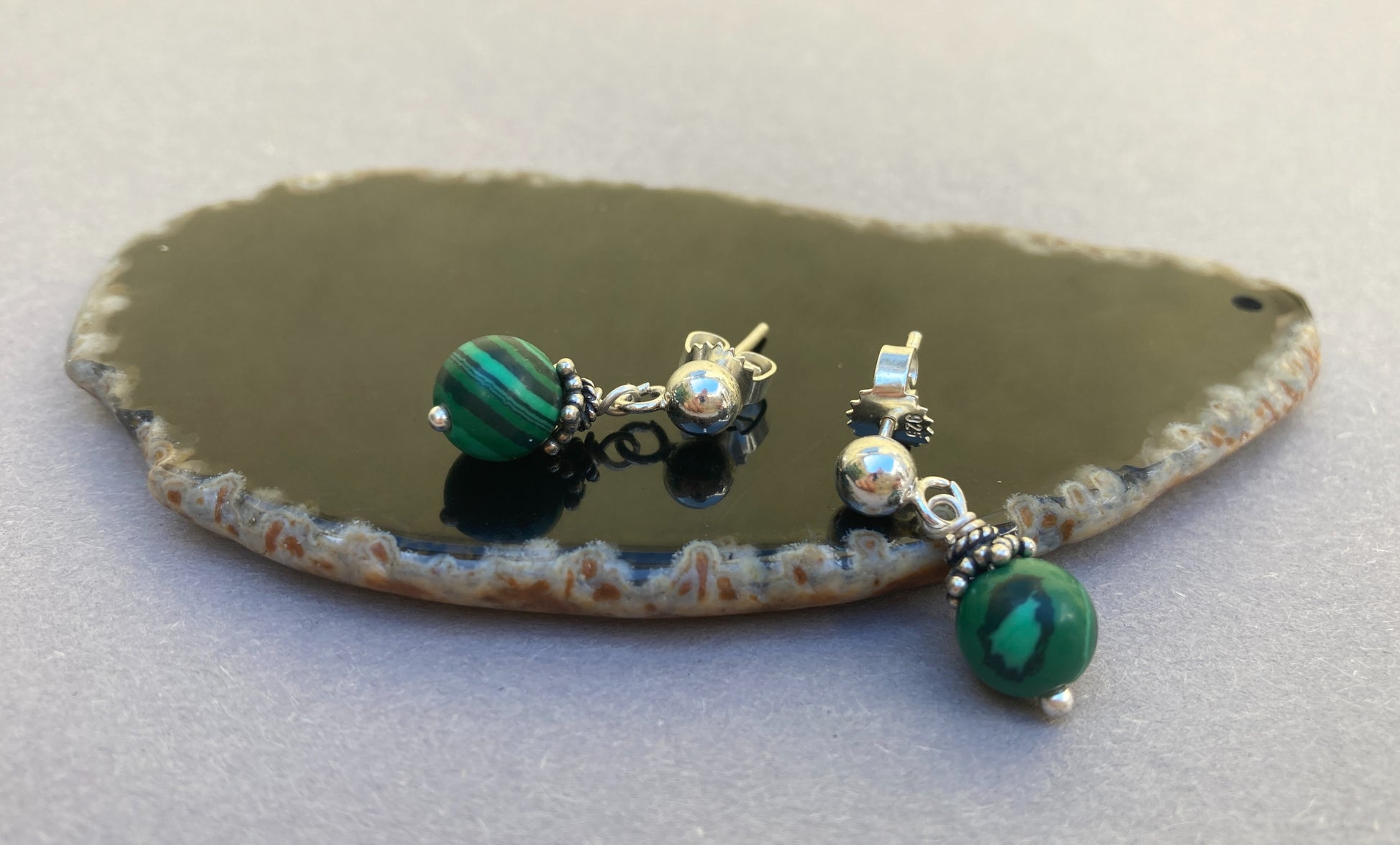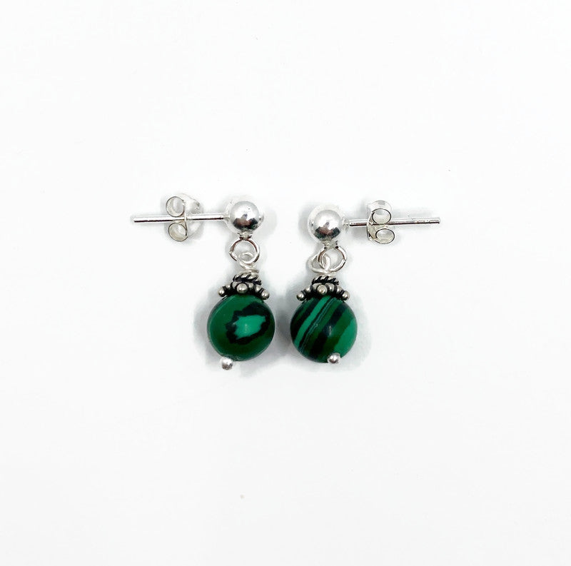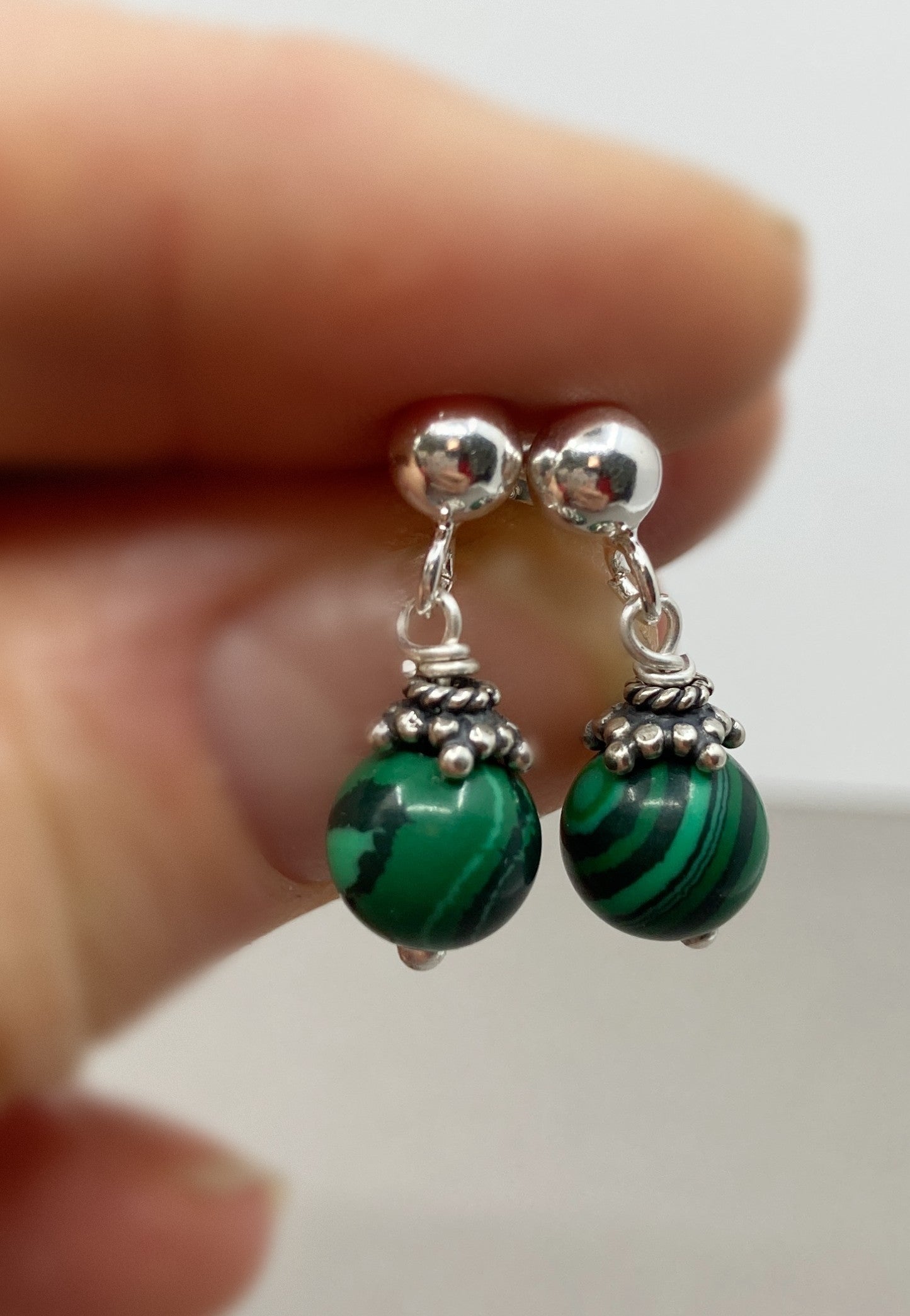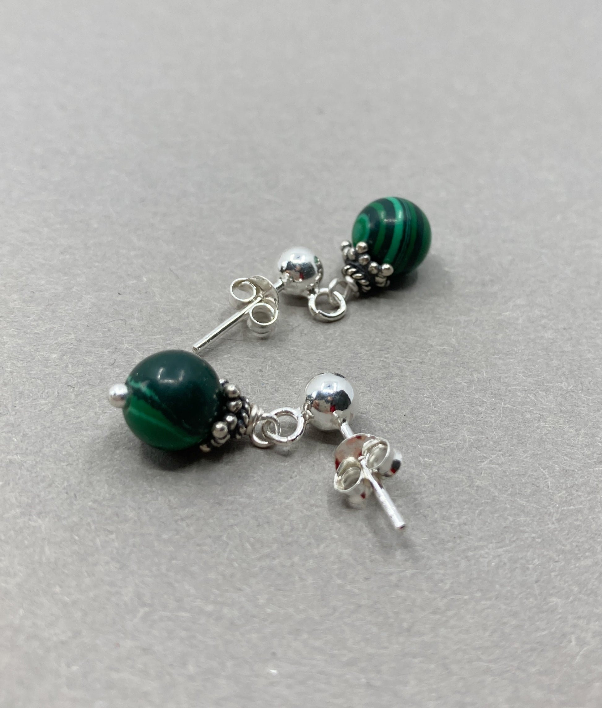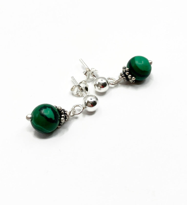 Maar ook zonder ear cuff is dit paar Malachiet oorknopjes een must have. De zilveren oorstekers zijn 5 mm dik en werden voorzien van 6 mm Malachiet kralen die weer versierd werden met Bali zilveren kralen kapjes.