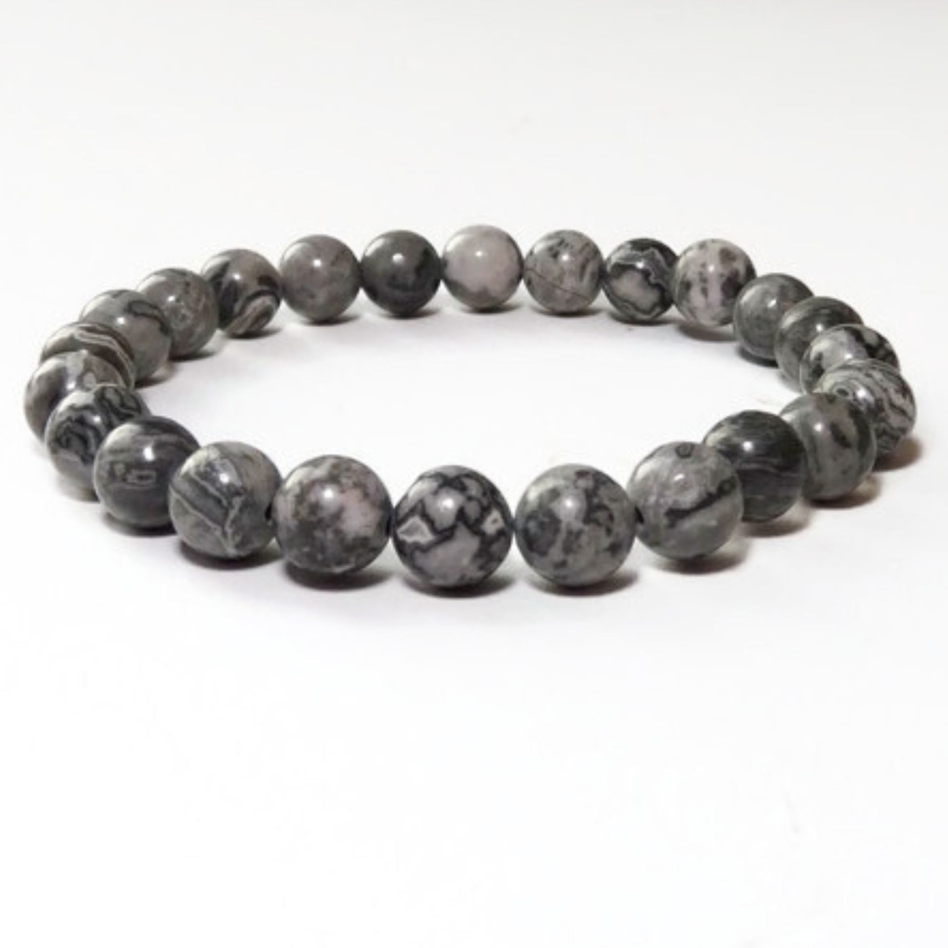 Stoere armband van 8 mm Picasso jaspis kralen. Elke kraal heeft een uniek lijnenspel in grijs- en aardetinten, waardoor geen armband hetzelfde is.