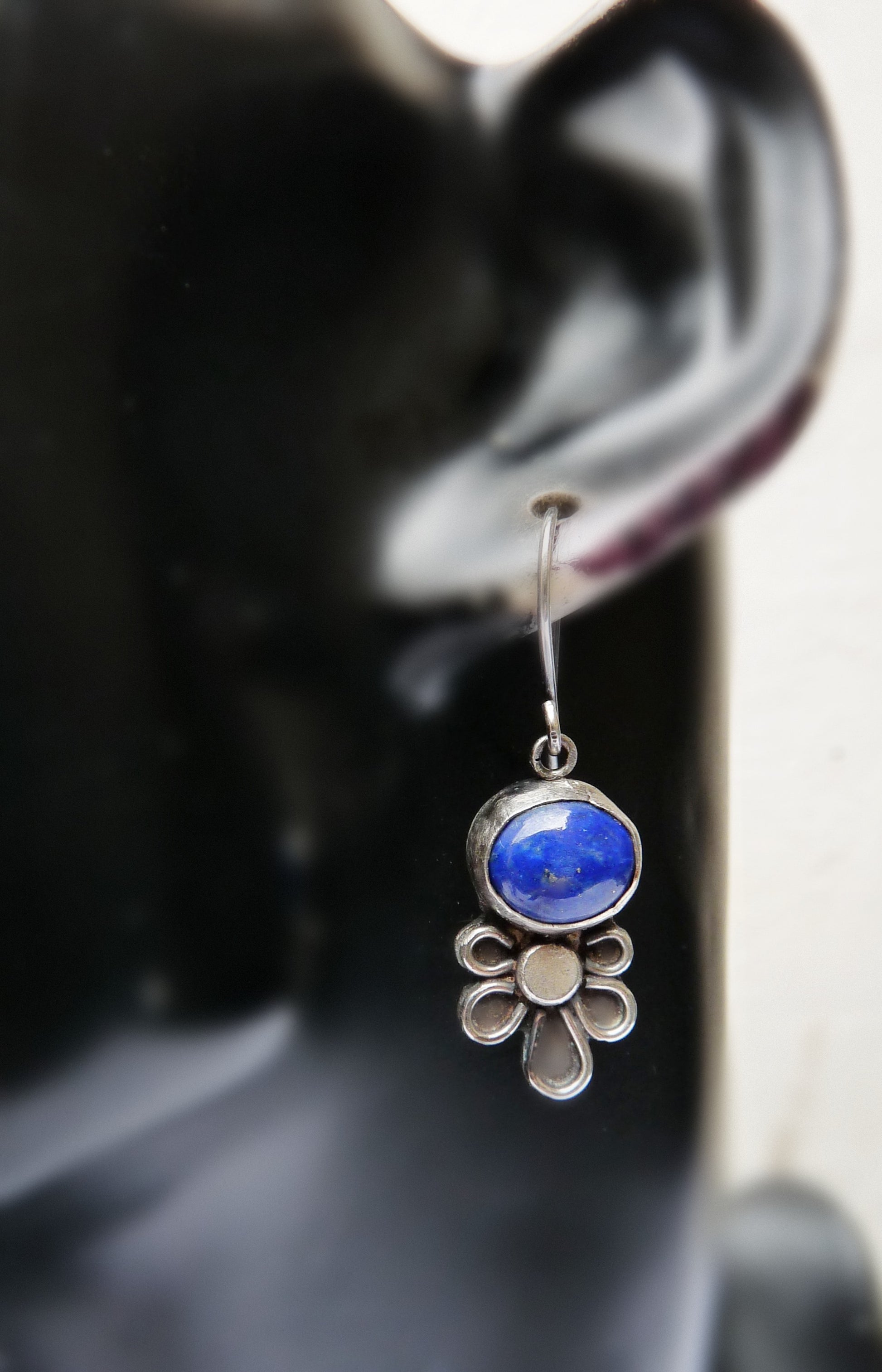 Materiaal: Sterling zilver, Lapis Lazuli edelstenen. Afmetingen: ongeveer 3,5 cm lang (inclusief oorhaken)